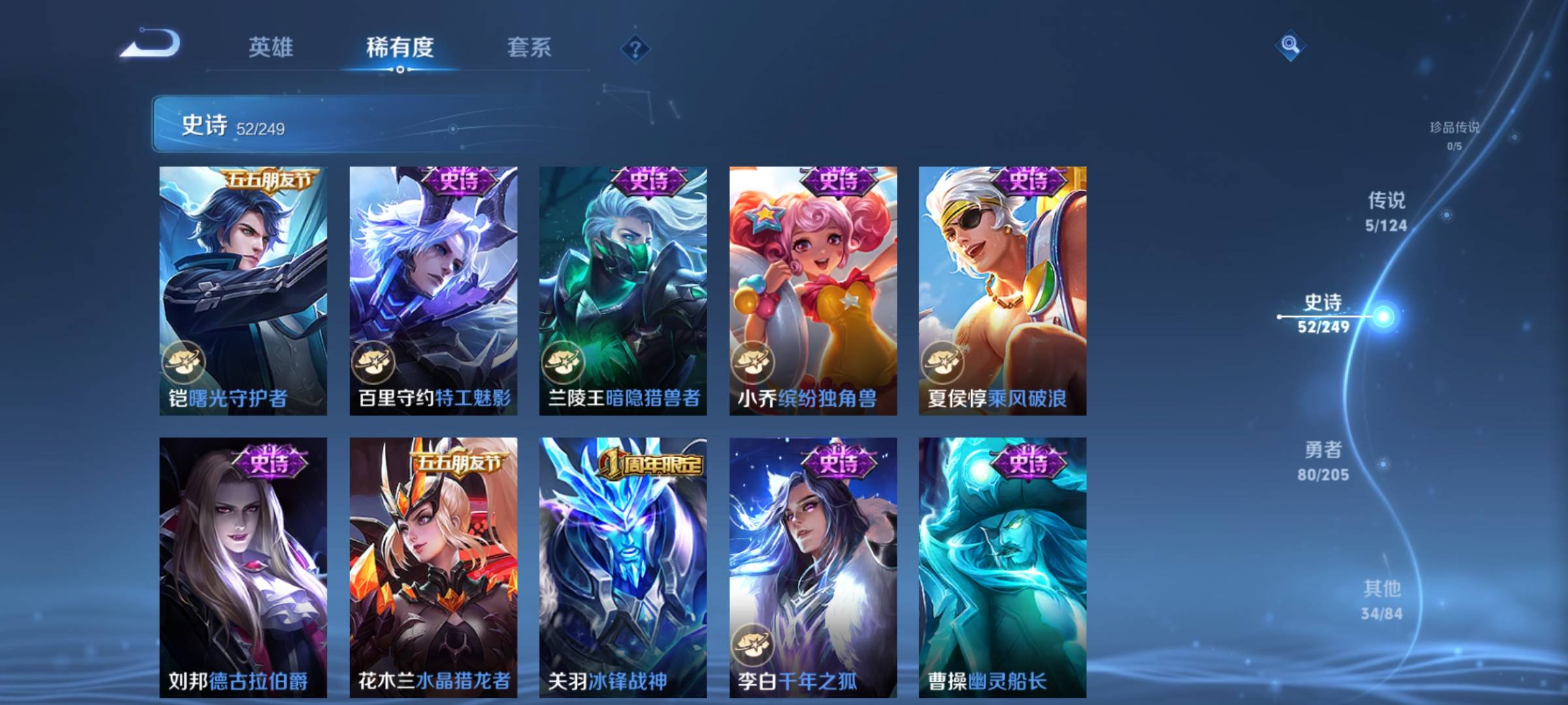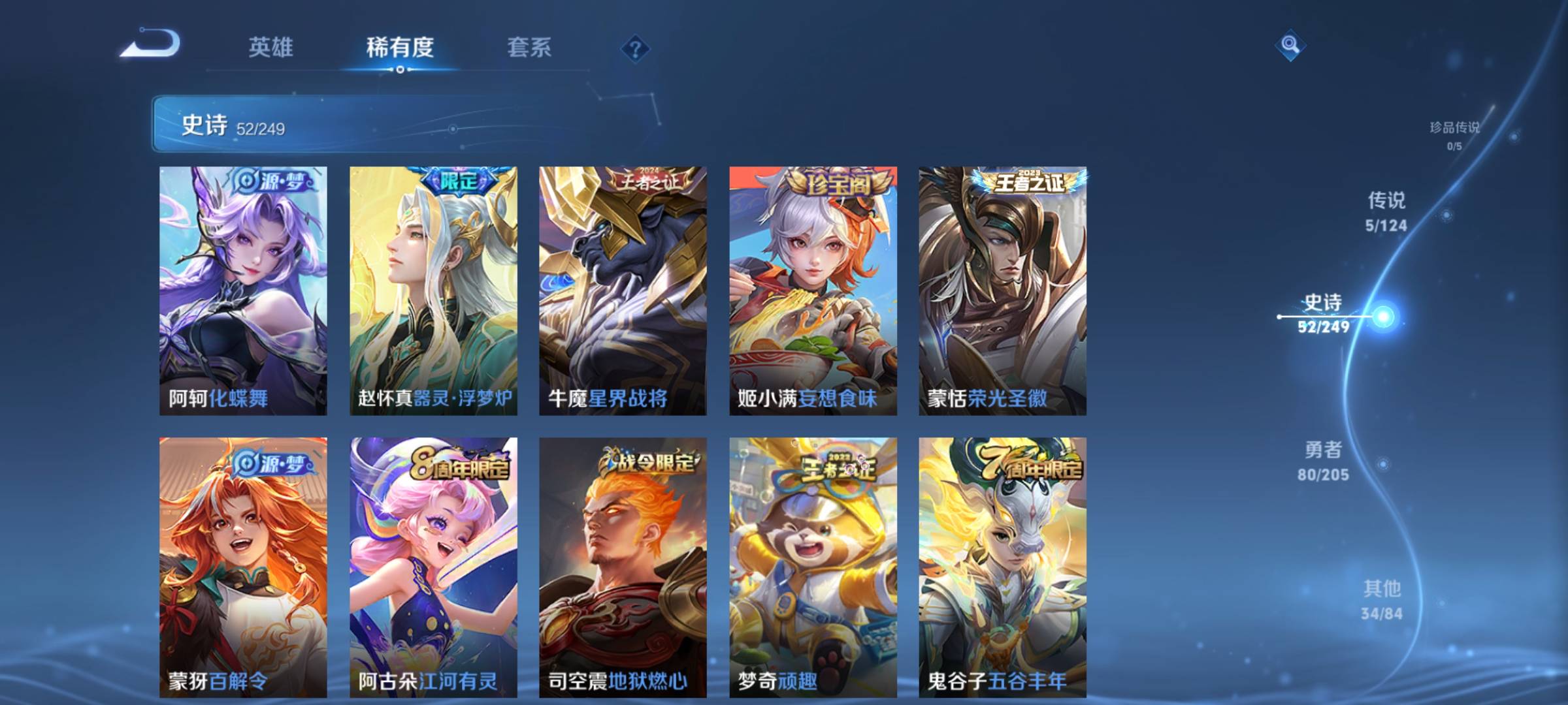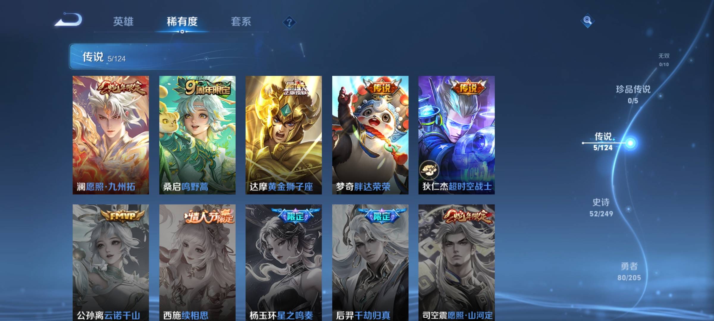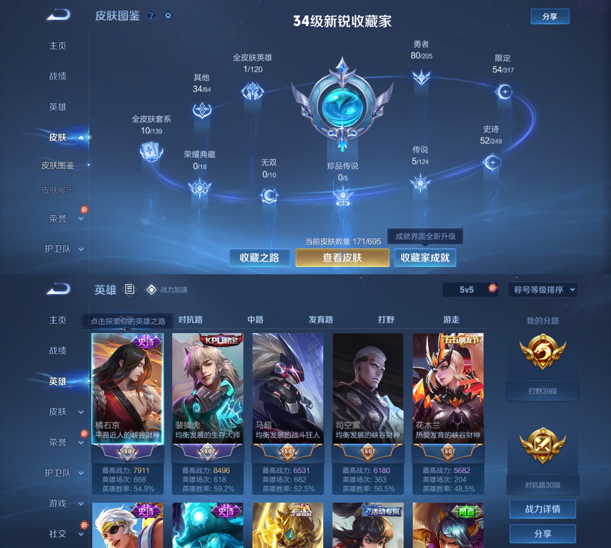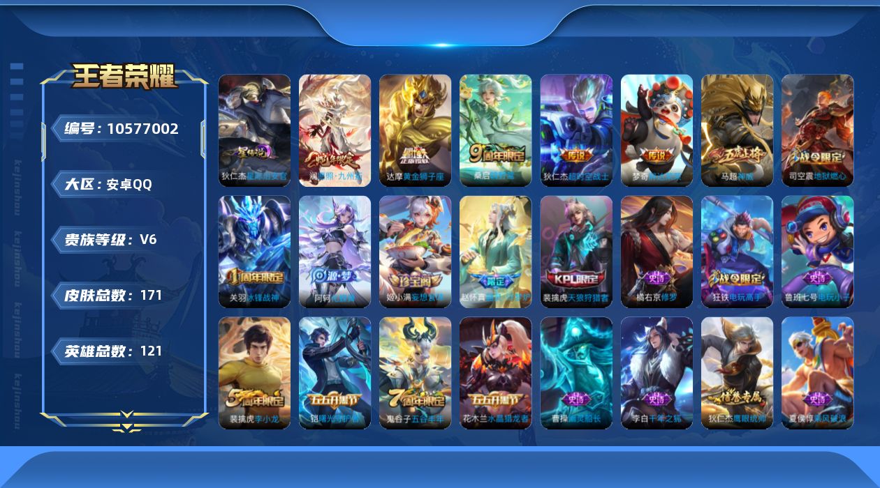 贵族等级:v6皮肤数:171传说品质5 生肖限定1 英雄数:121