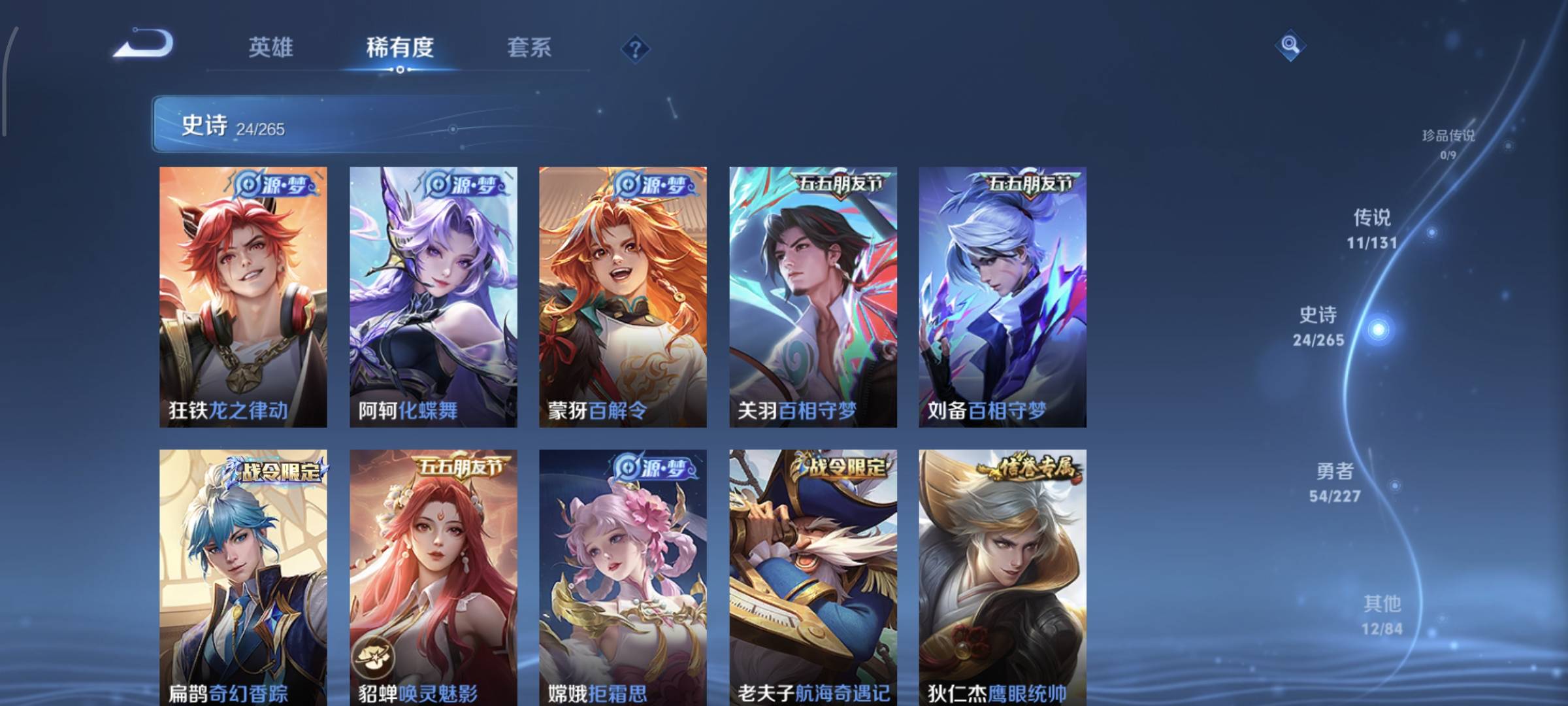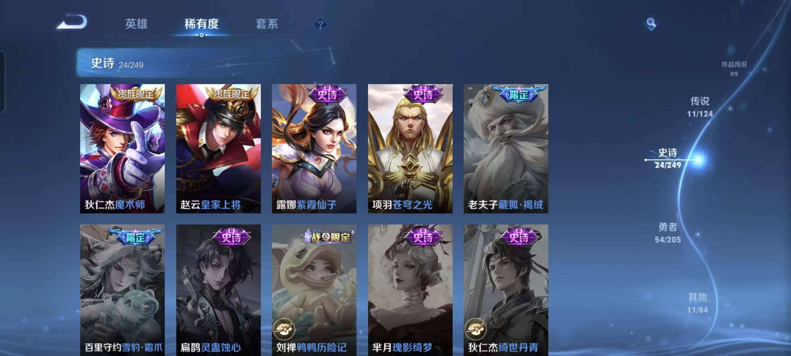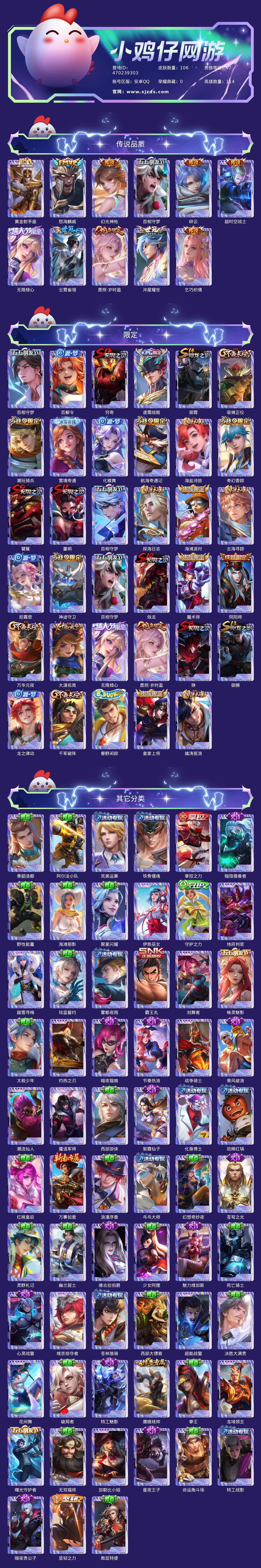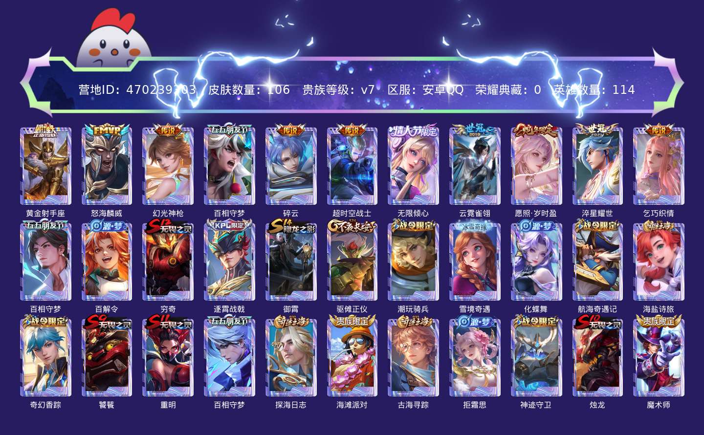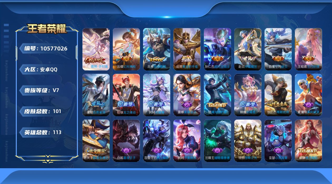 贵族等级:v7皮肤数:106传说品质11 情人节限定1 生肖限定1 英雄数:114
