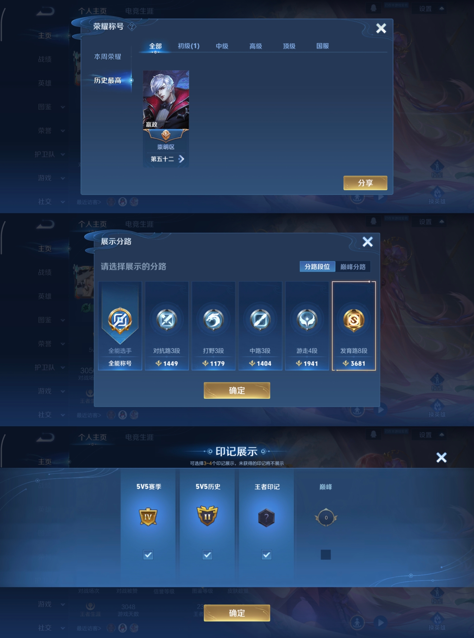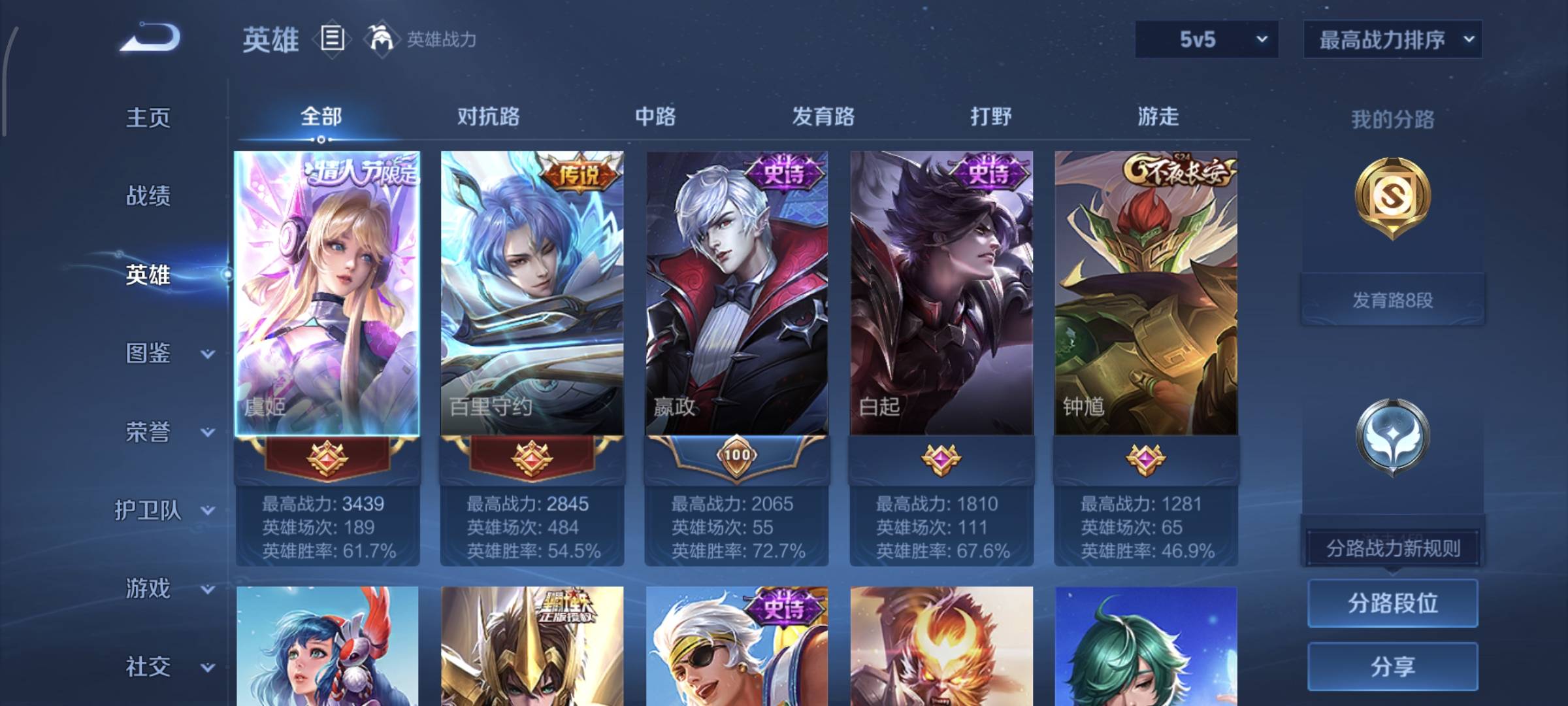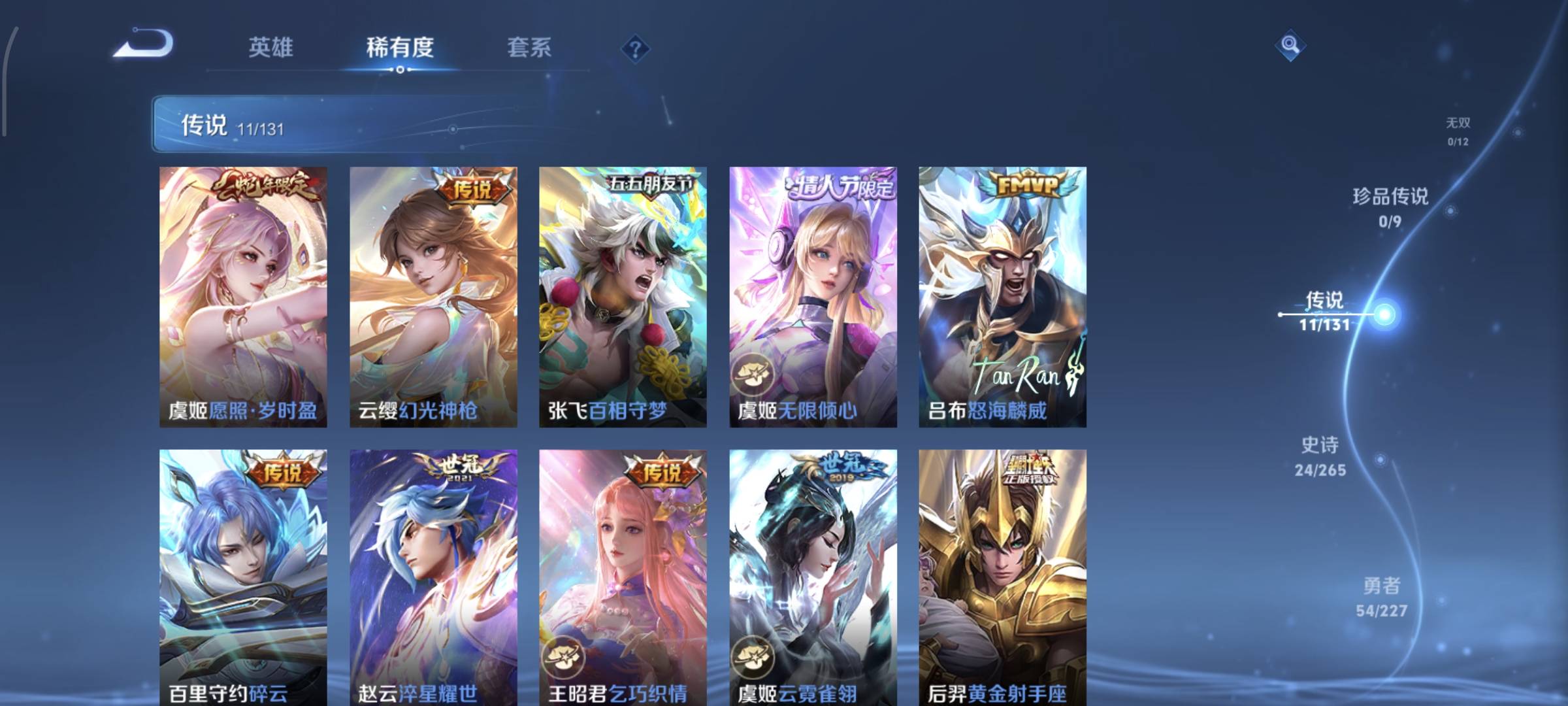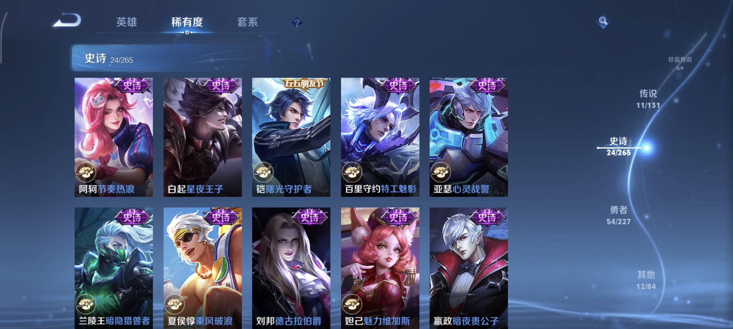 贵族等级:v7皮肤数:106传说品质11 情人节限定1 生肖限定1 英雄数:114