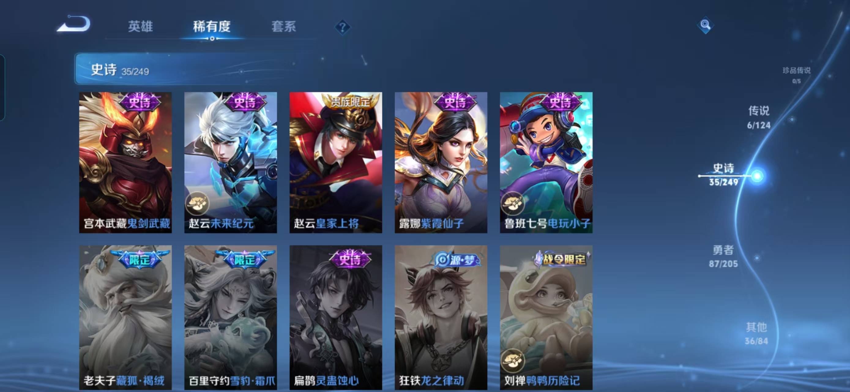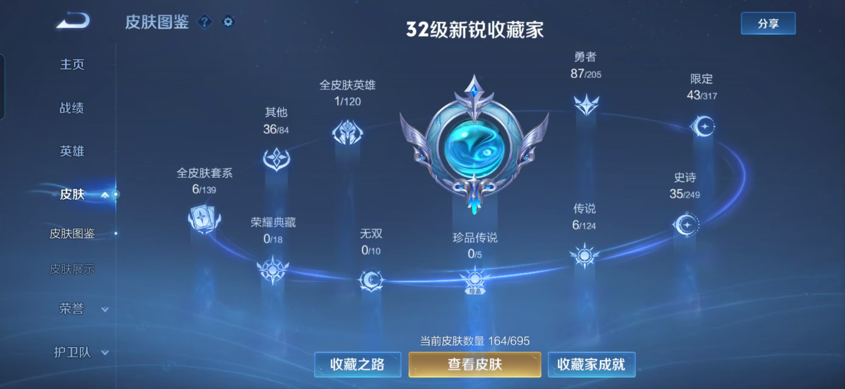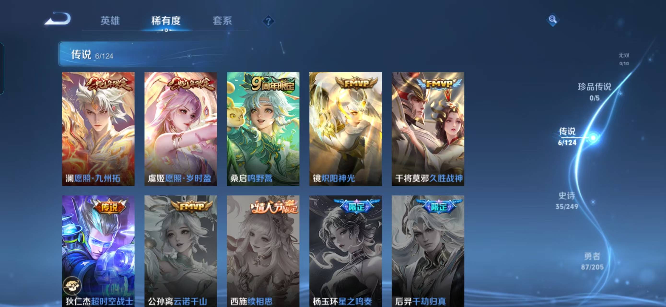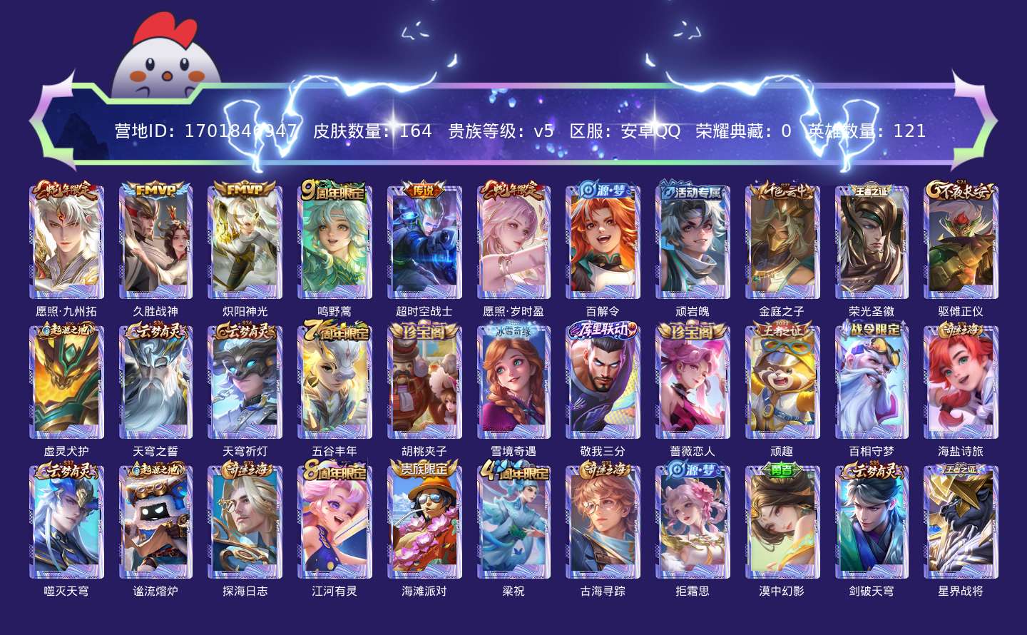 贵族等级:v5皮肤数:164传说品质6 生肖限定2 英雄数:121