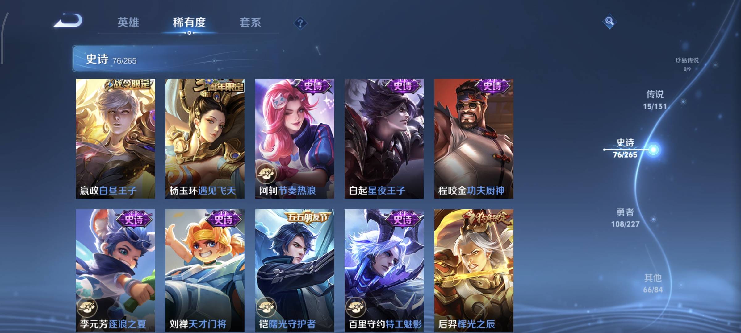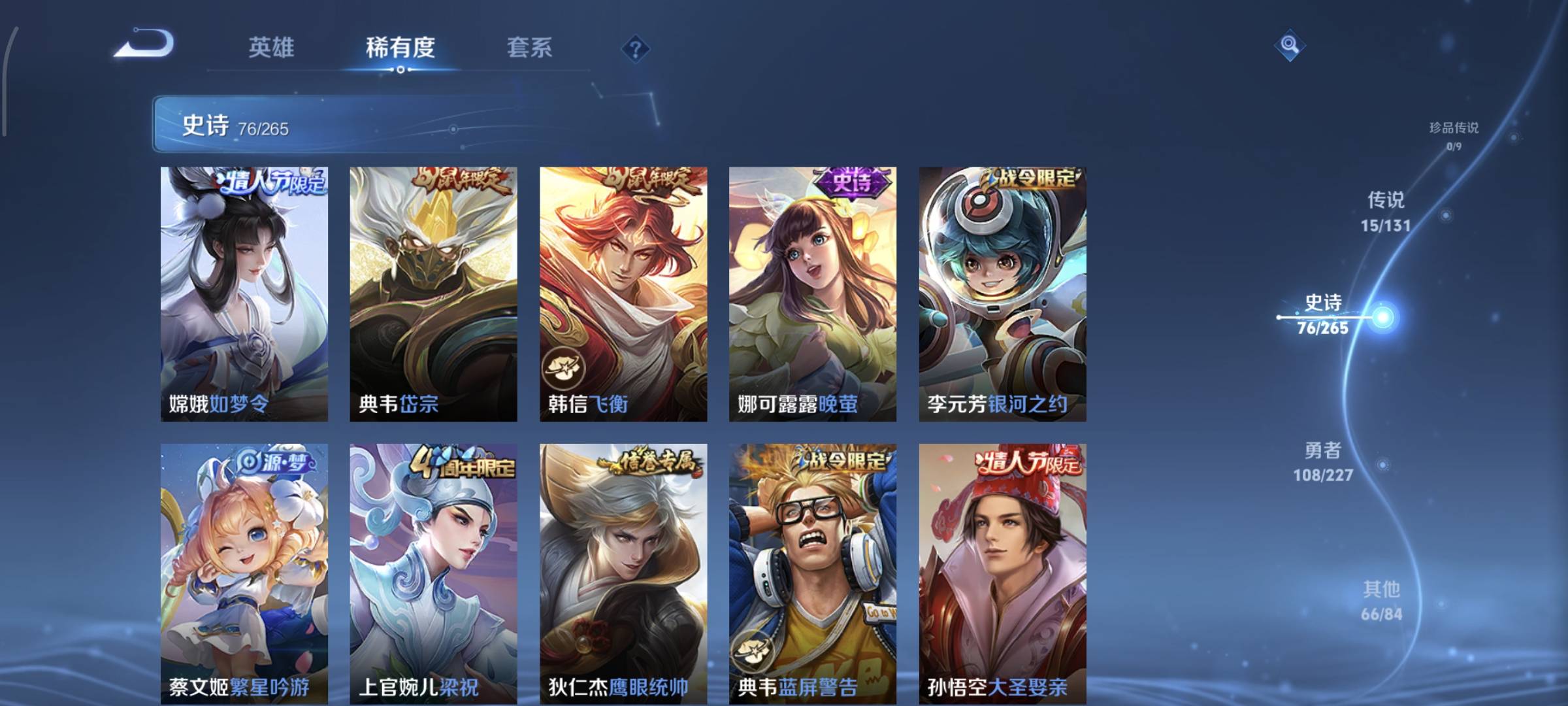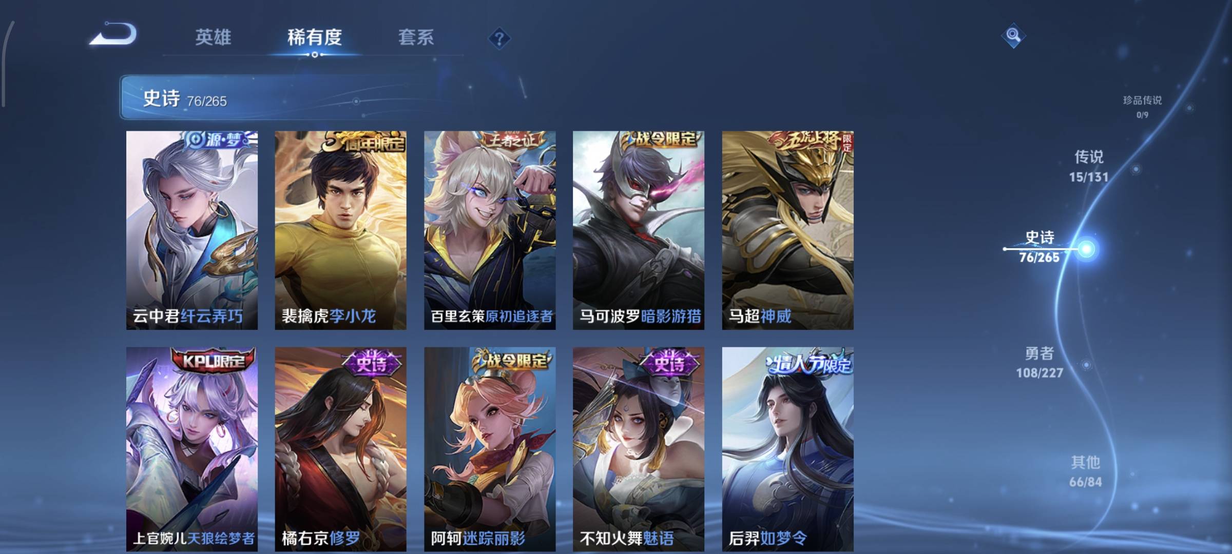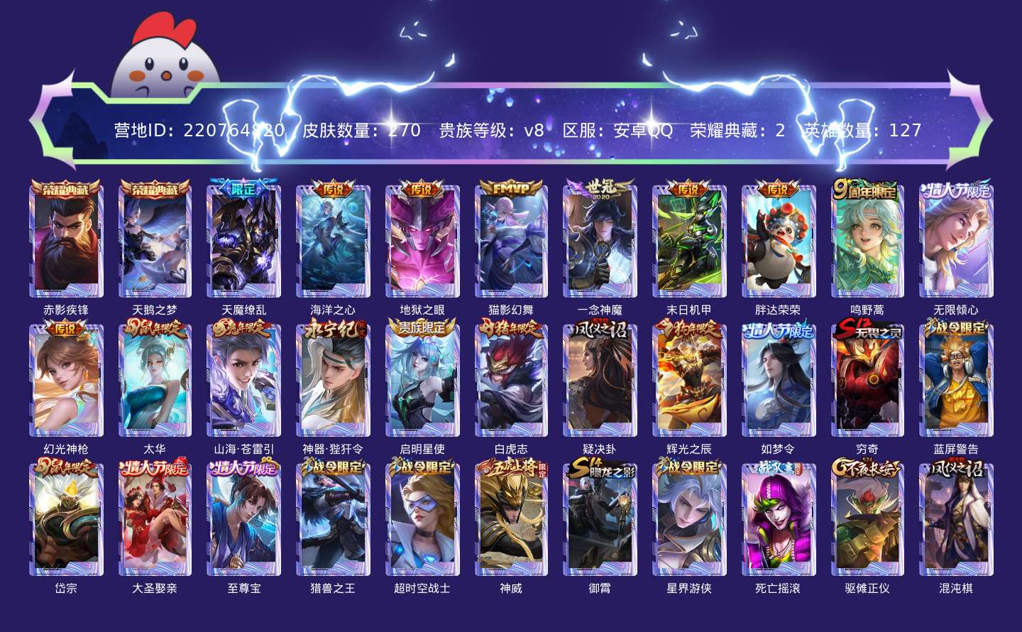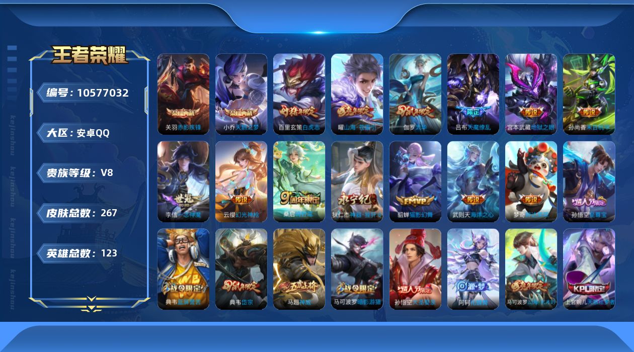 贵族等级:v8皮肤数:270生肖限定7 情人节限定5 荣耀典藏2 传说品质15 英雄数:127