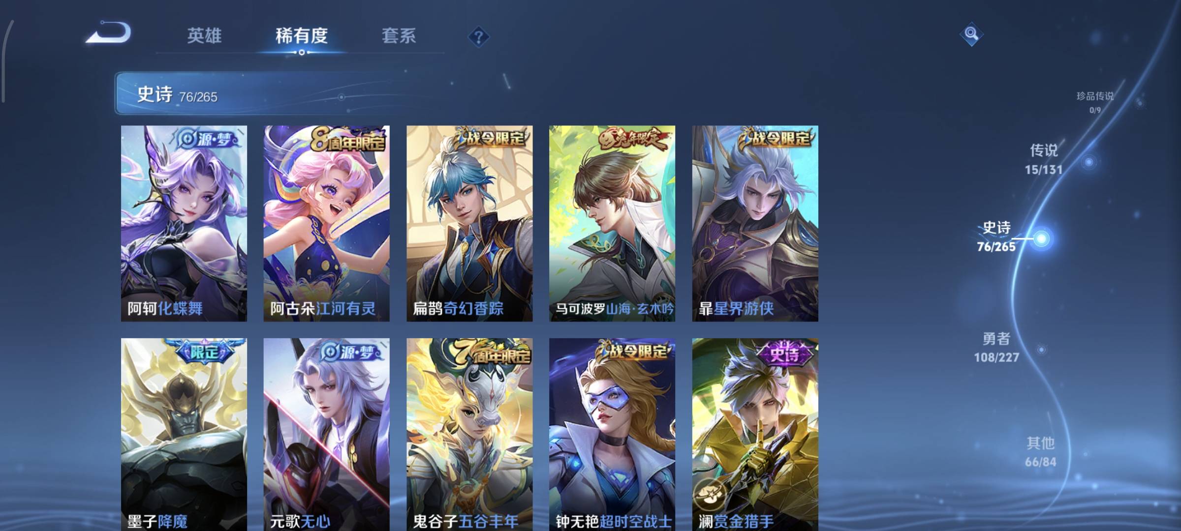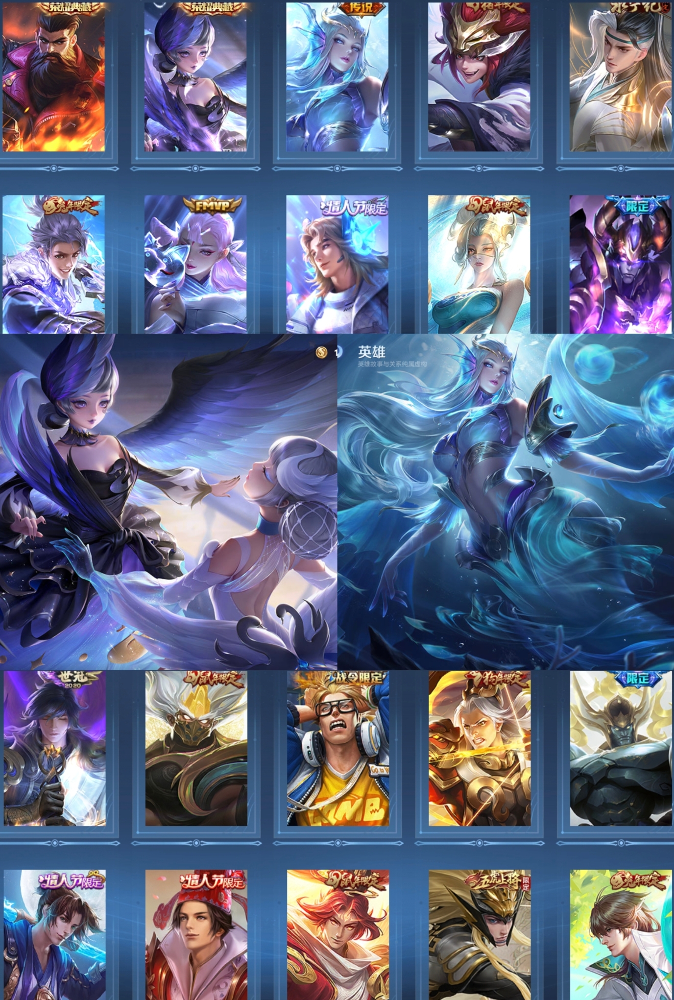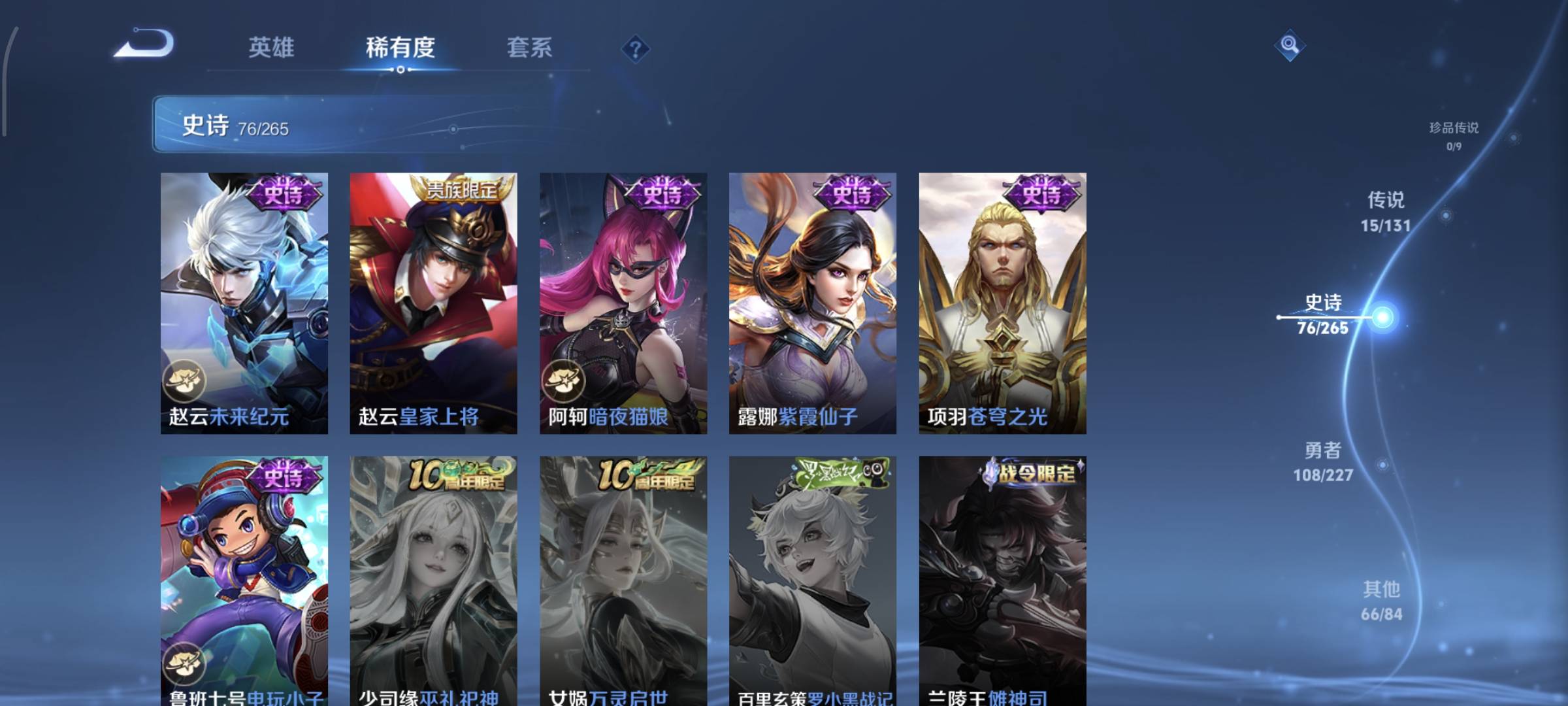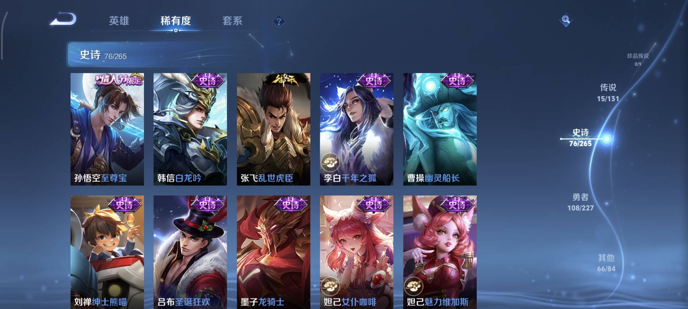 贵族等级:v8皮肤数:270生肖限定7 情人节限定5 荣耀典藏2 传说品质15 英雄数:127