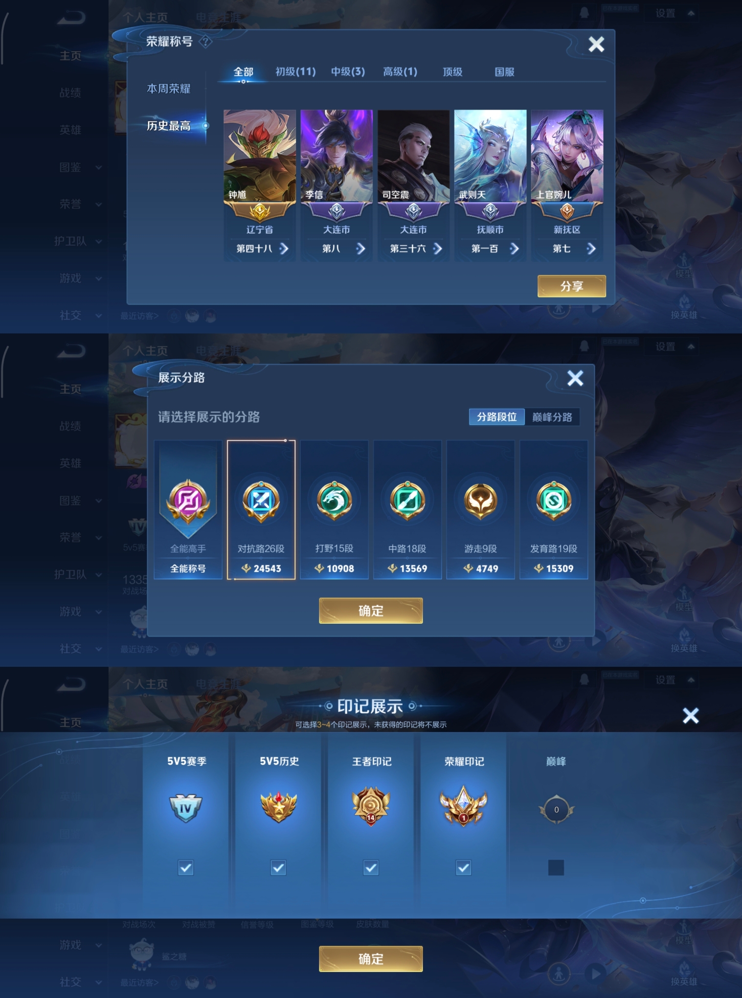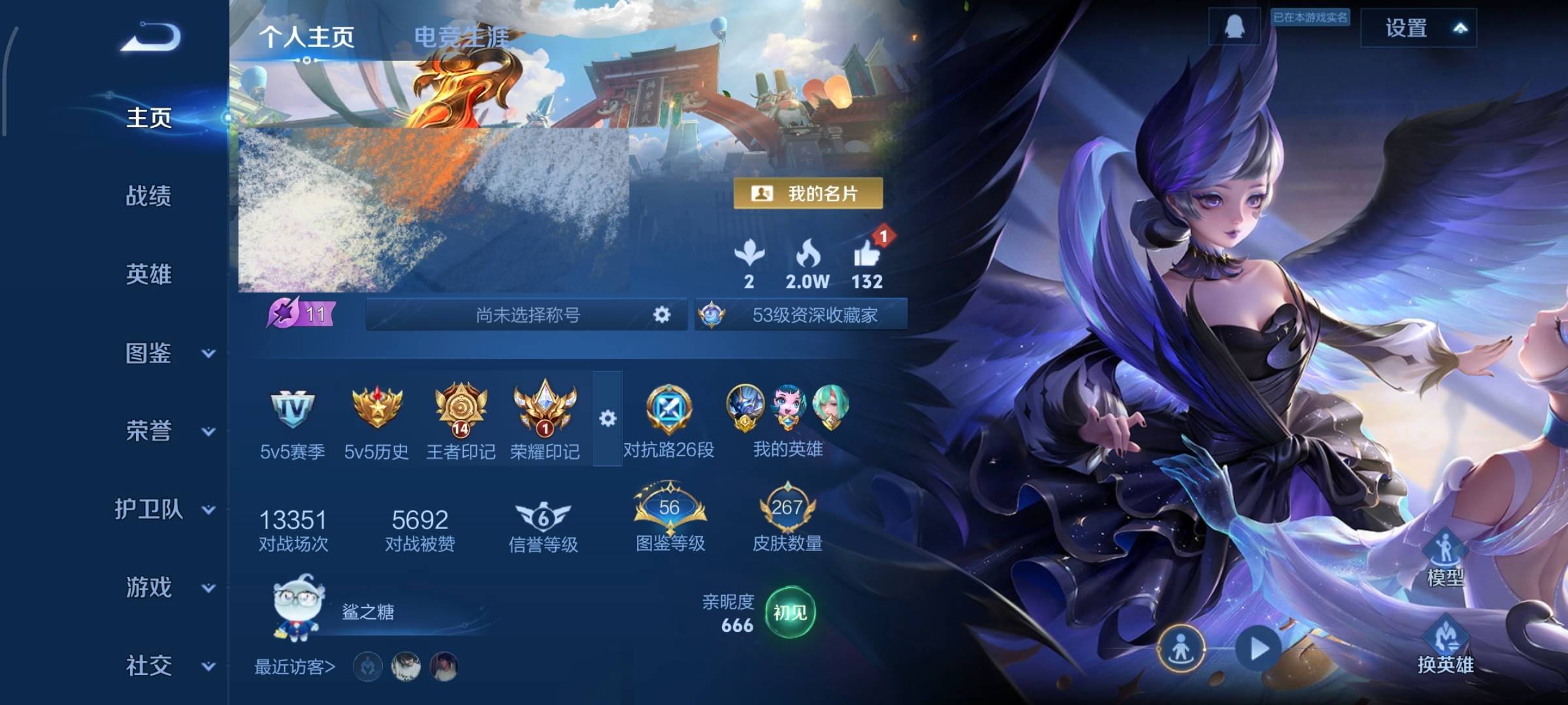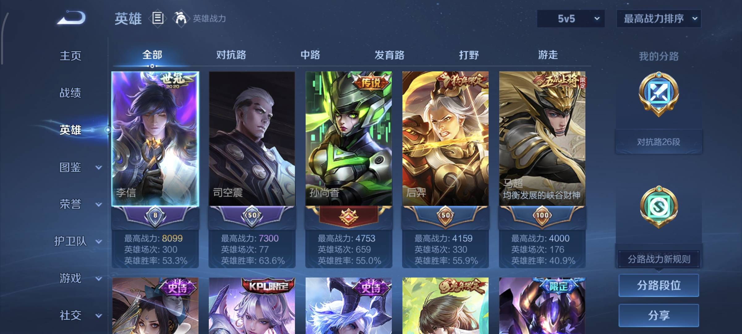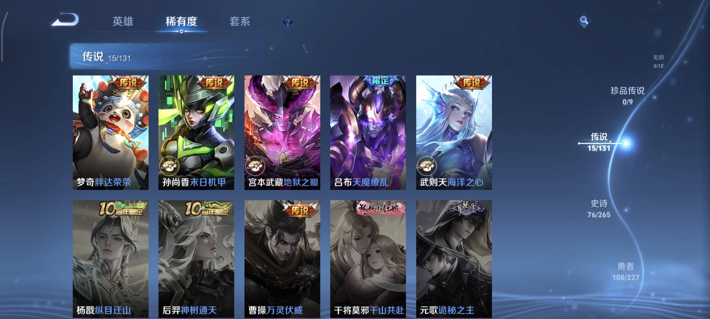 贵族等级:v8皮肤数:270生肖限定7 情人节限定5 荣耀典藏2 传说品质15 英雄数:127