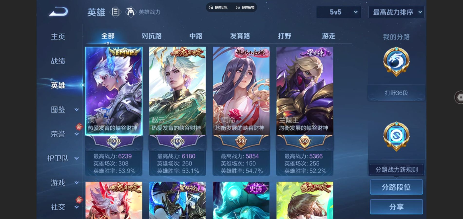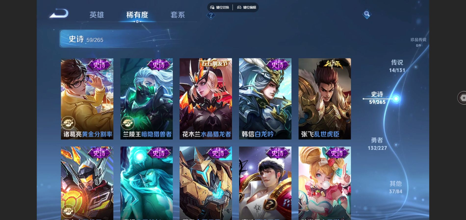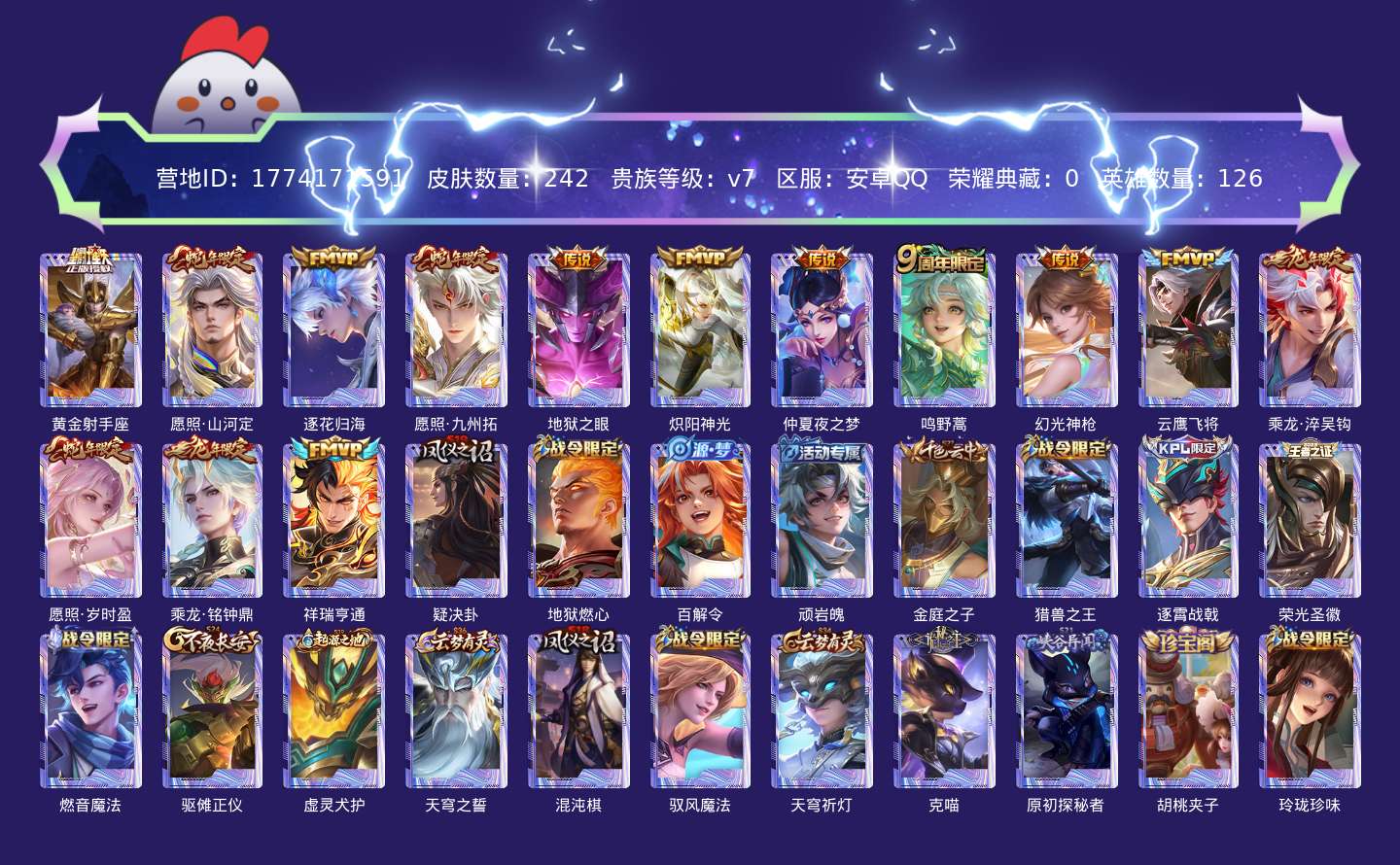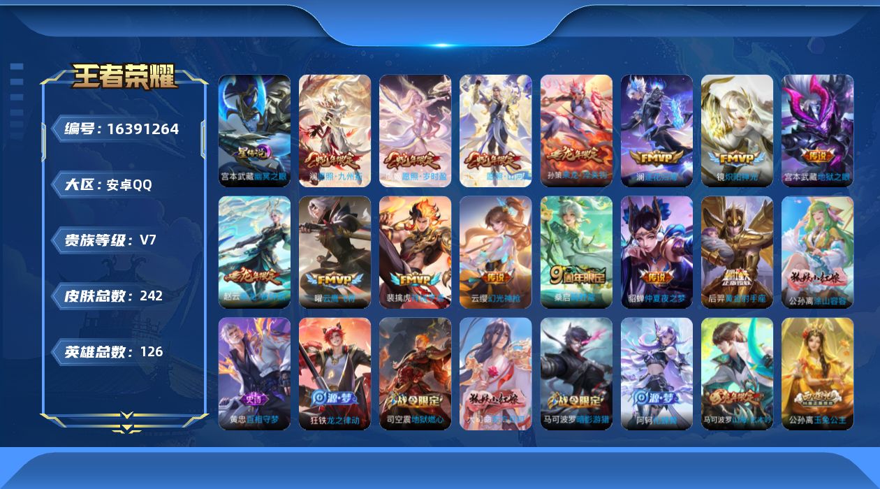 贵族等级:v7皮肤数:242传说品质14 生肖限定6 英雄数:126