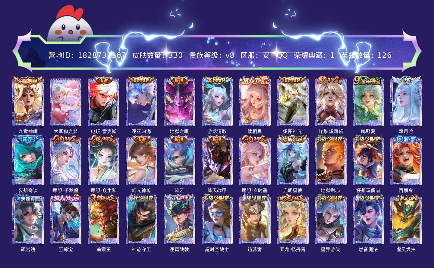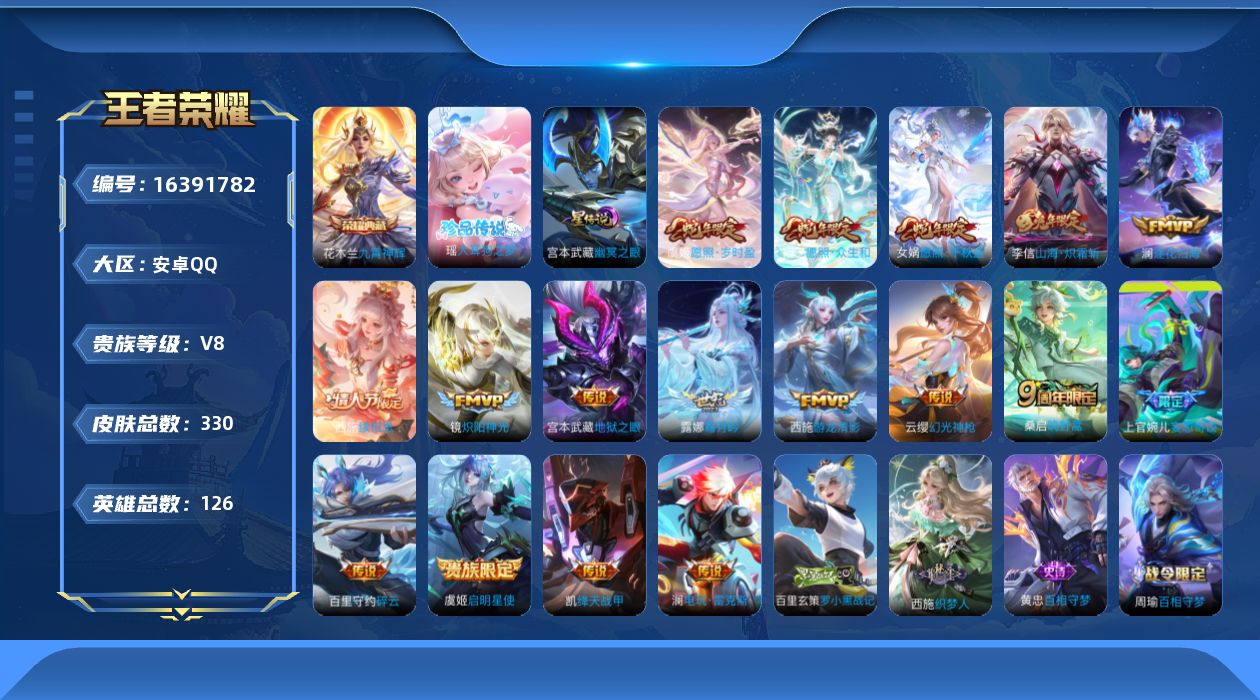 贵族等级:v8皮肤数:330传说品质17 情人节限定2 生肖限定6 荣耀典藏1 珍品传说1 英雄数:126