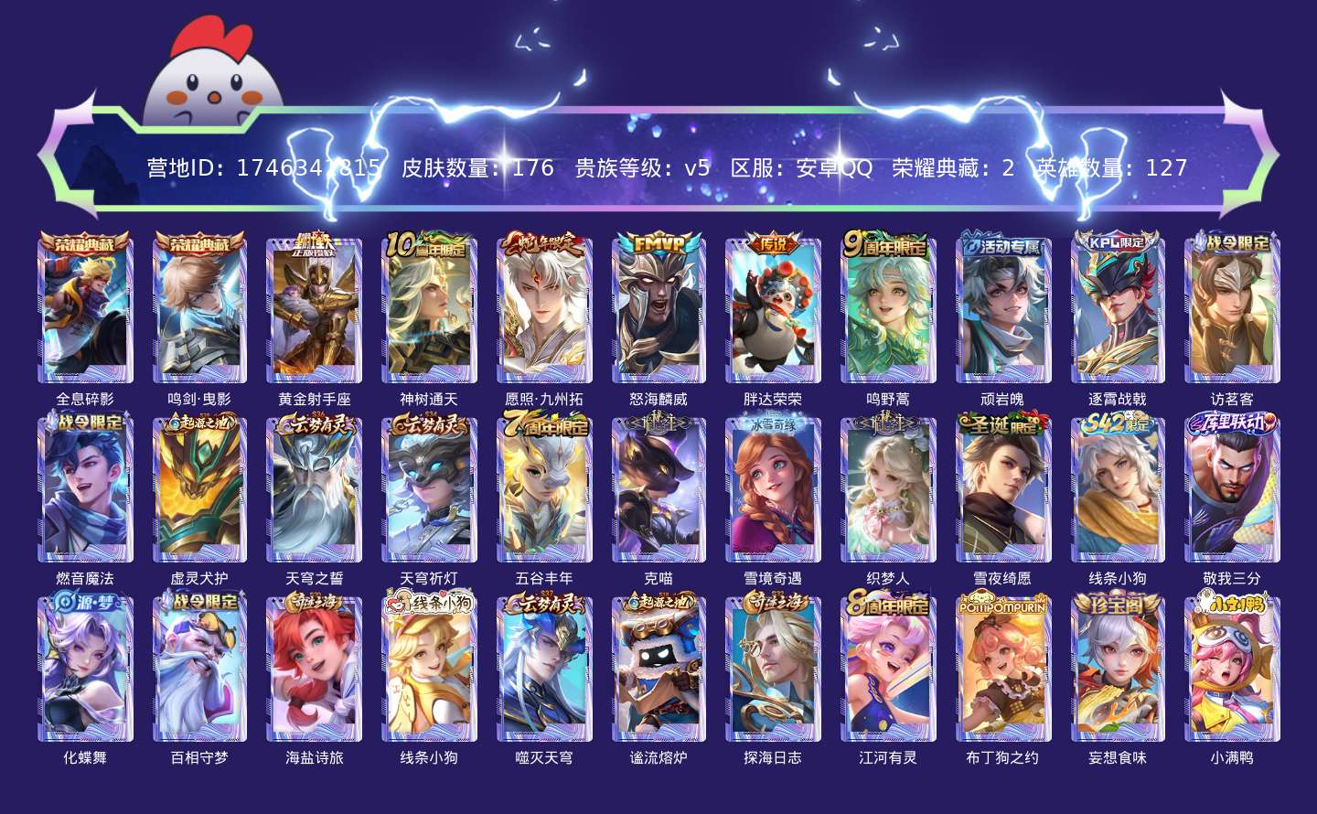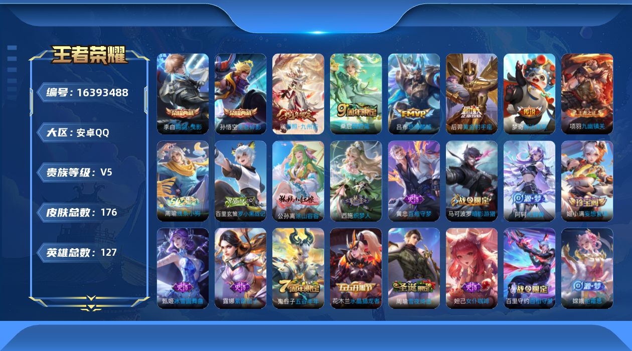 贵族等级:v5皮肤数:176传说品质6 生肖限定1 荣耀典藏2 英雄数:127