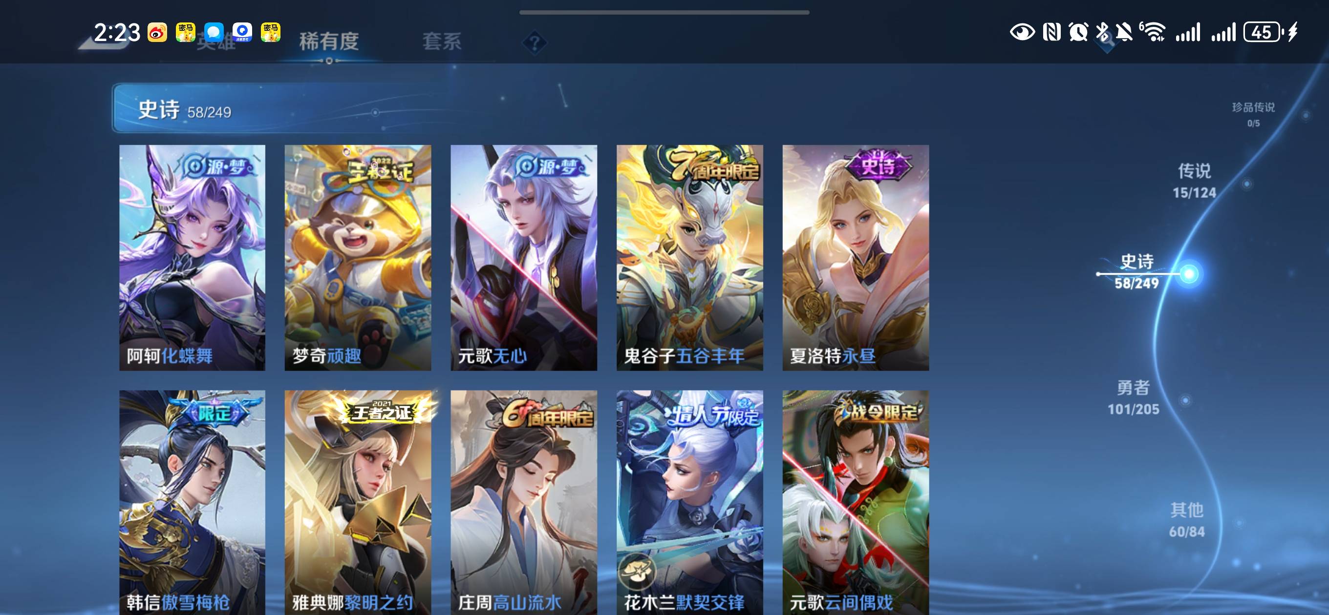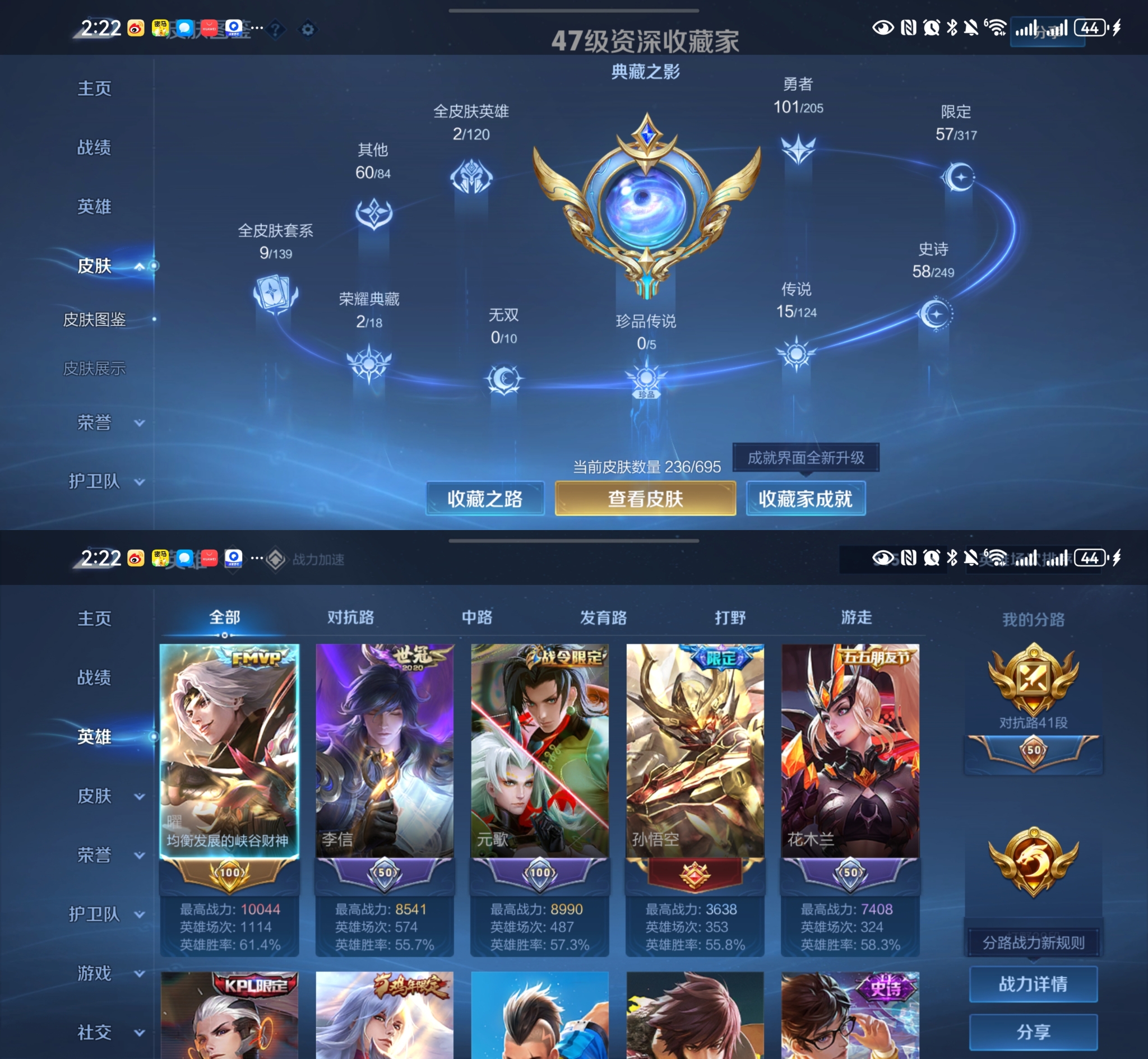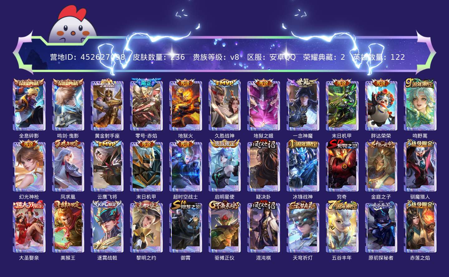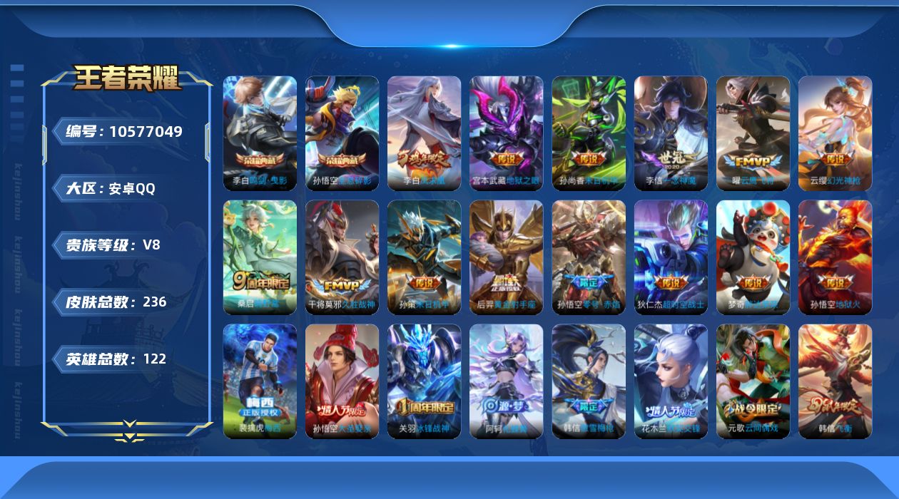 贵族等级:v8皮肤数:236传说品质15 情人节限定2 荣耀典藏2 生肖限定3 英雄数:122