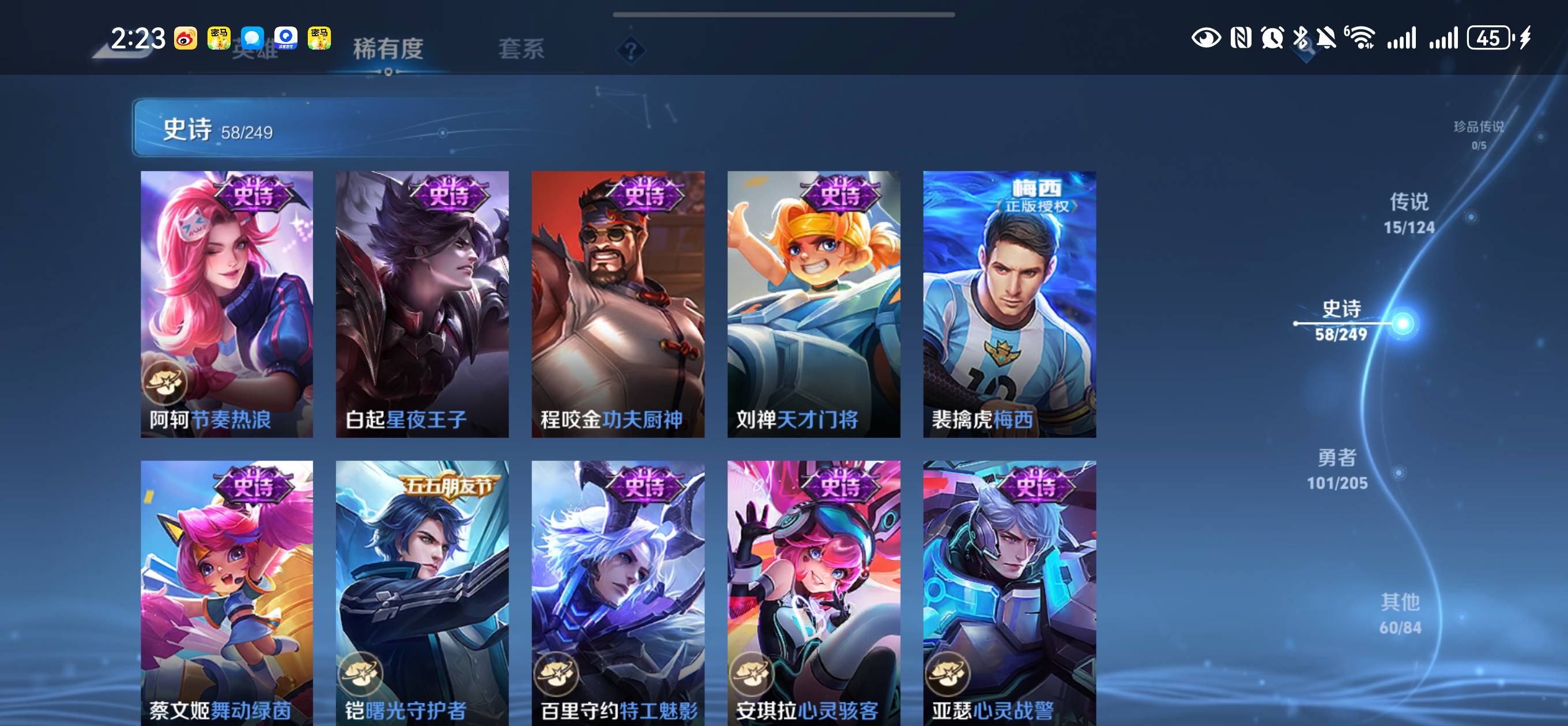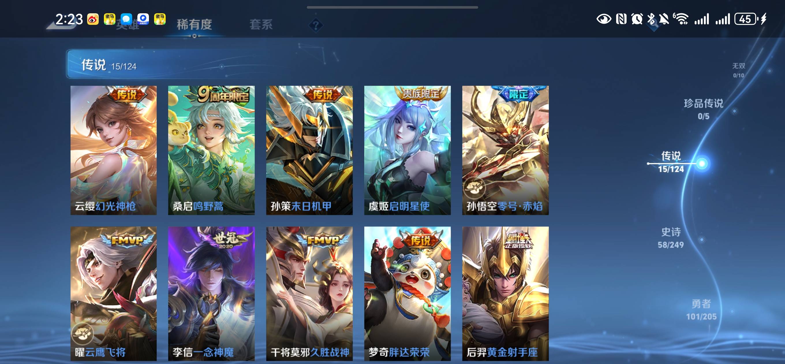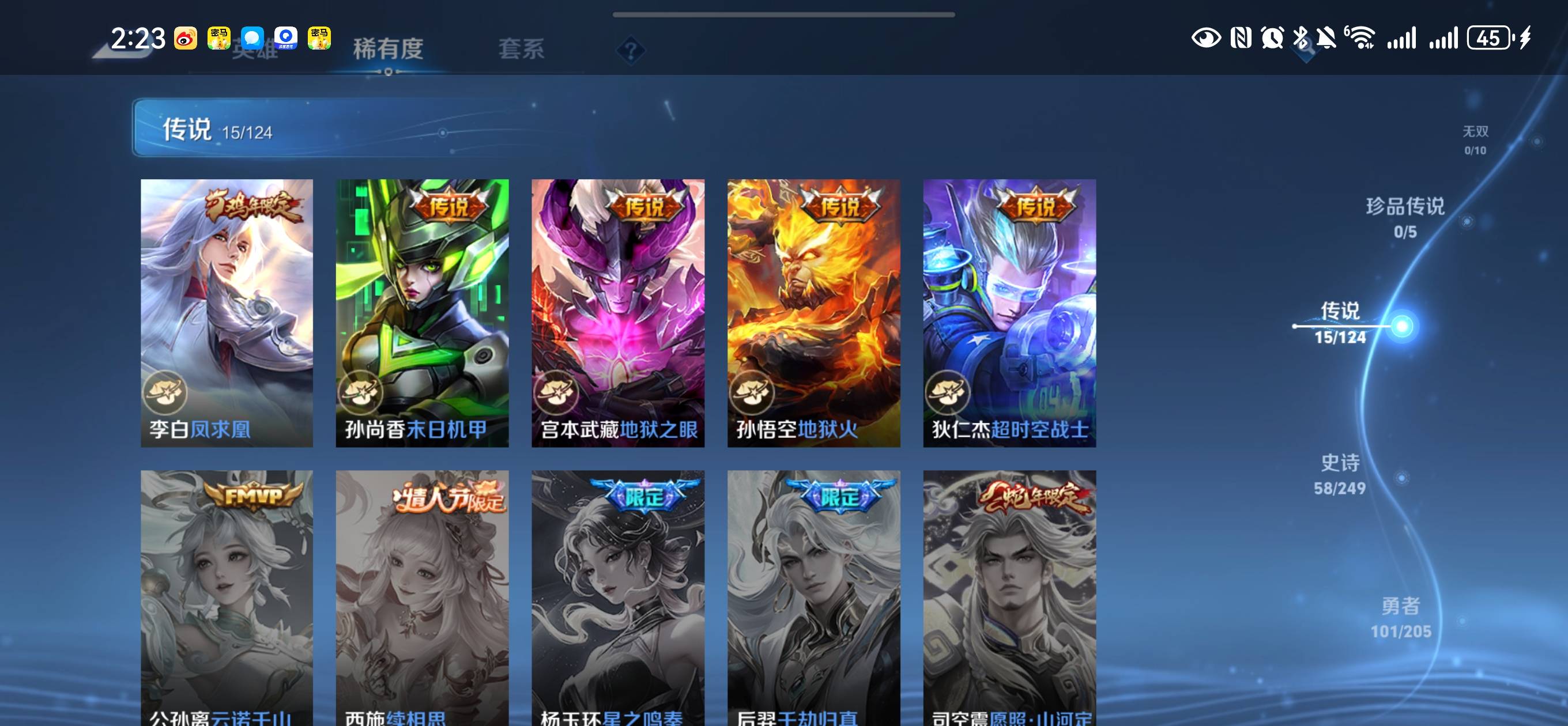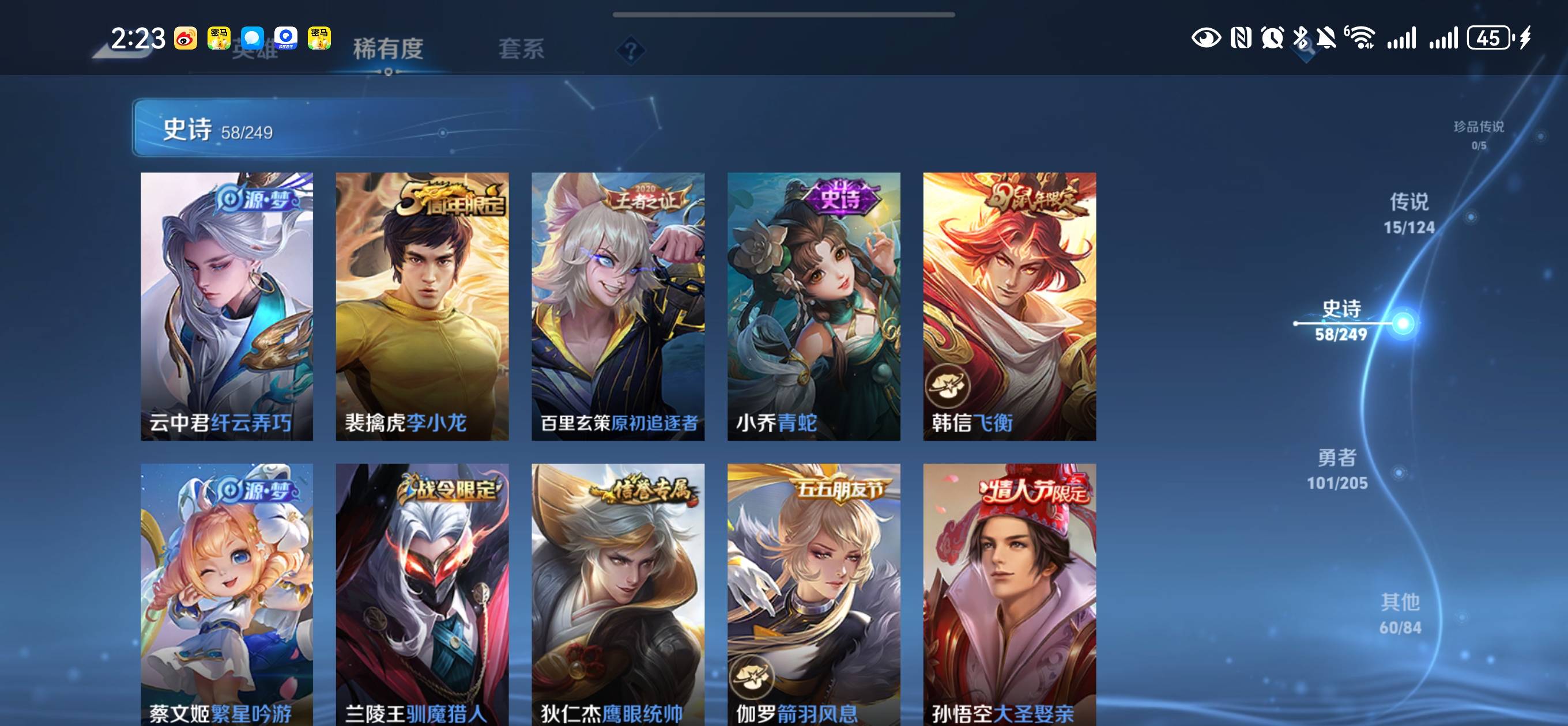 贵族等级:v8皮肤数:236传说品质15 情人节限定2 荣耀典藏2 生肖限定3 英雄数:122