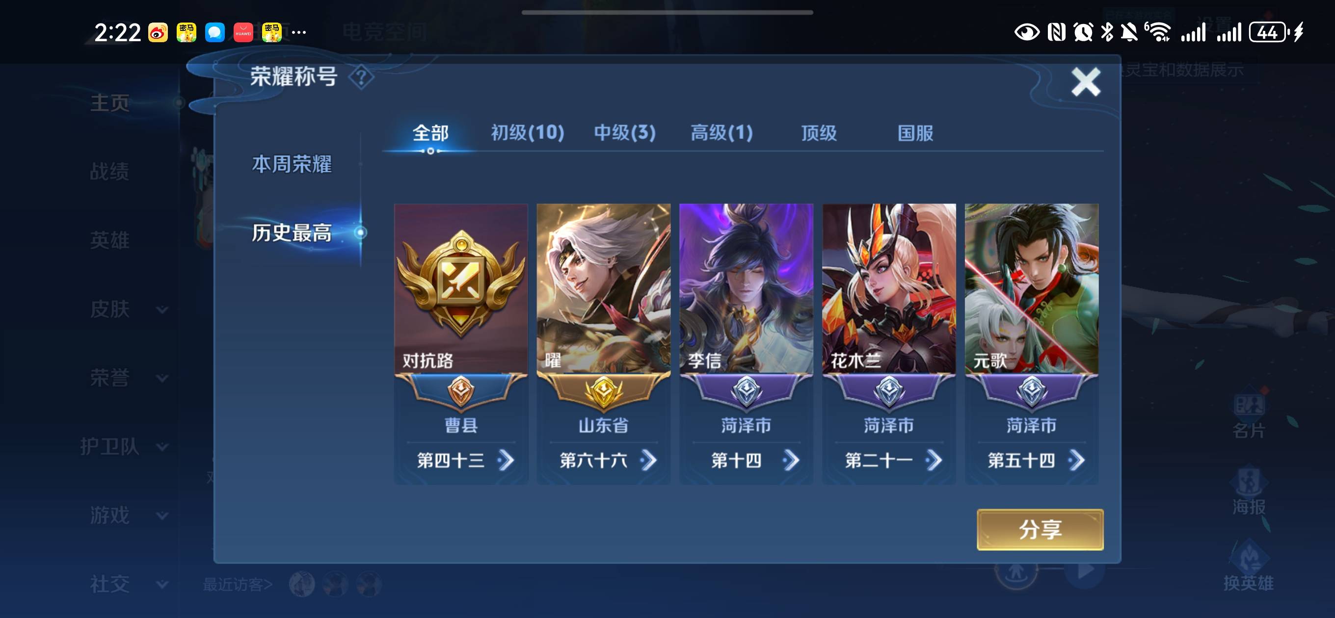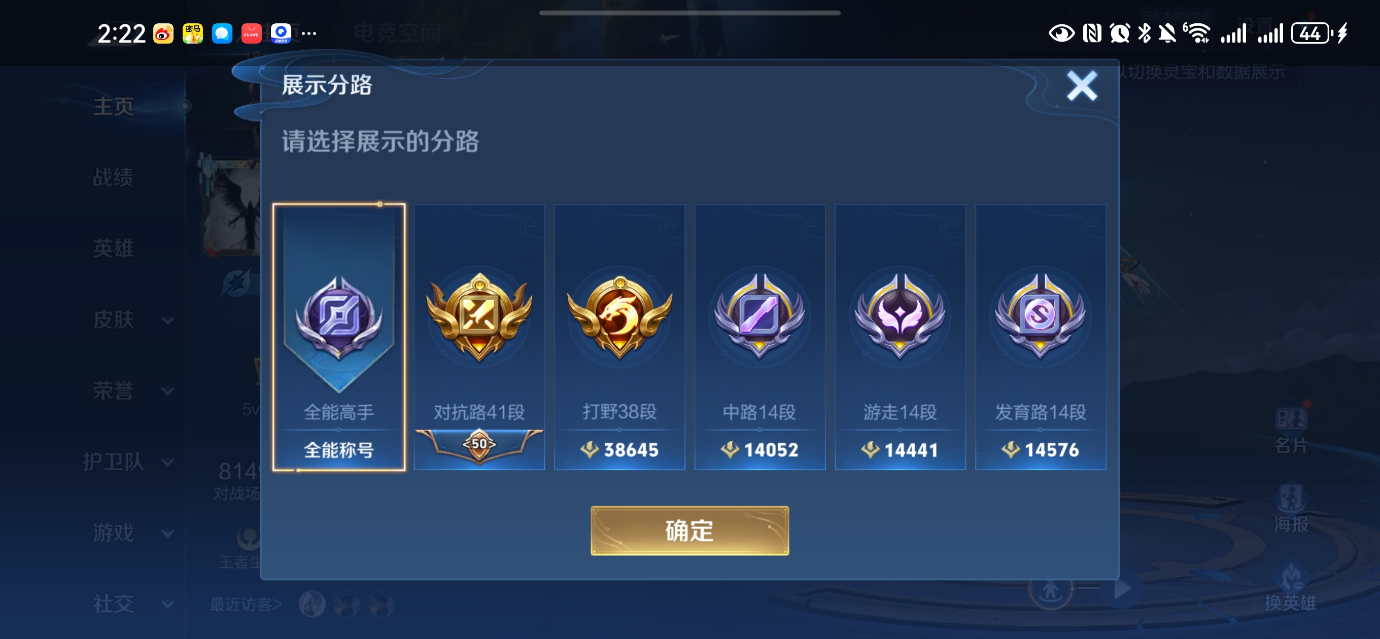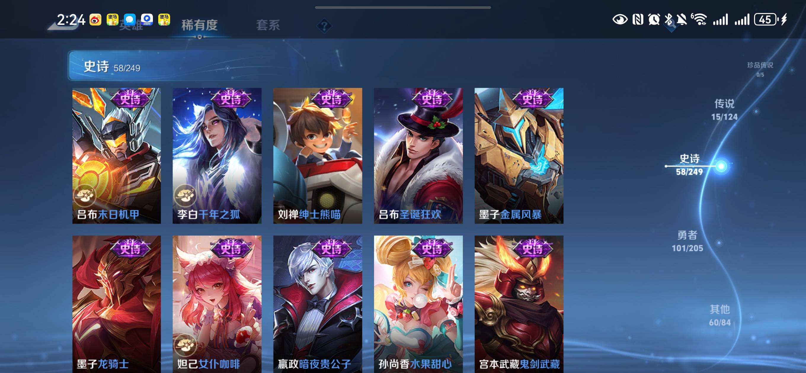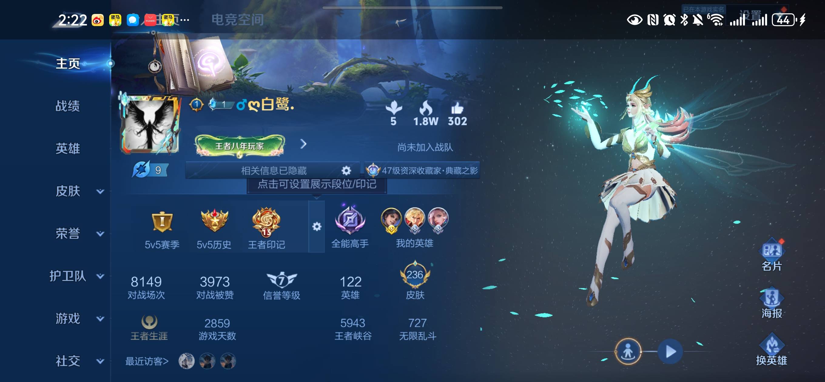 贵族等级:v8皮肤数:236传说品质15 情人节限定2 荣耀典藏2 生肖限定3 英雄数:122