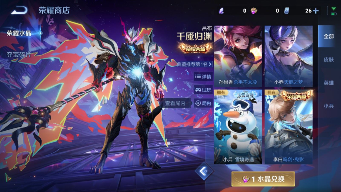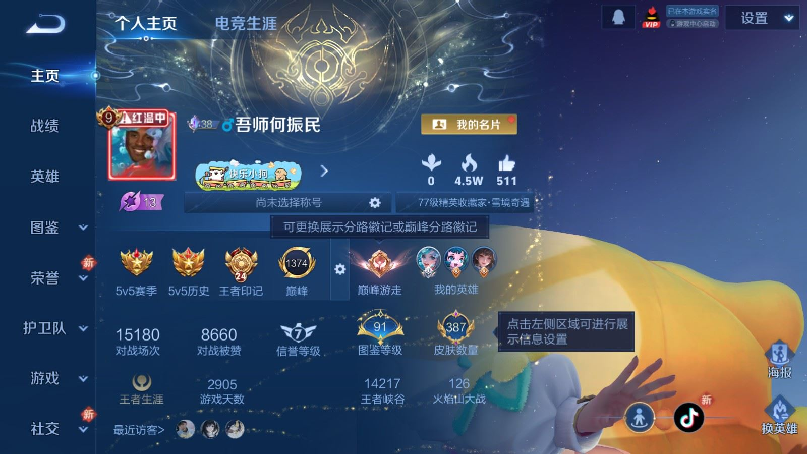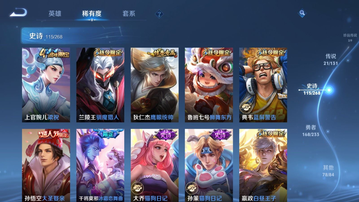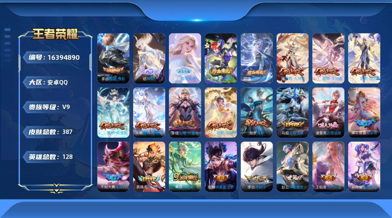 贵族等级:v9皮肤数:387情人节限定4 传说品质21 生肖限定9 珍品传说2 荣耀典藏1 无双2 英雄数:128