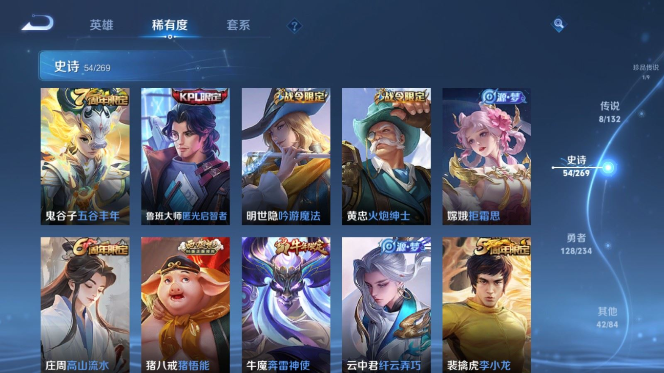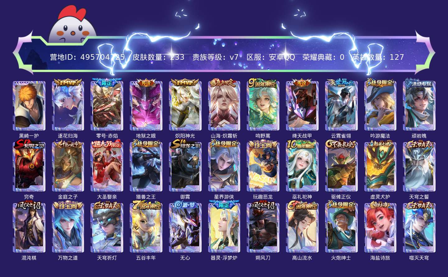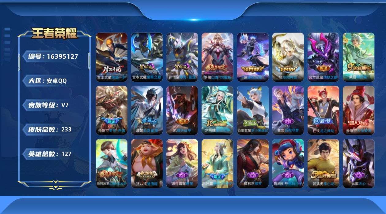 贵族等级:v7皮肤数:233传说品质8 情人节限定1 珍品传说1 生肖限定3 英雄数:127