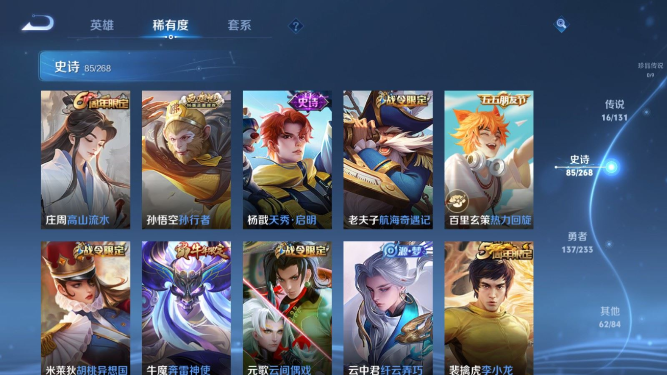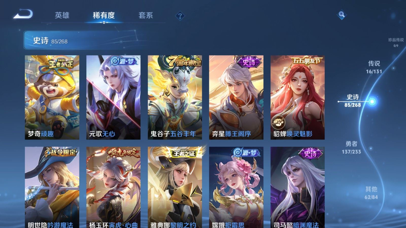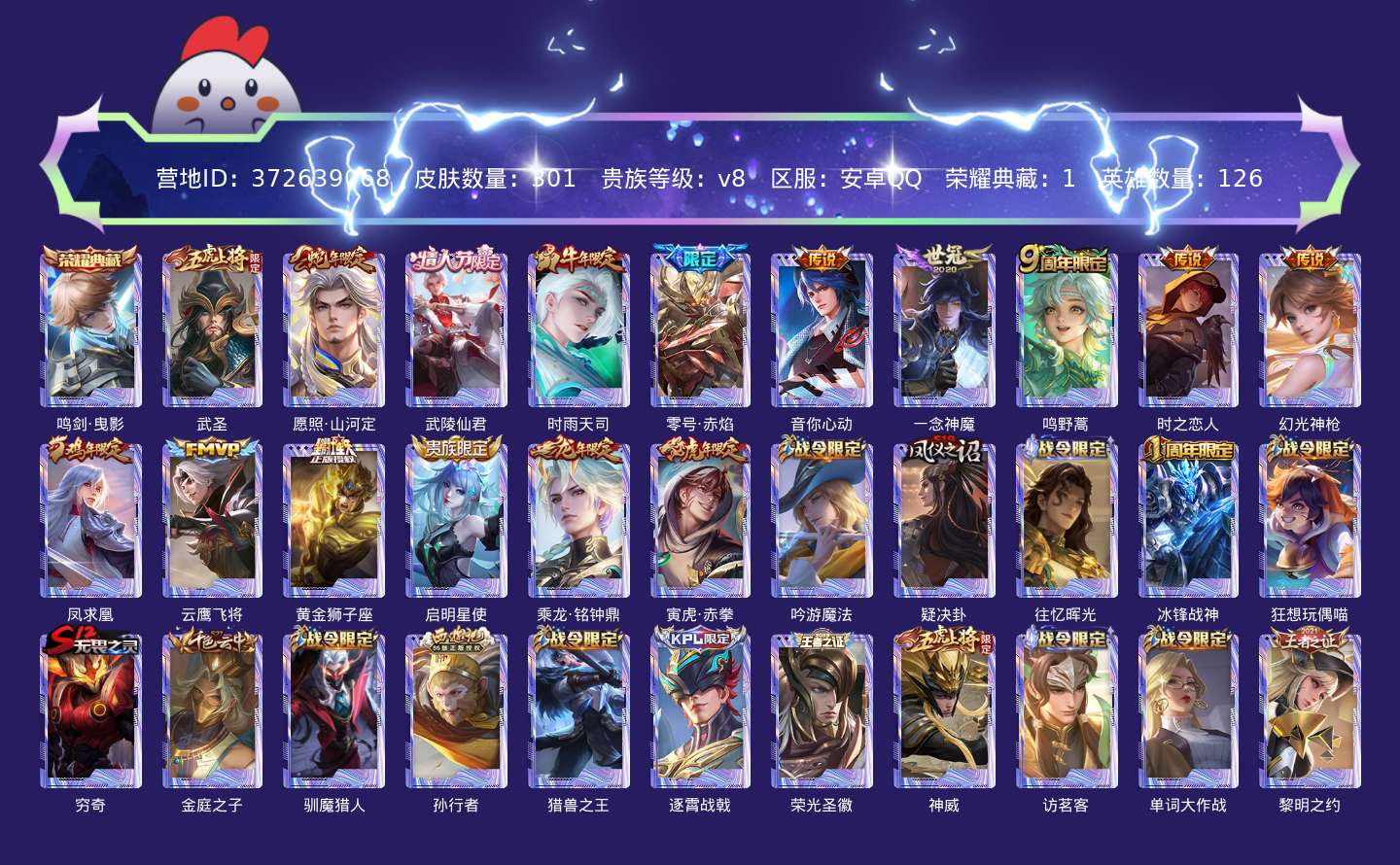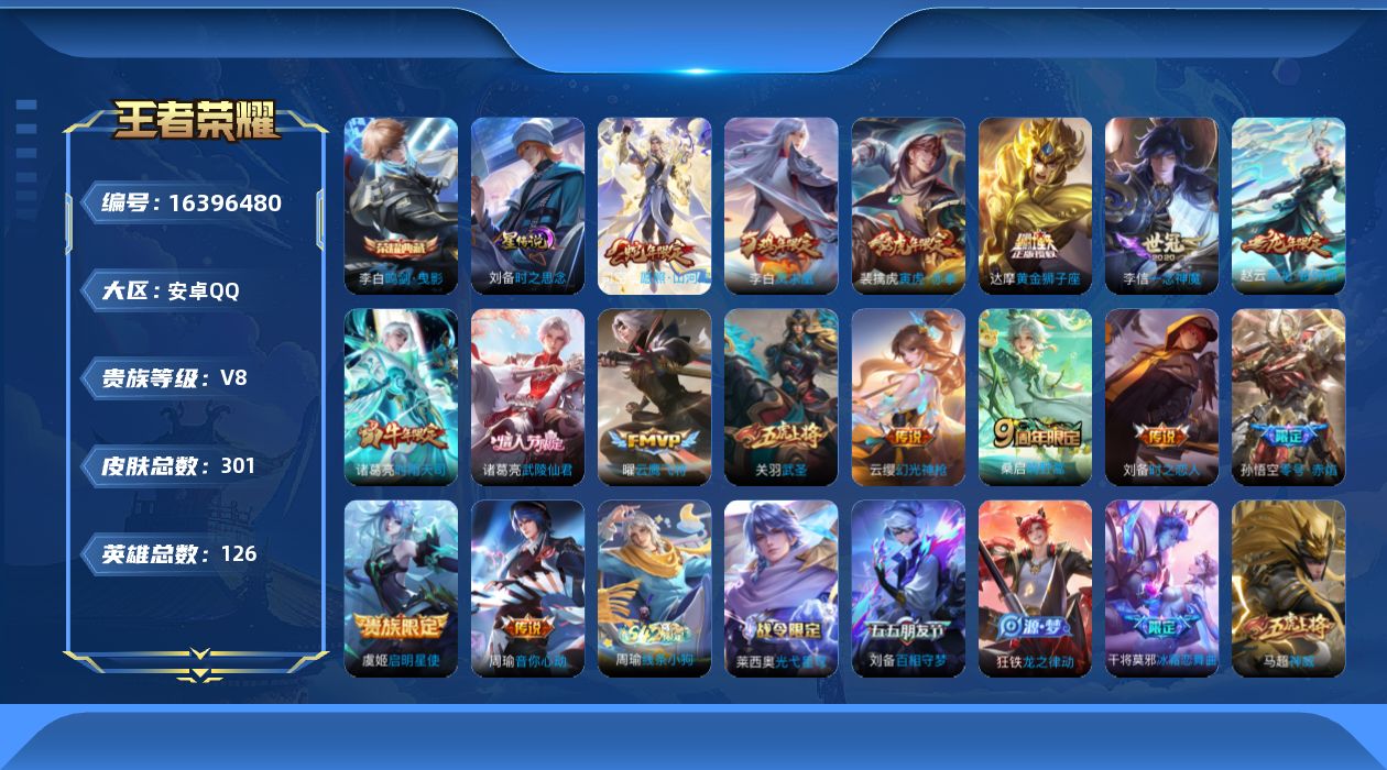 贵族等级:v8皮肤数:301传说品质16 生肖限定8 情人节限定2 荣耀典藏1 英雄数:126