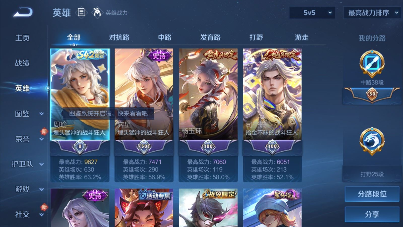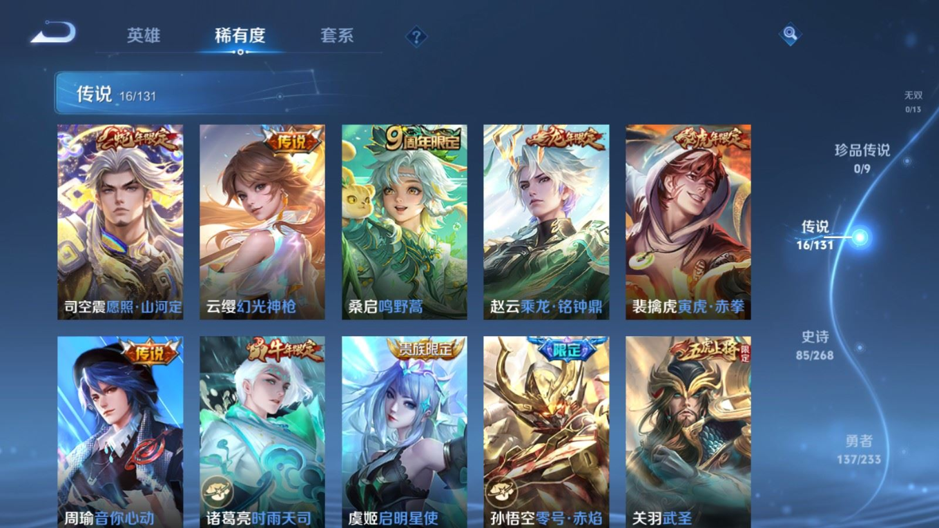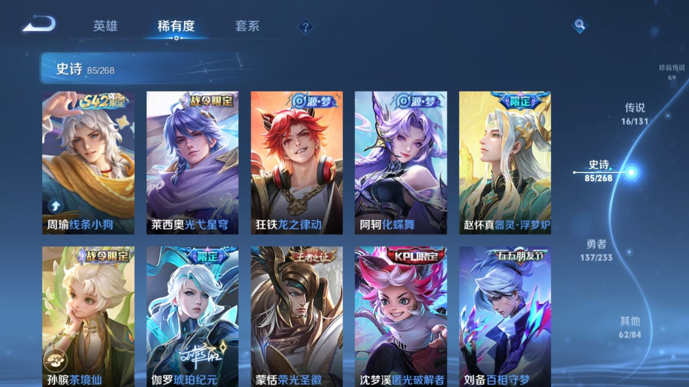 贵族等级:v8皮肤数:301传说品质16 生肖限定8 情人节限定2 荣耀典藏1 英雄数:126