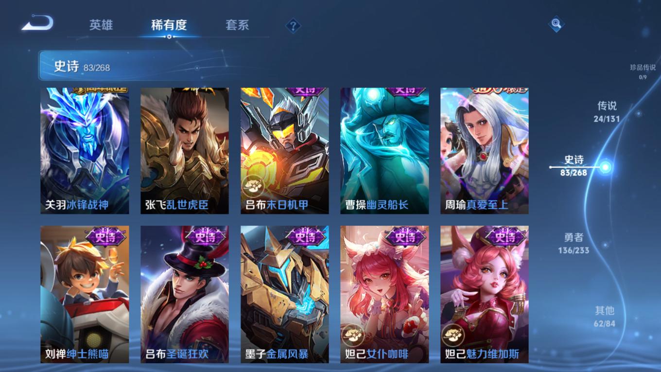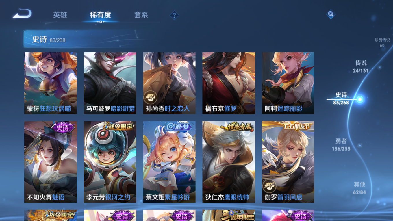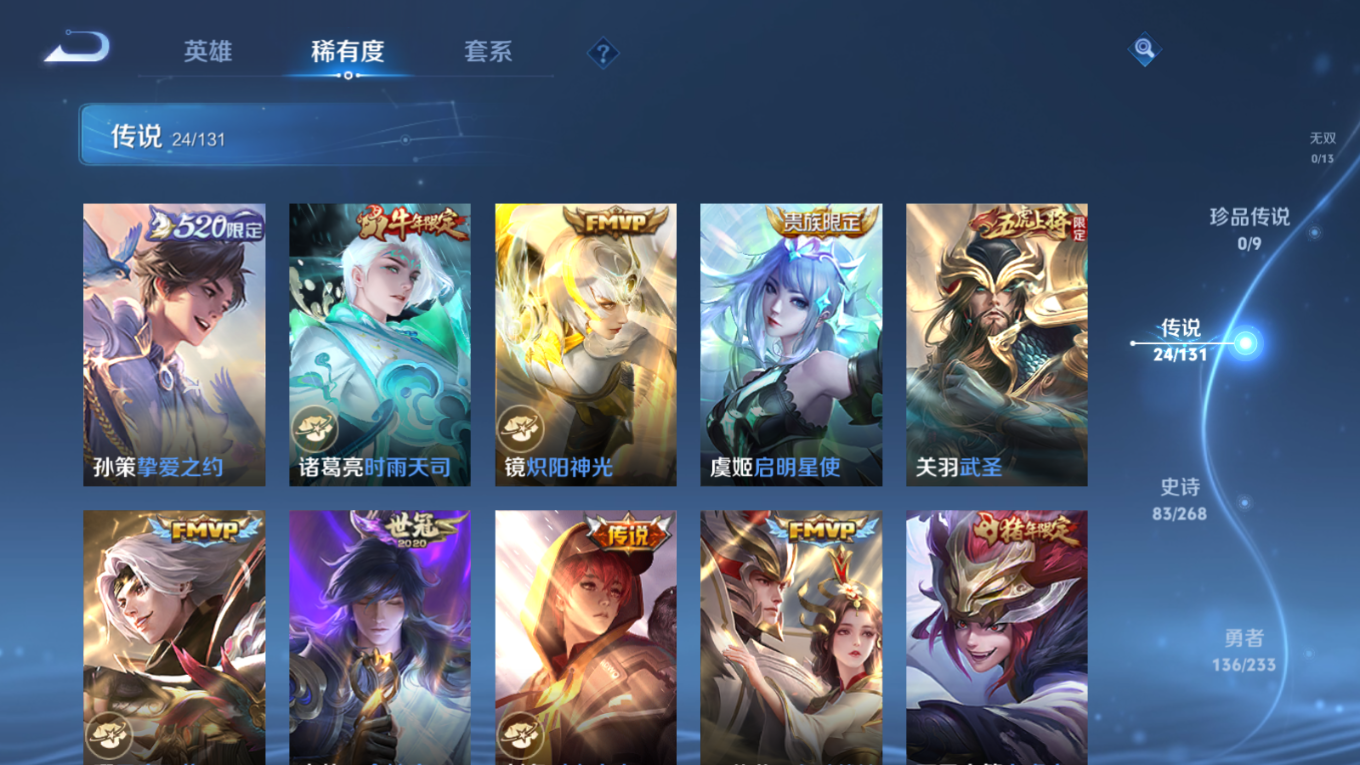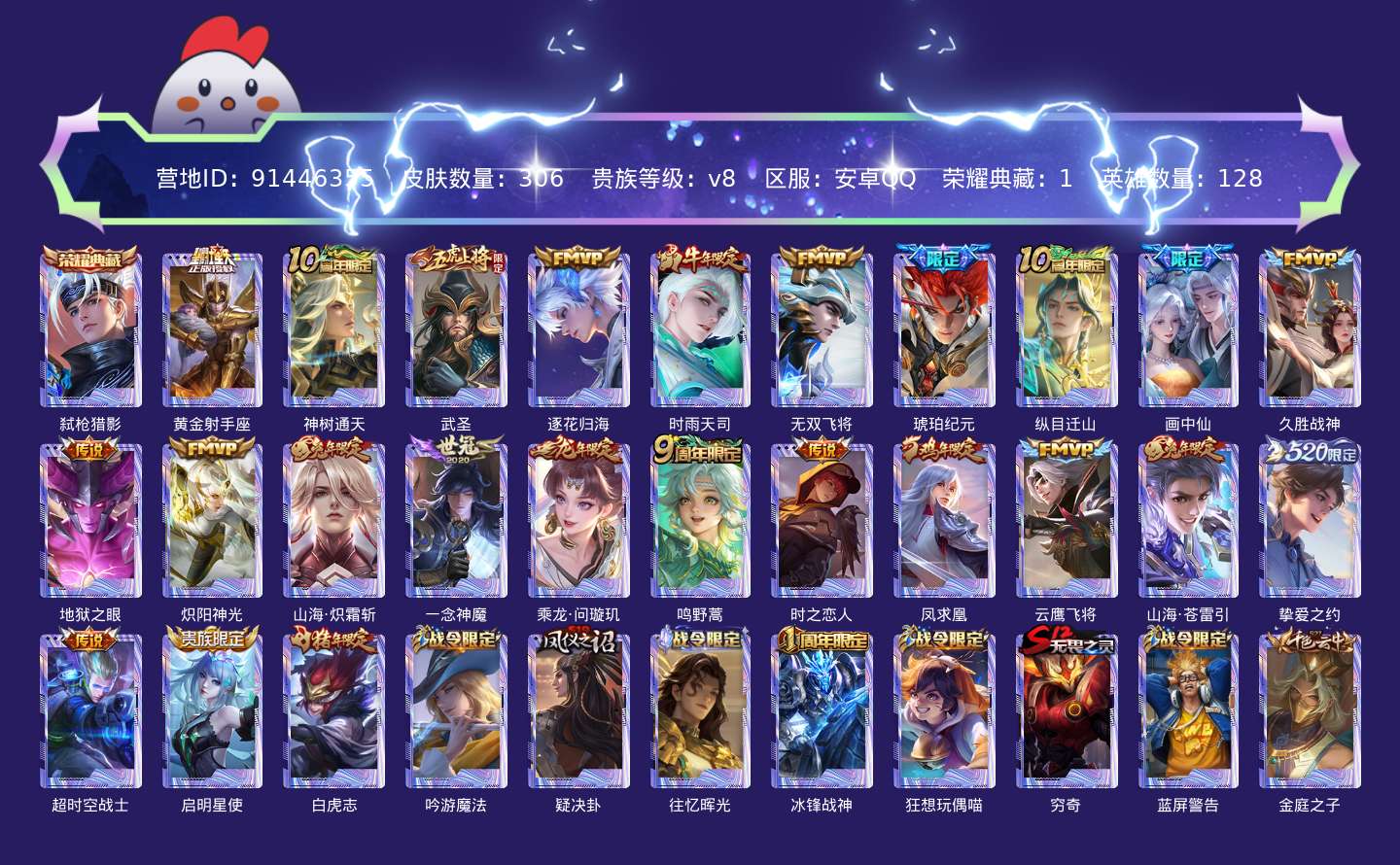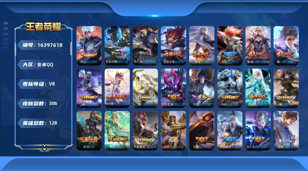 贵族等级:v8皮肤数:306传说品质24 生肖限定8 情人节限定3 荣耀典藏1 英雄数:128