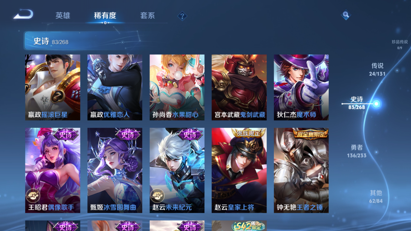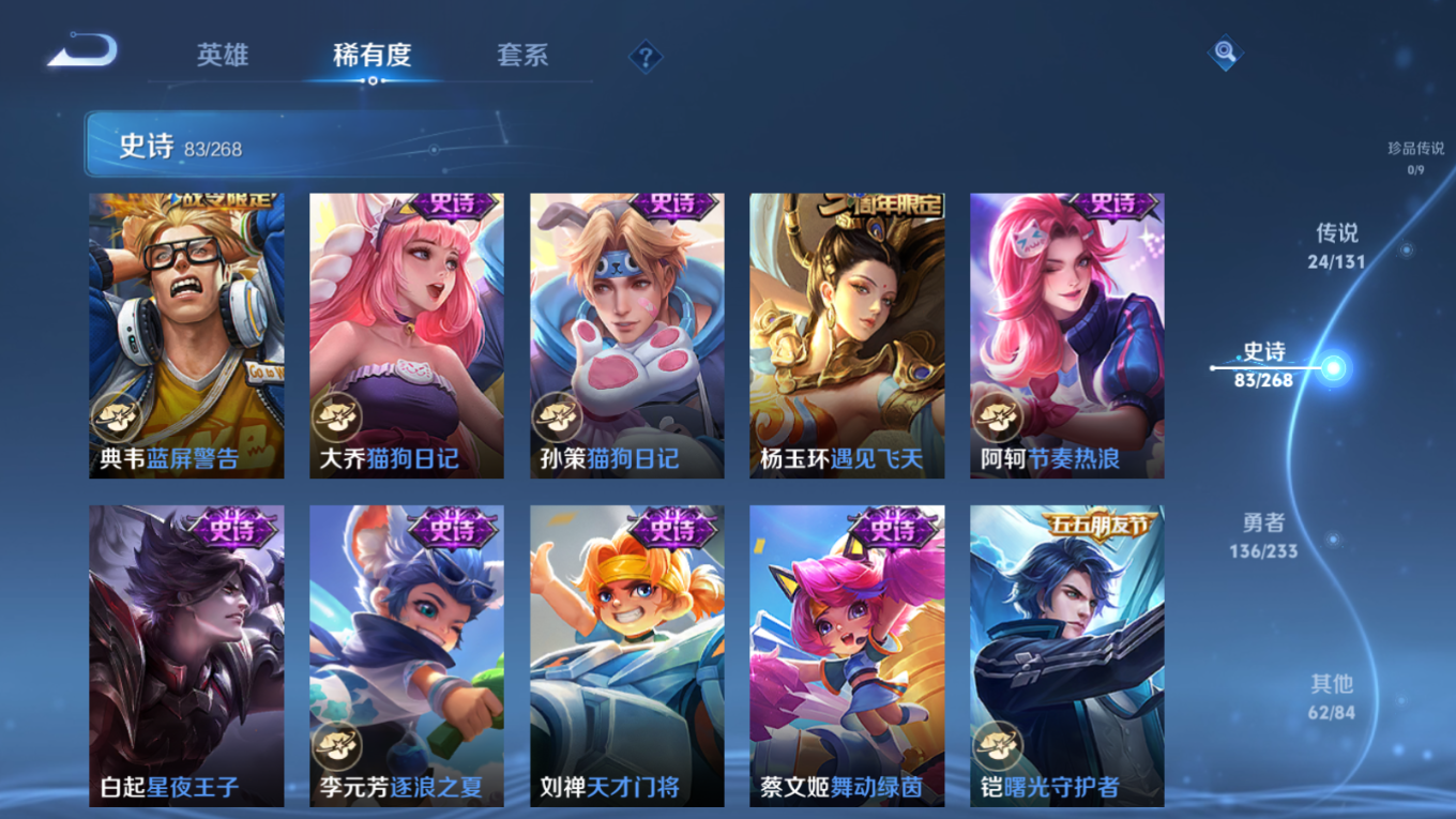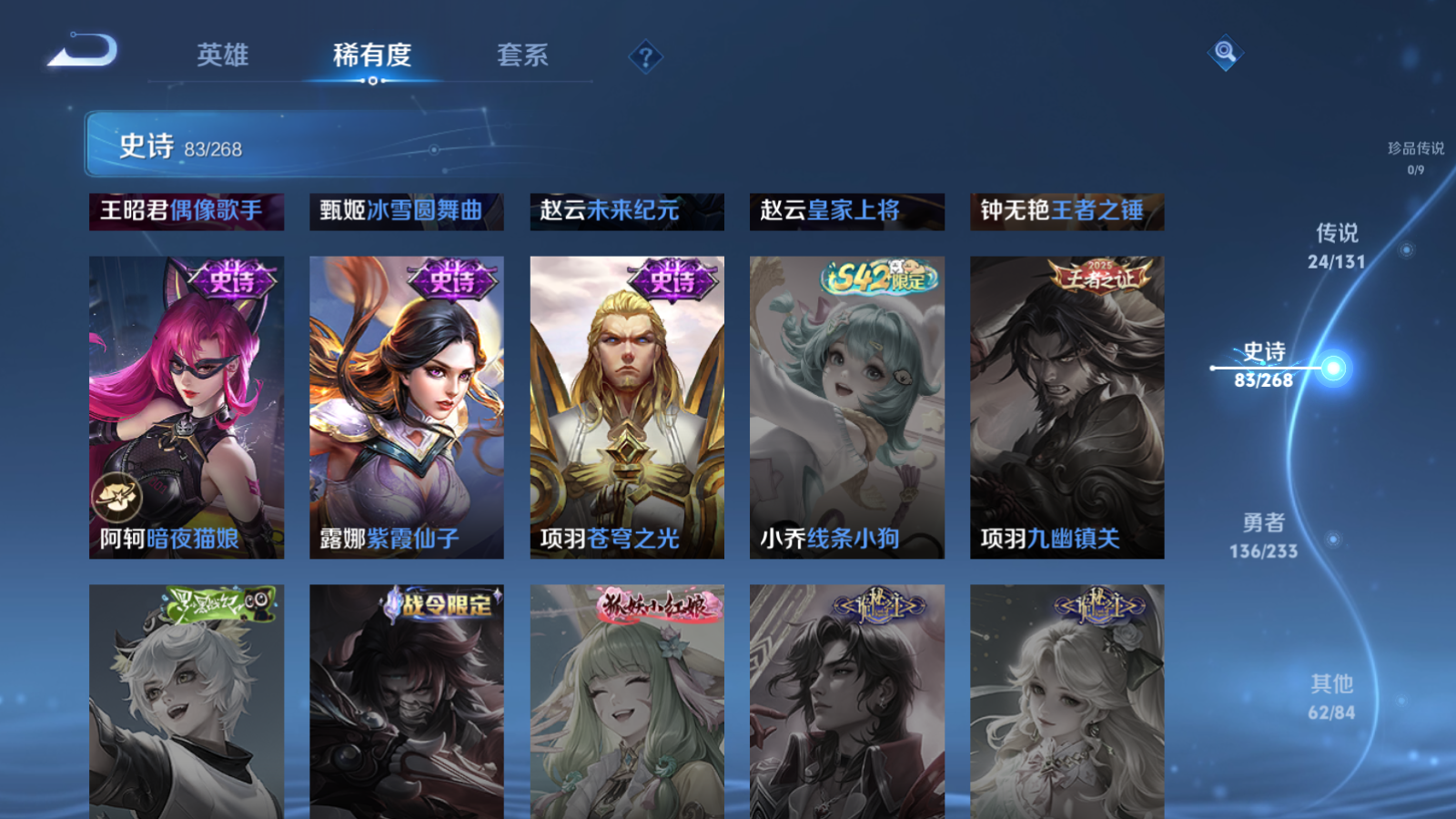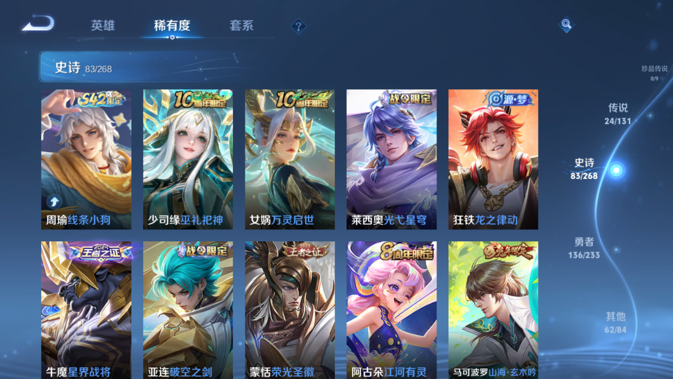 贵族等级:v8皮肤数:306传说品质24 生肖限定8 情人节限定3 荣耀典藏1 英雄数:128