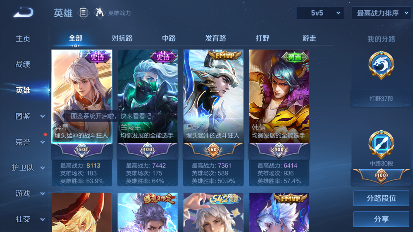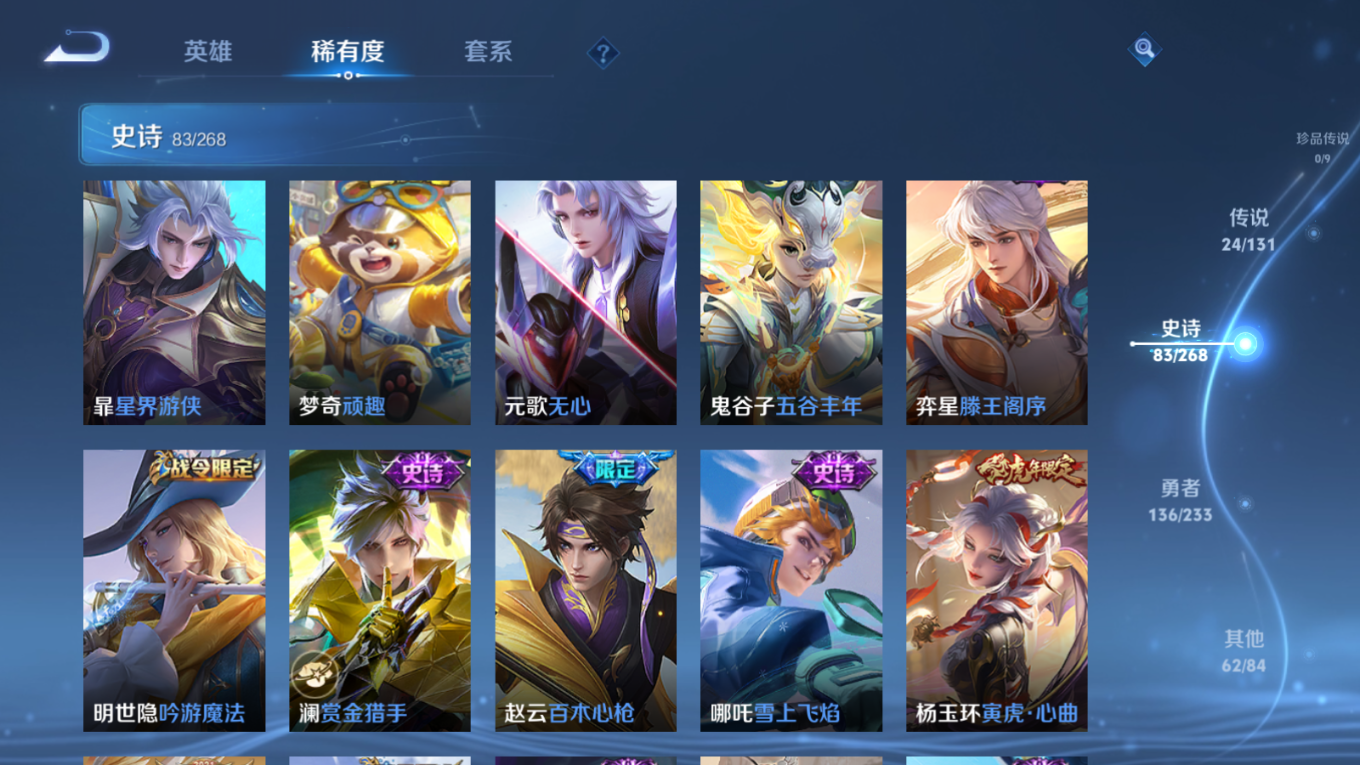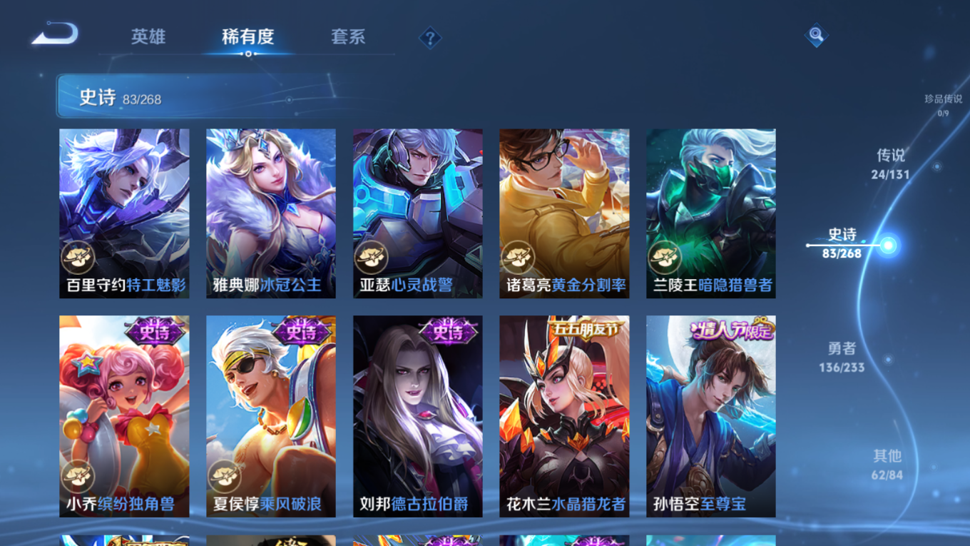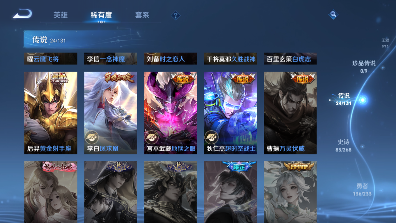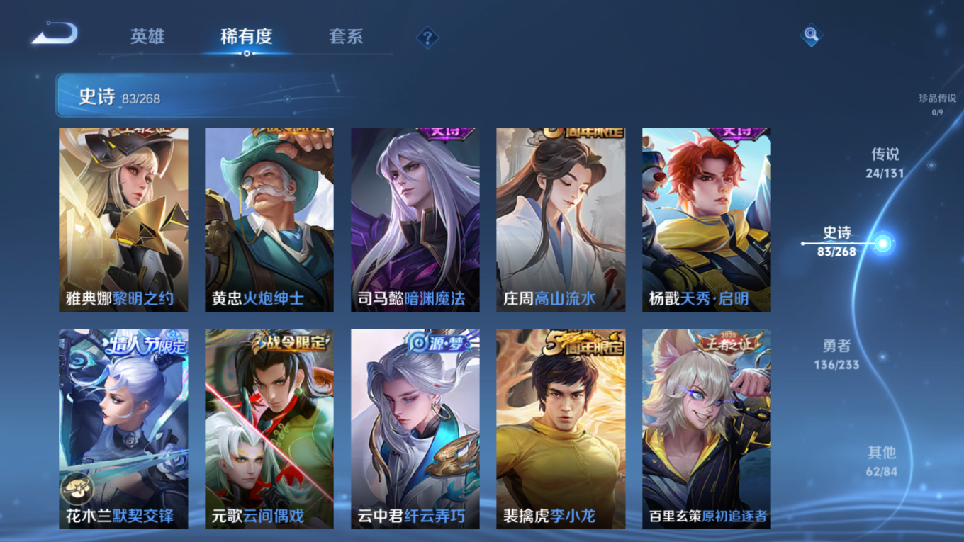 贵族等级:v8皮肤数:306传说品质24 生肖限定8 情人节限定3 荣耀典藏1 英雄数:128