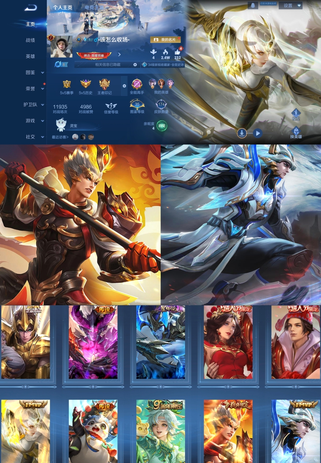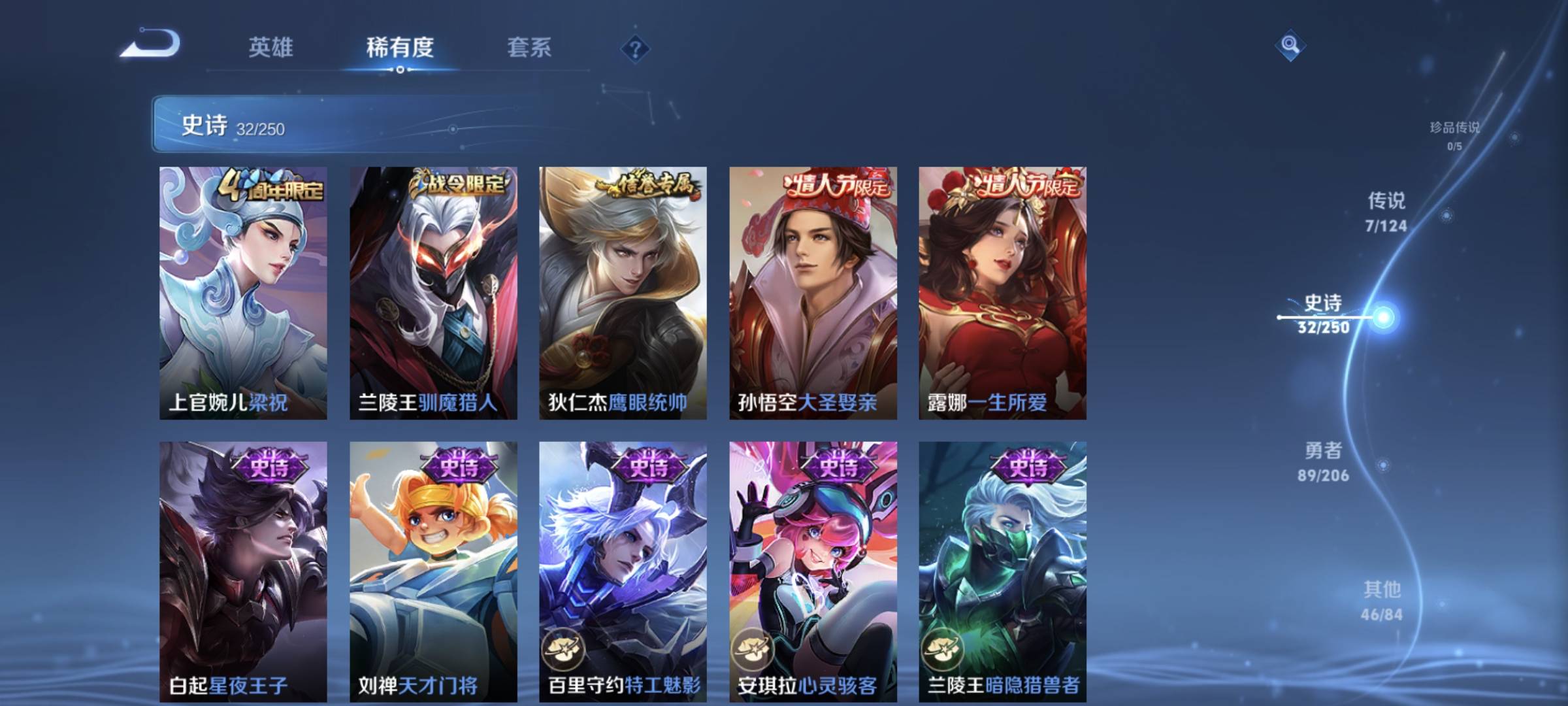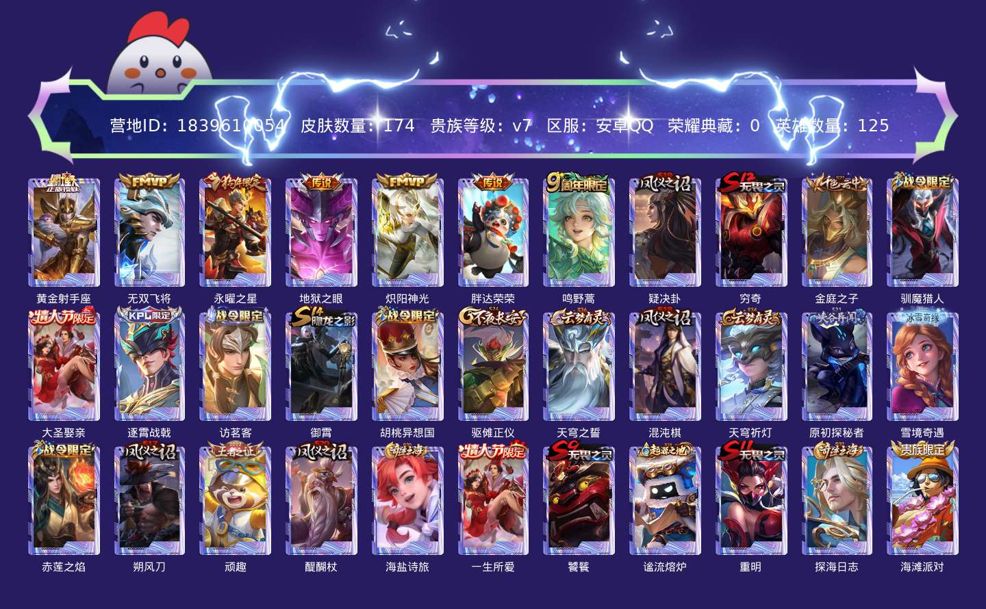 贵族等级:v7皮肤数:174传说品质7 情人节限定2 生肖限定1 英雄数:125