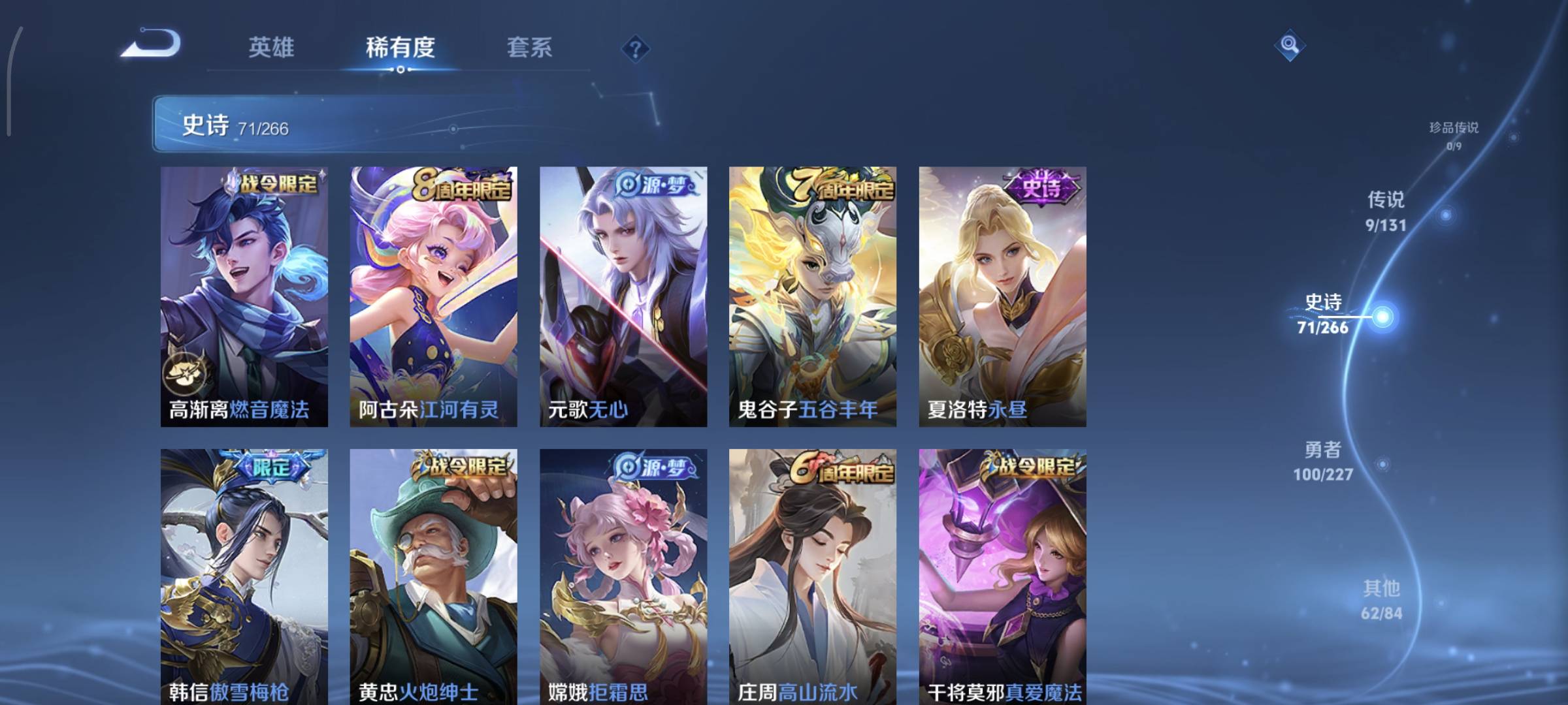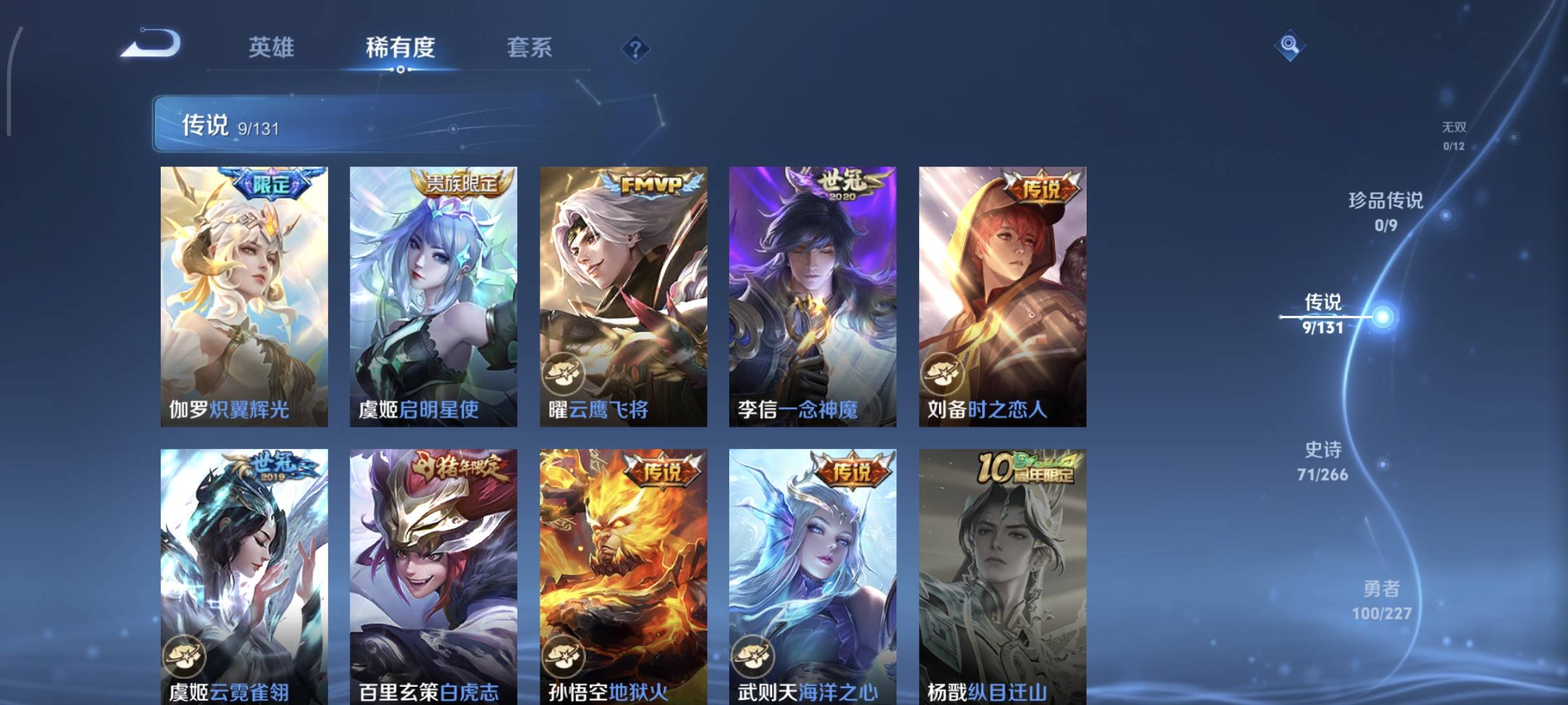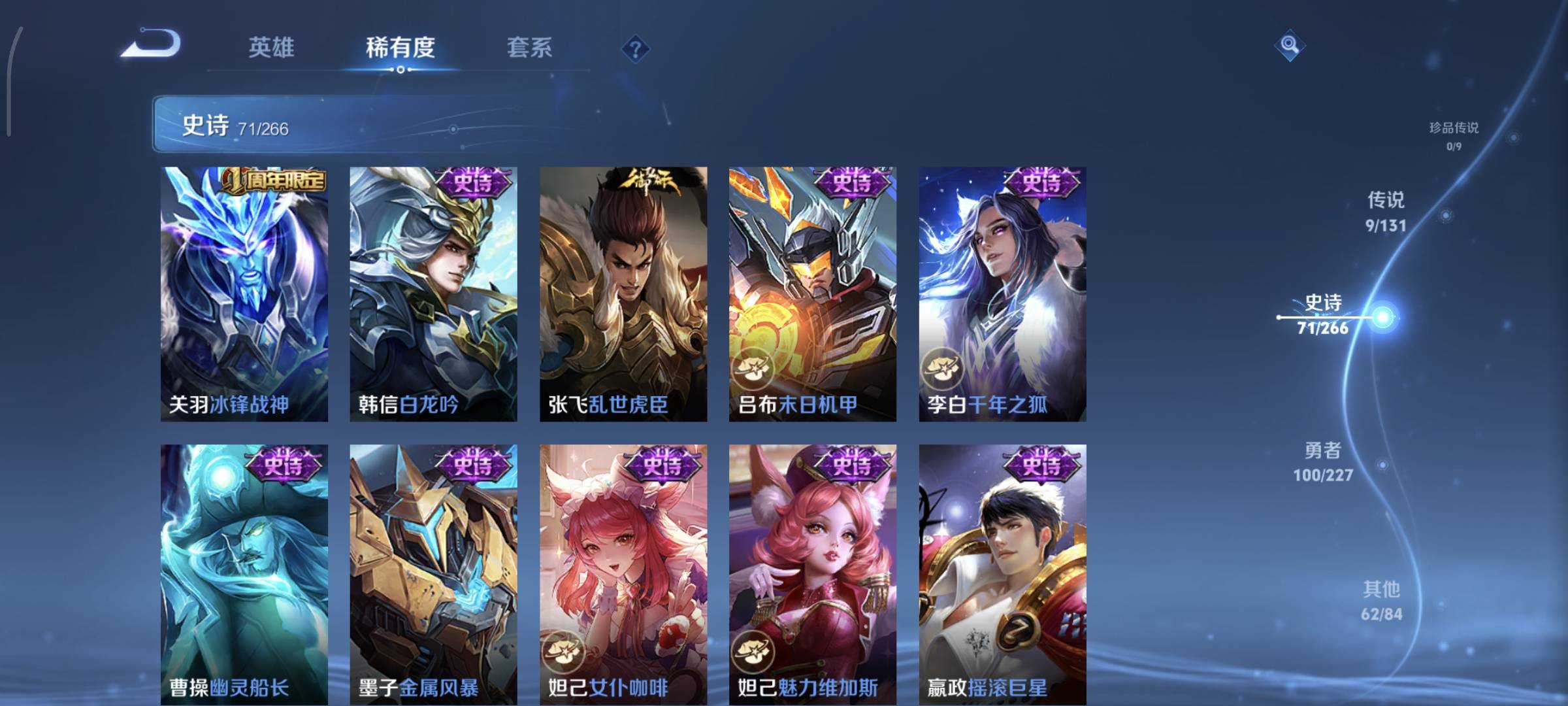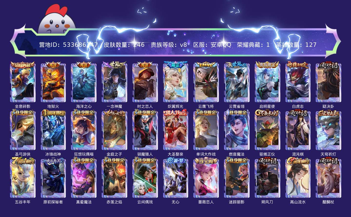 贵族等级:v8皮肤数:246情人节限定1 荣耀典藏1 传说品质9 生肖限定3 英雄数:127