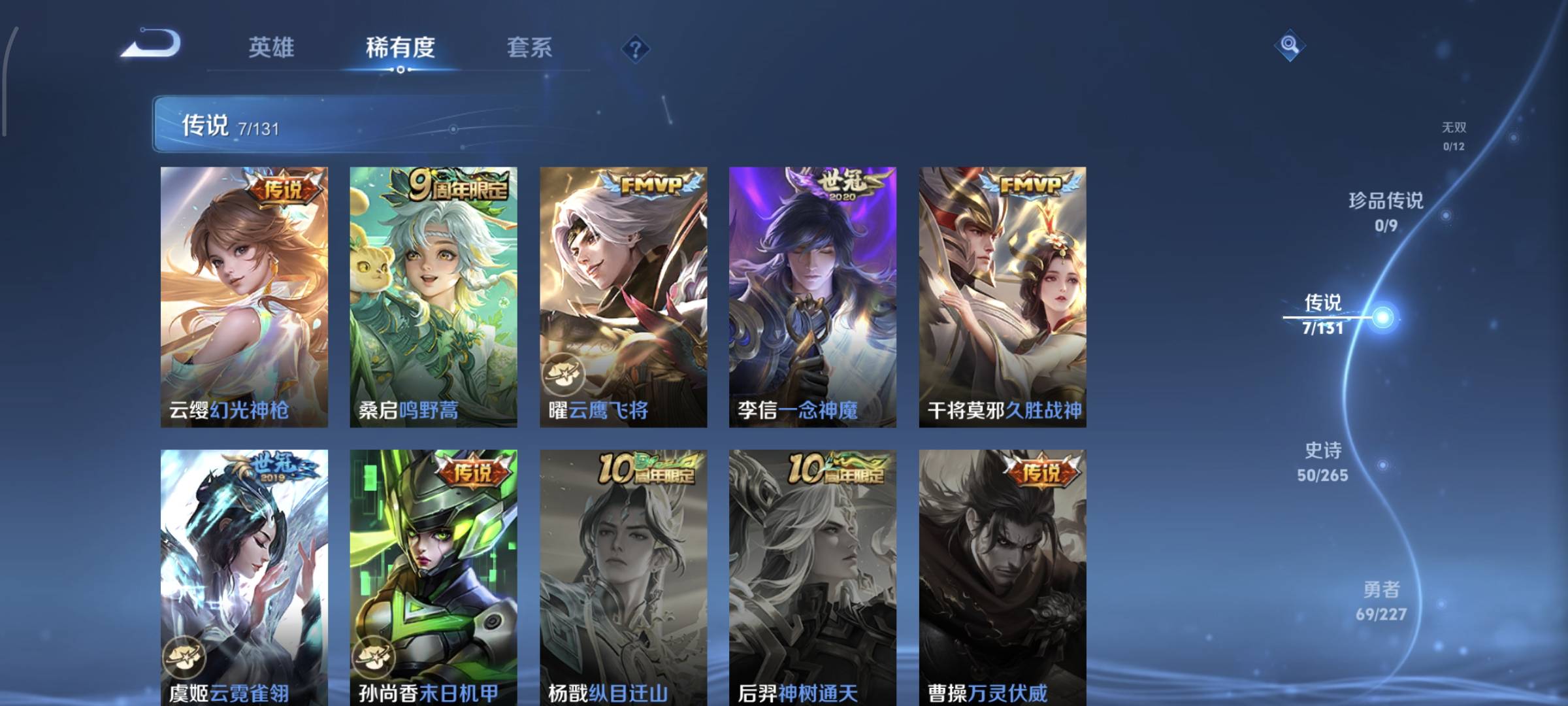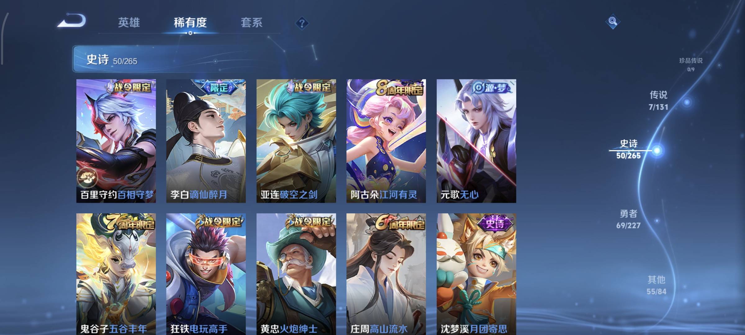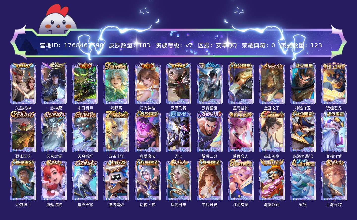 贵族等级:v7皮肤数:183传说品质7 生肖限定1 英雄数:123