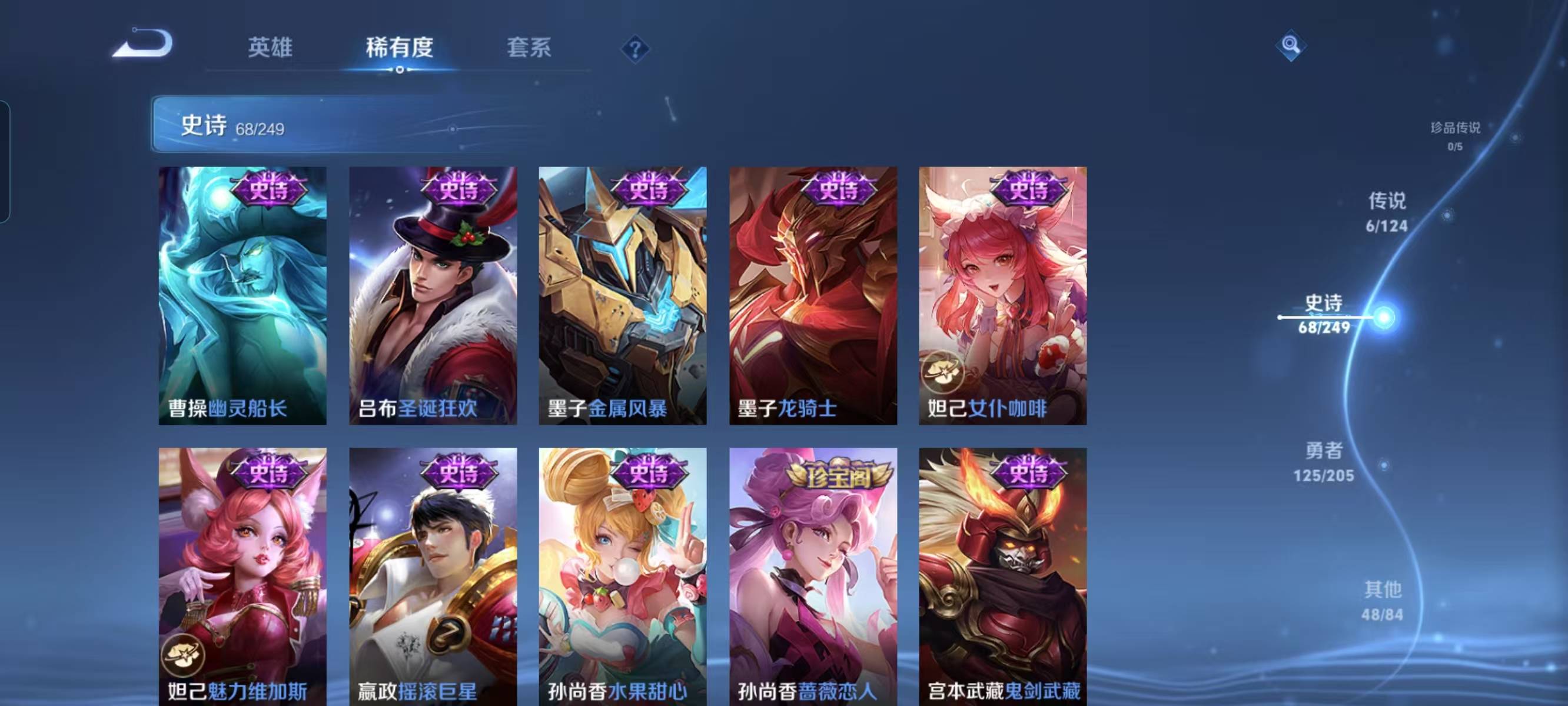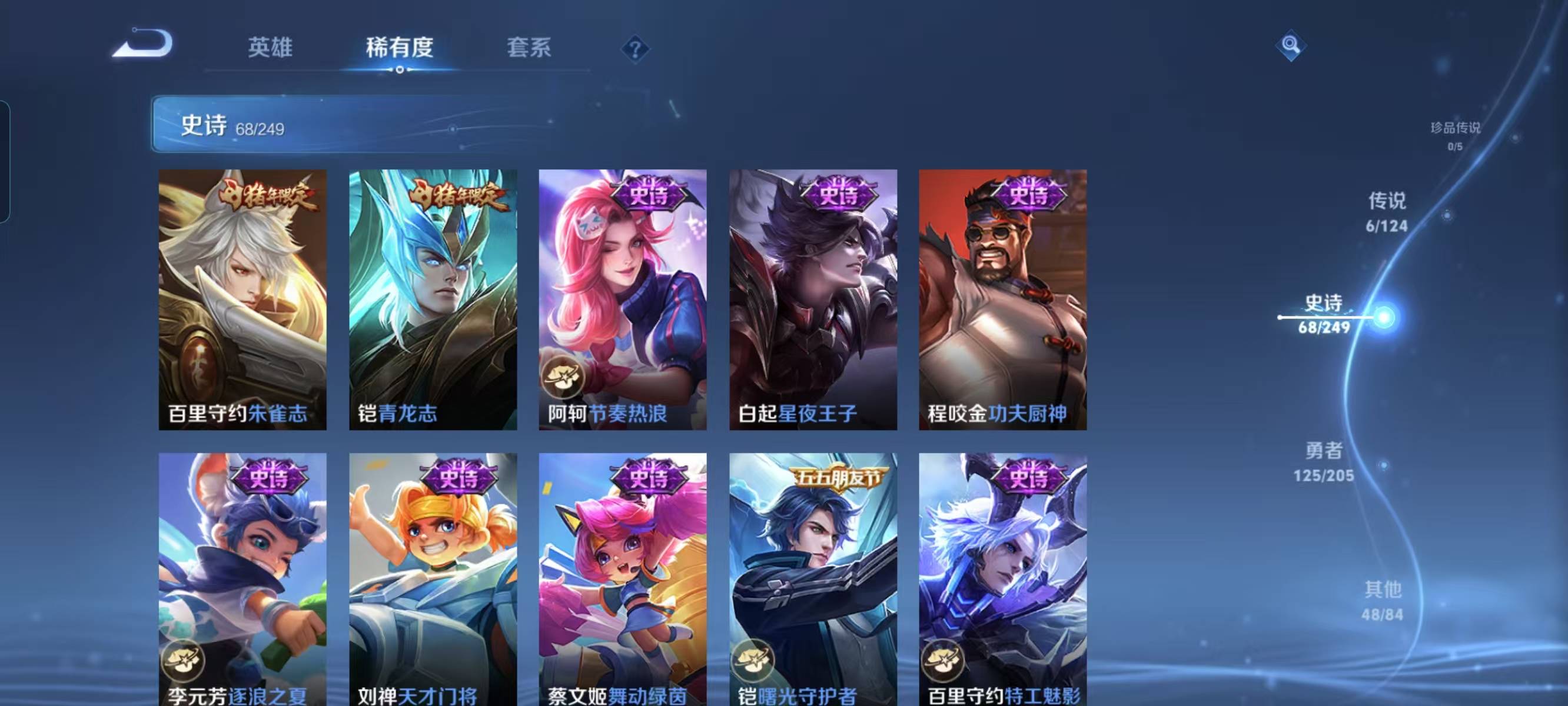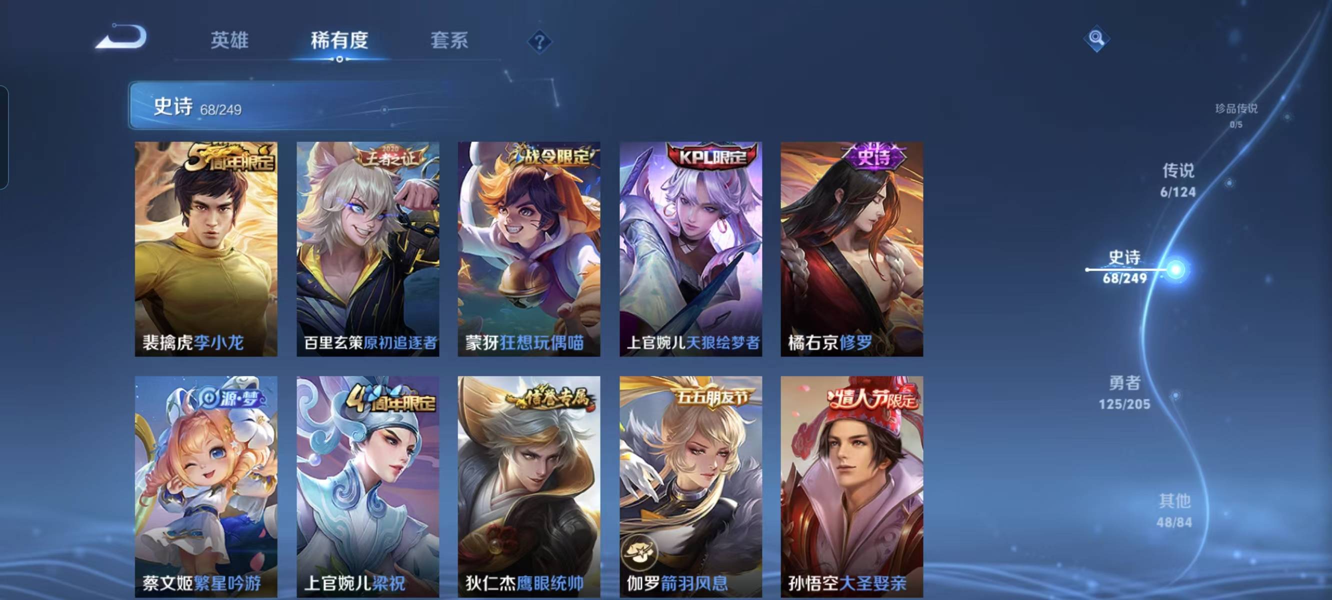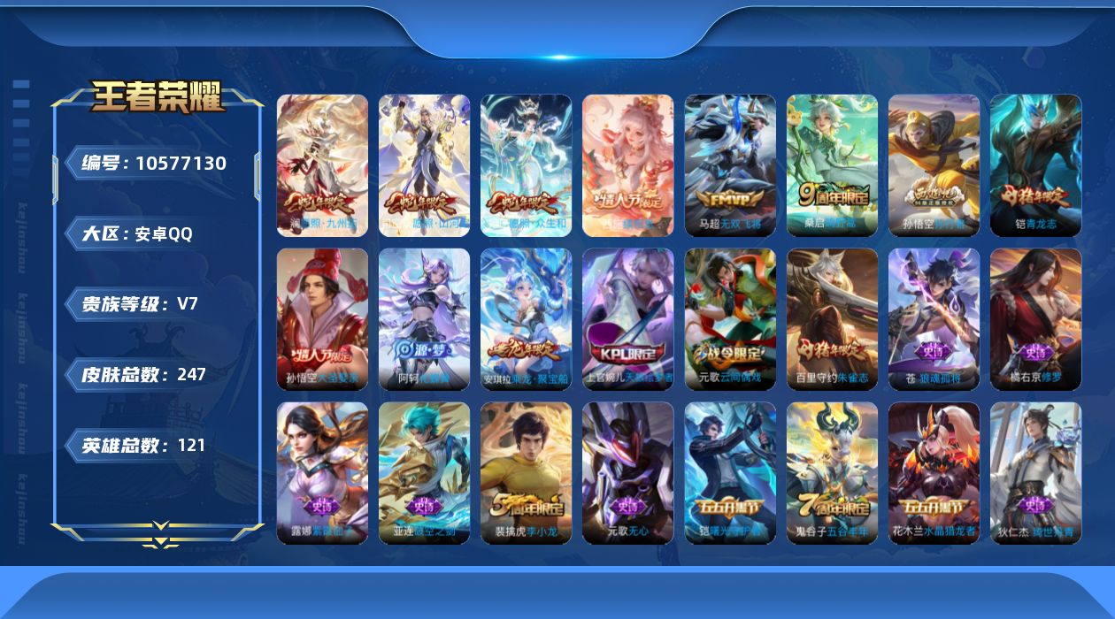 贵族等级:v7皮肤数:247传说品质6 生肖限定6 情人节限定2 英雄数:121