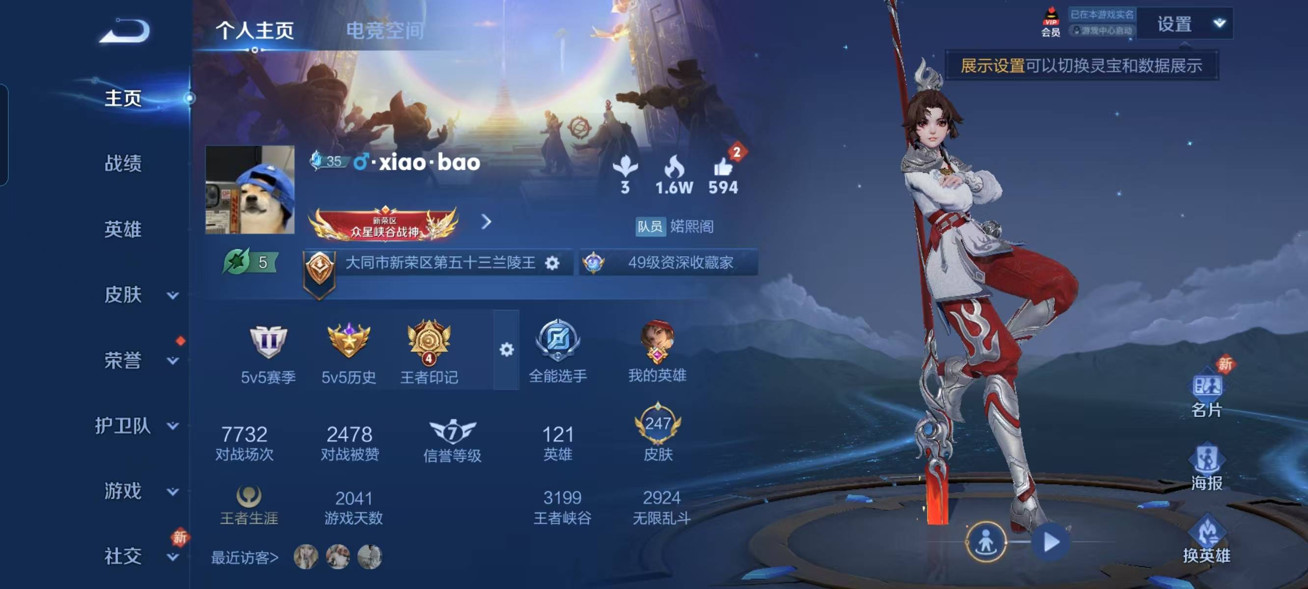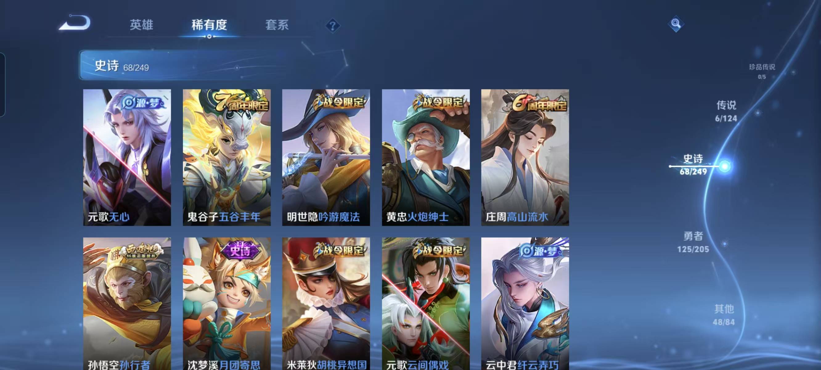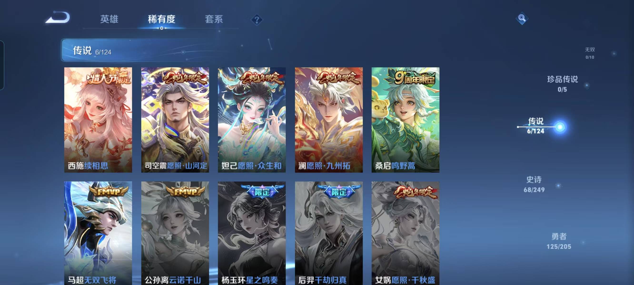贵族等级:v7皮肤数:247传说品质6 生肖限定6 情人节限定2 英雄数:121