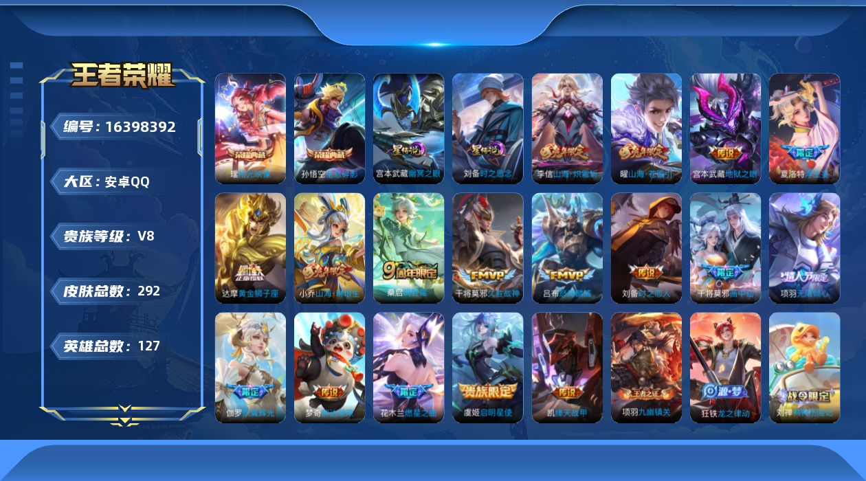 贵族等级:v8皮肤数:292生肖限定6 情人节限定2 荣耀典藏2 传说品质17 英雄数:127