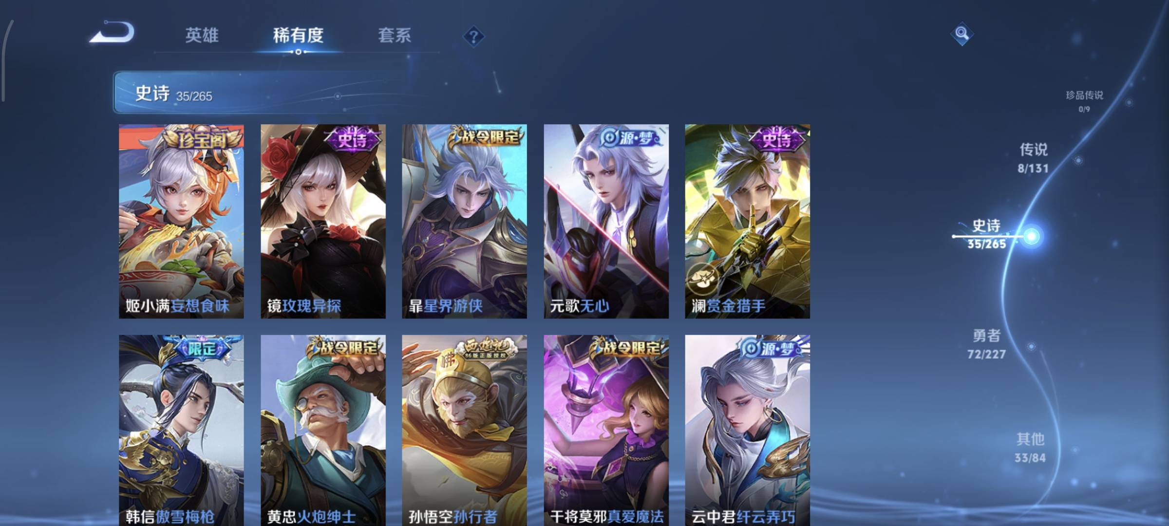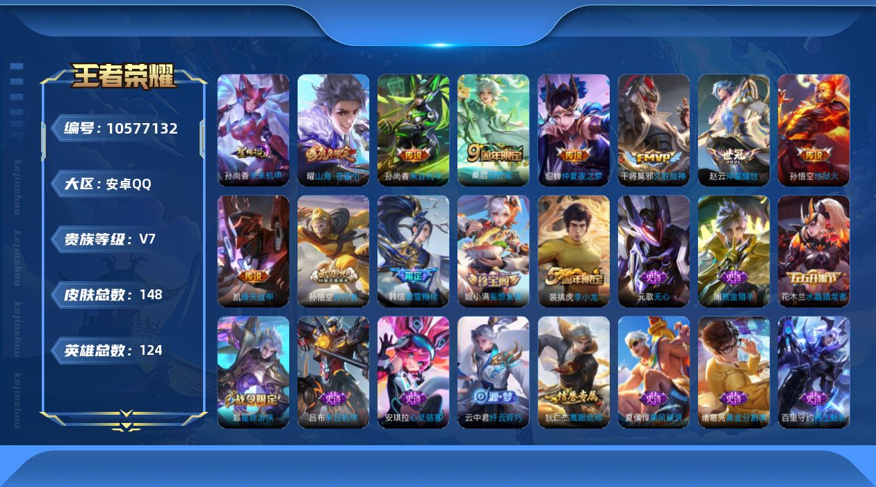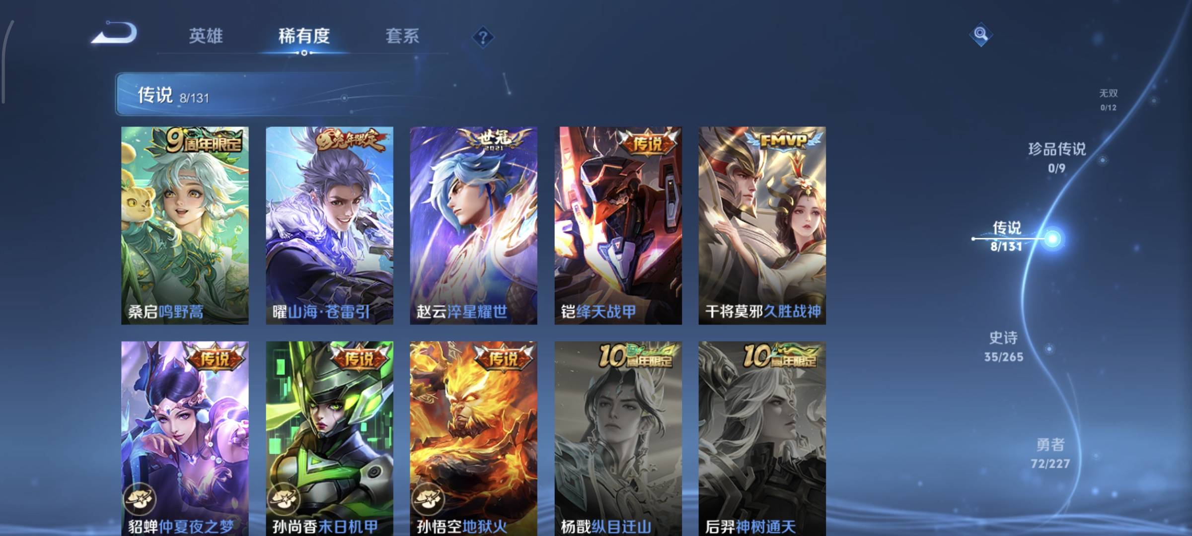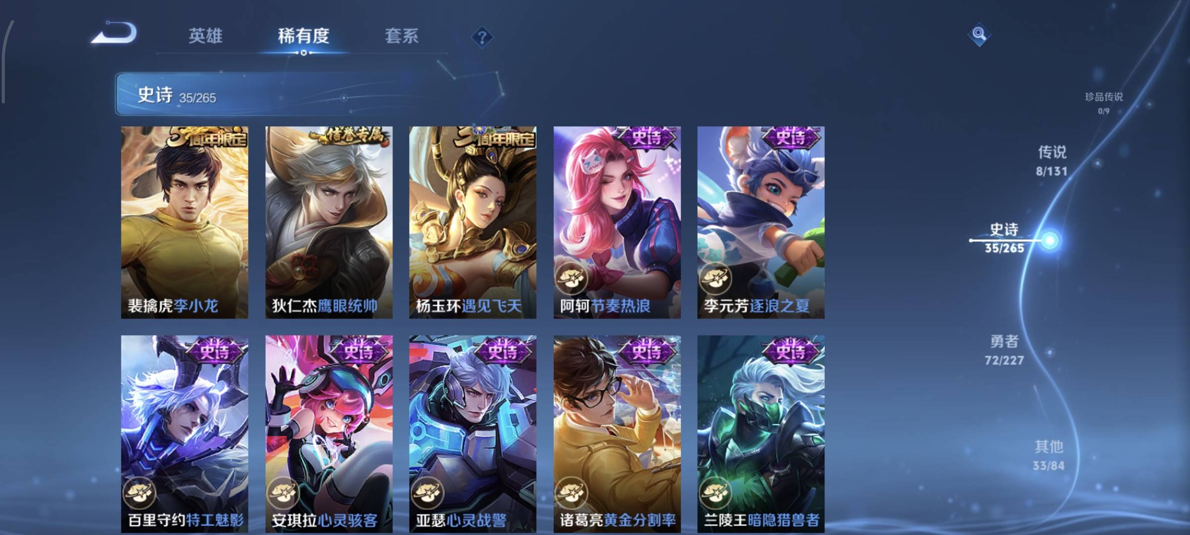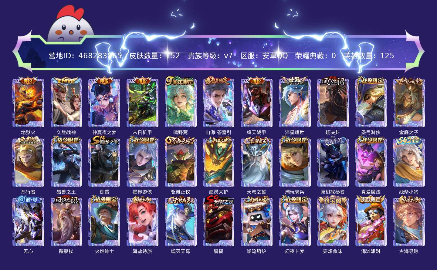 贵族等级:v7皮肤数:152传说品质8 生肖限定1 英雄数:125