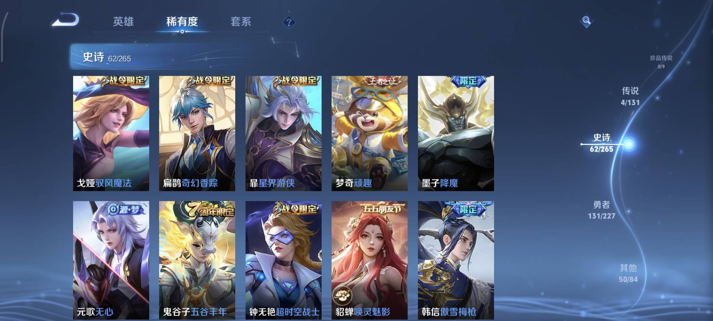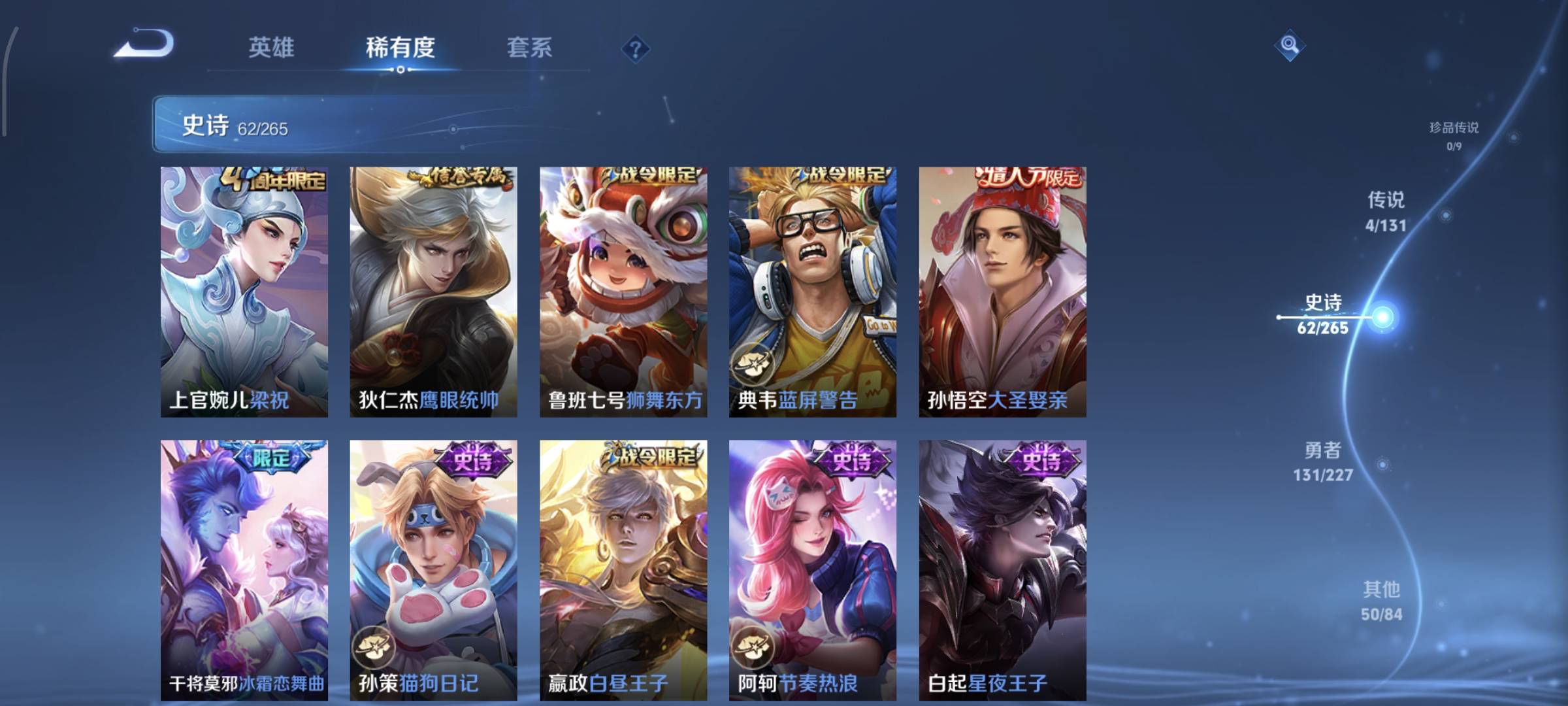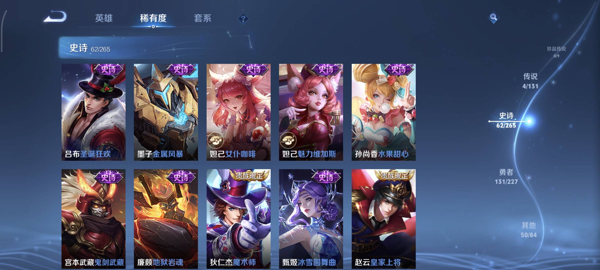 贵族等级:v7皮肤数:253传说品质4 生肖限定1 情人节限定1 荣耀典藏1 英雄数:127