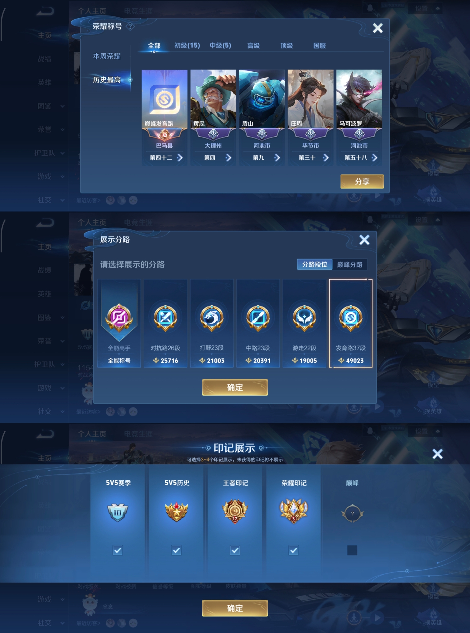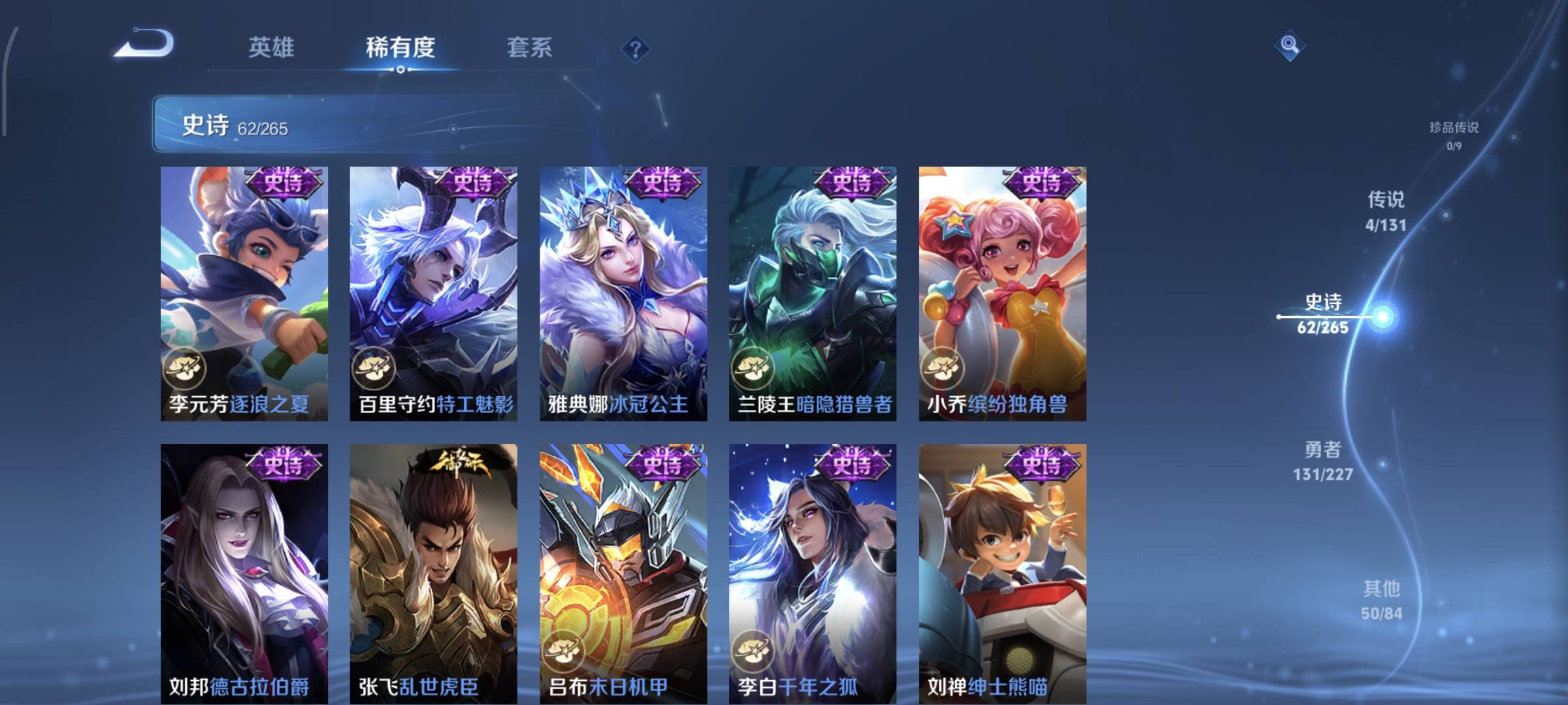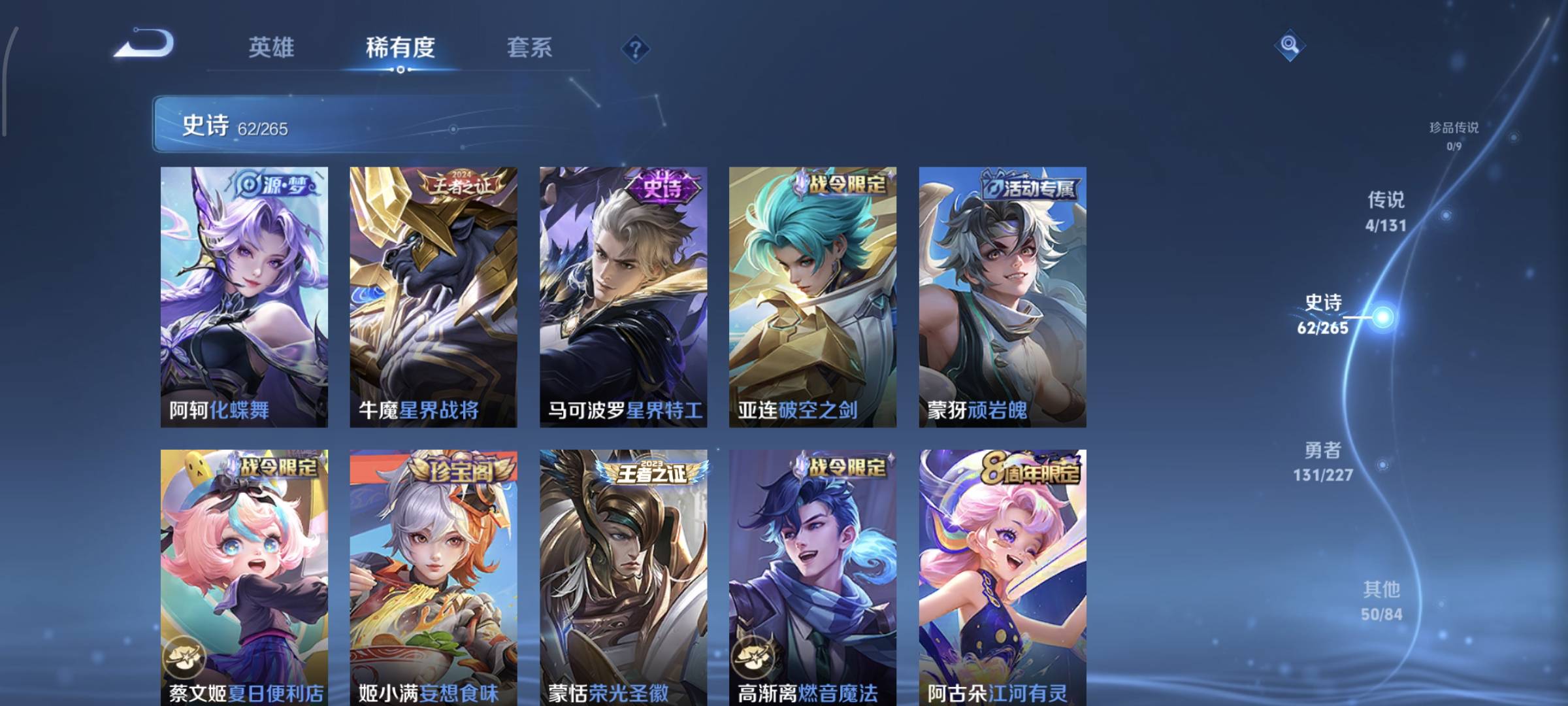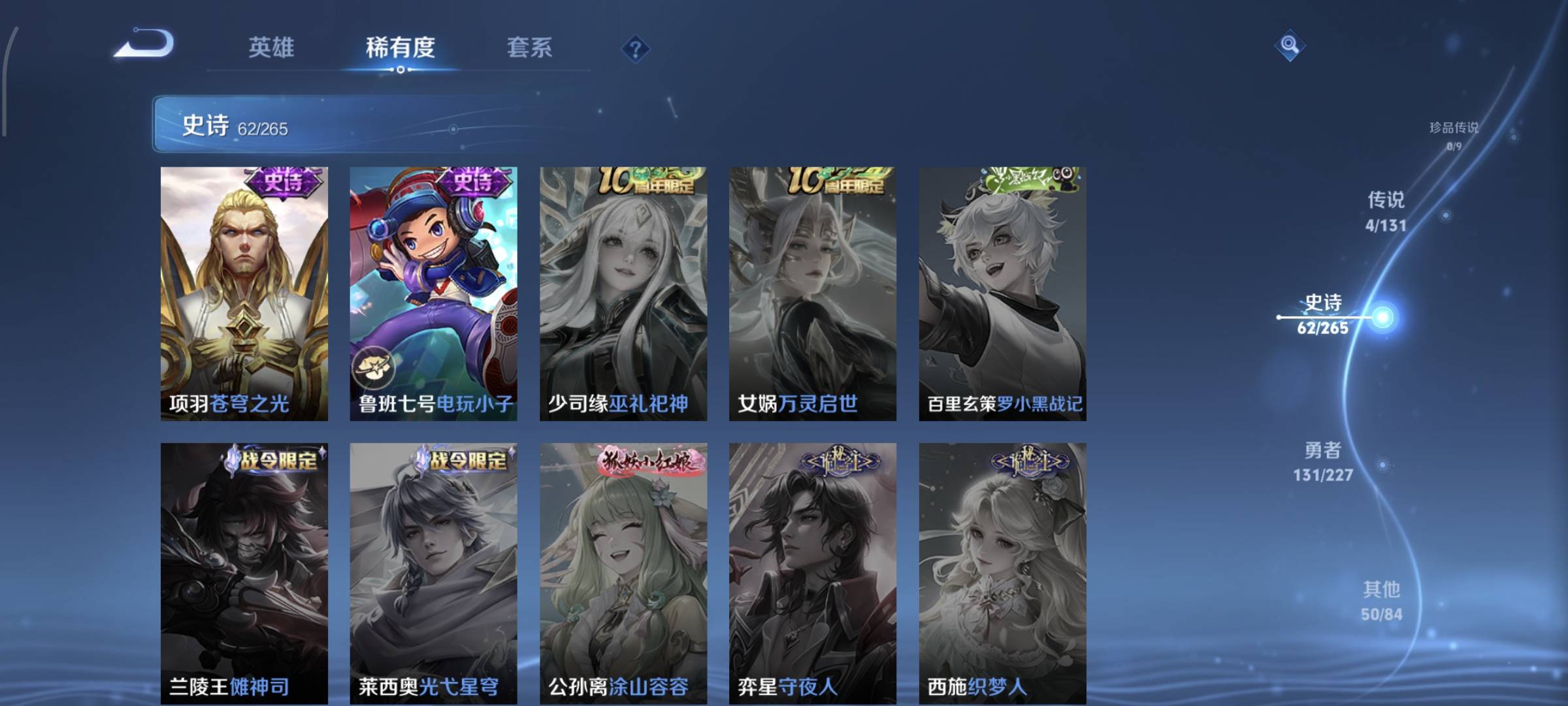 贵族等级:v7皮肤数:253传说品质4 生肖限定1 情人节限定1 荣耀典藏1 英雄数:127
