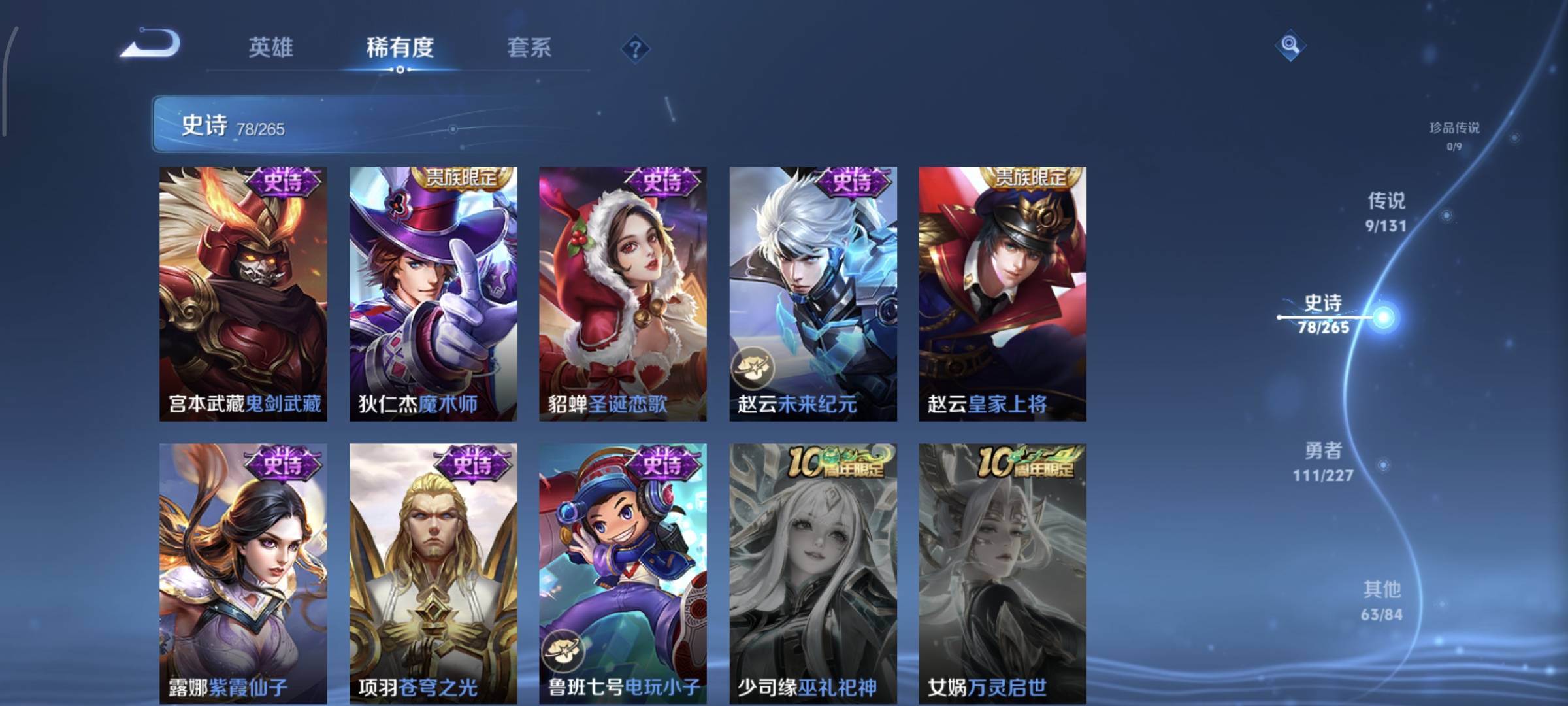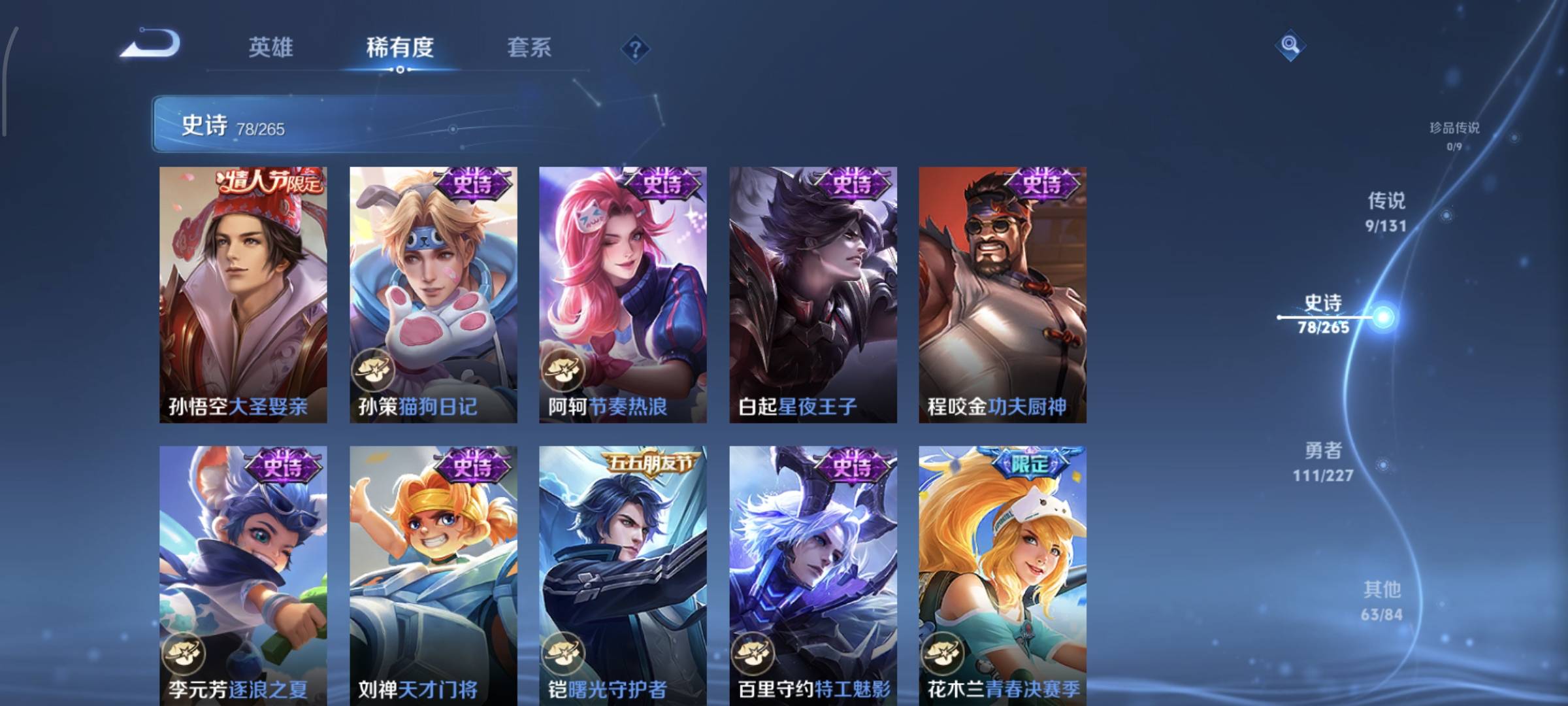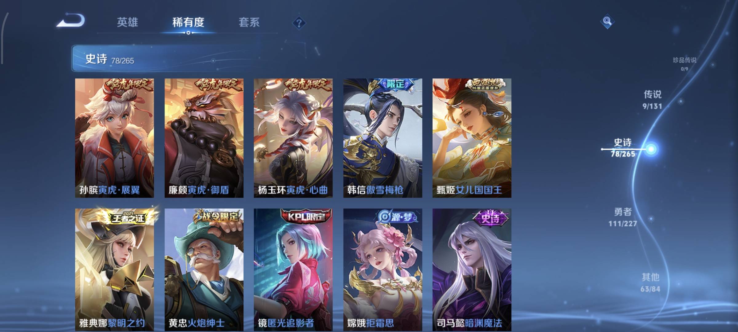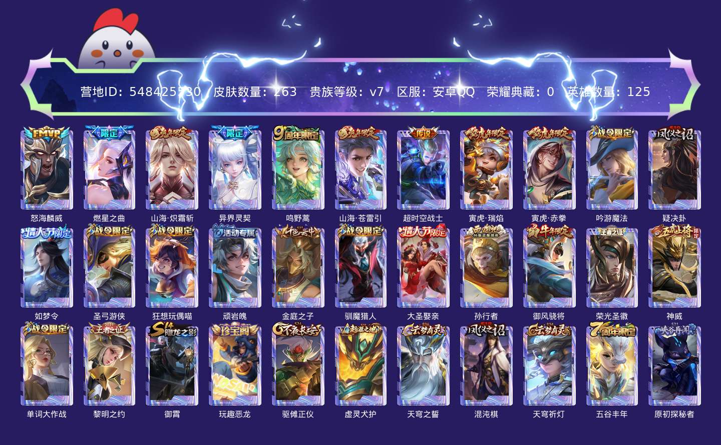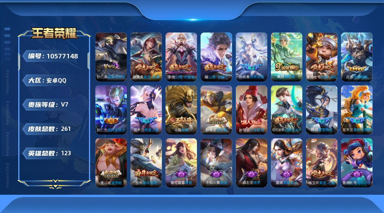 贵族等级:v7皮肤数:263情人节限定3 生肖限定9 传说品质9 英雄数:125