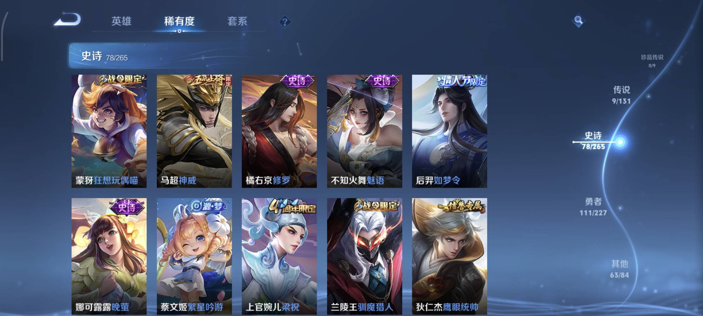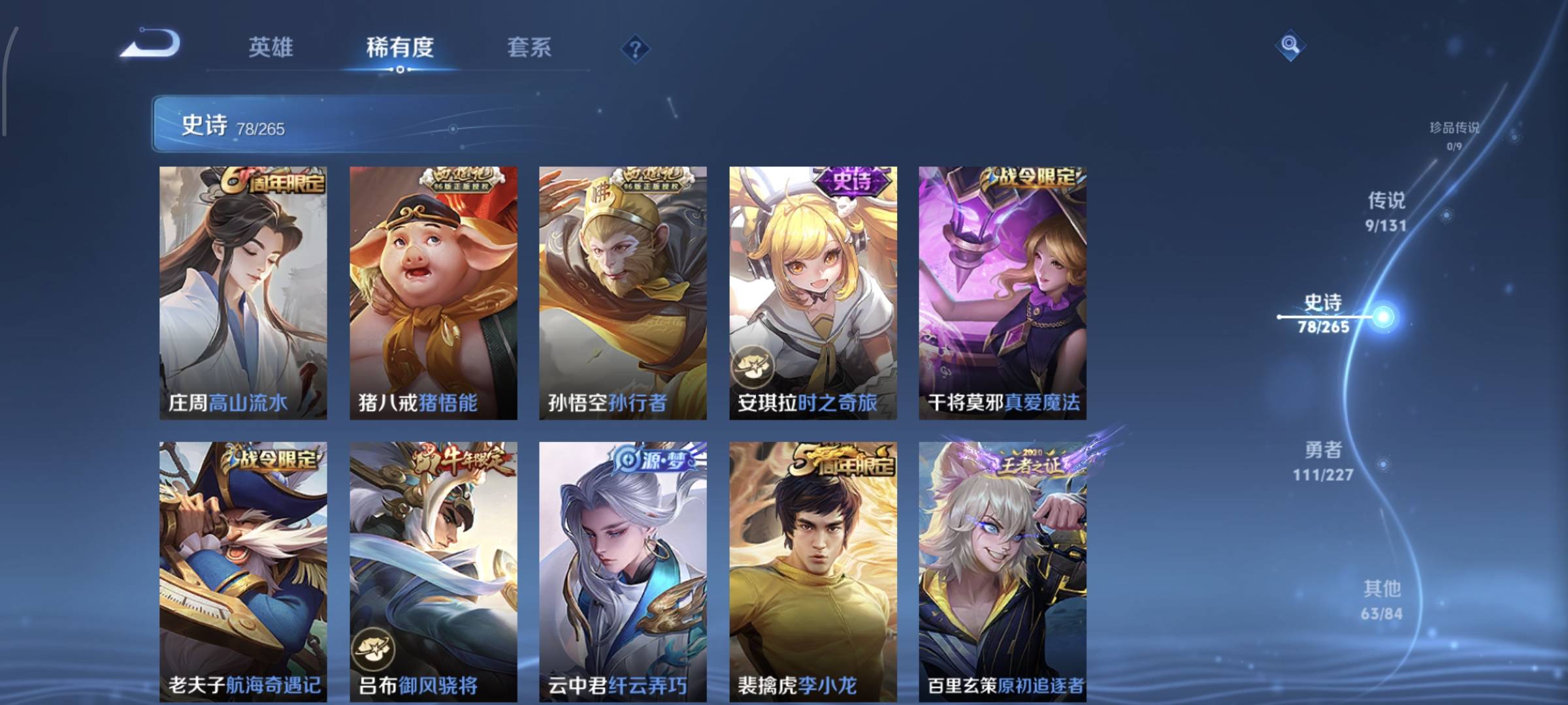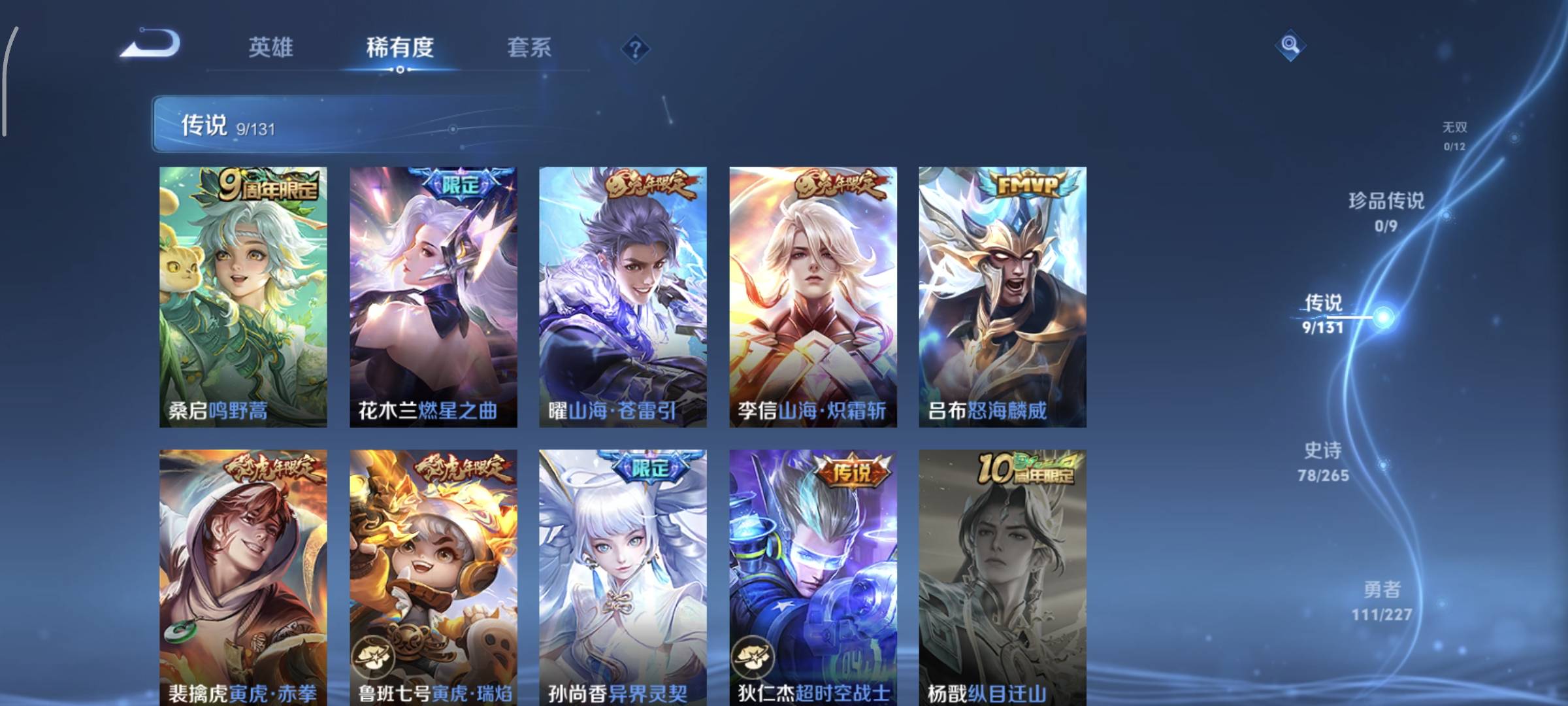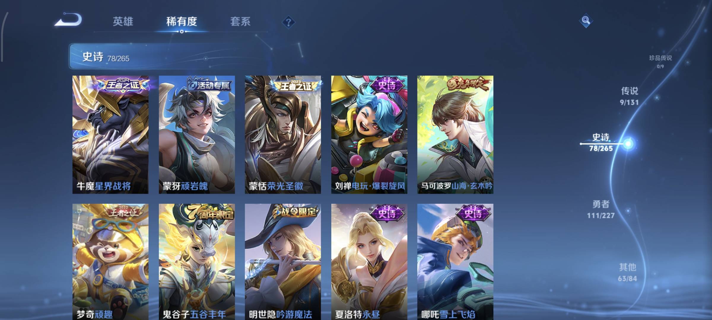 贵族等级:v7皮肤数:263情人节限定3 生肖限定9 传说品质9 英雄数:125