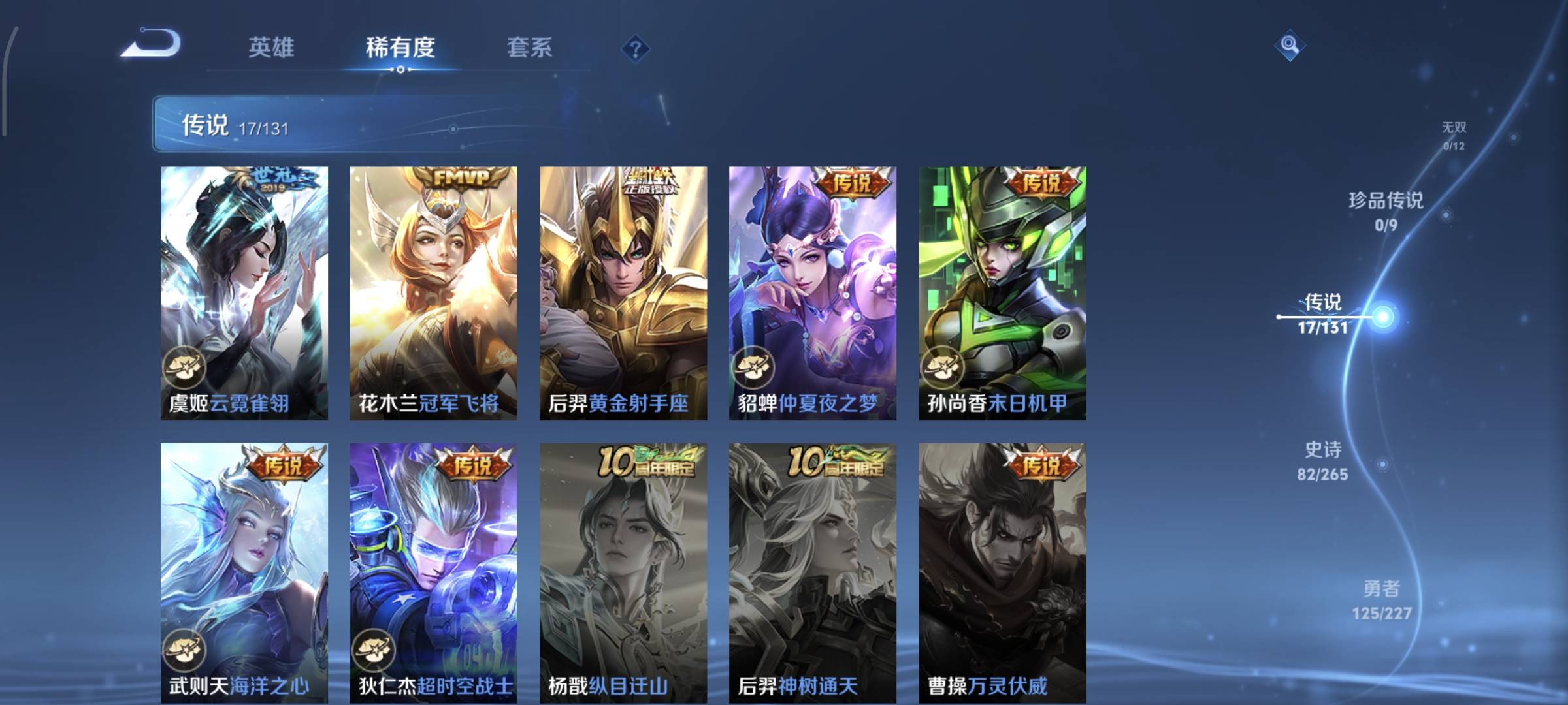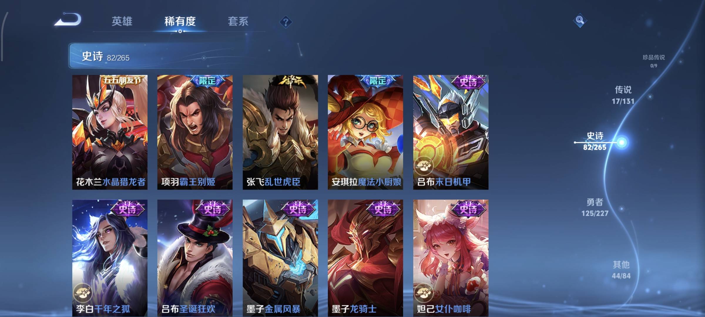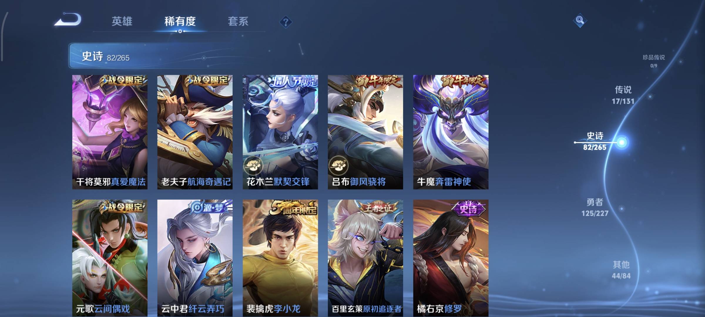贵族等级:v8皮肤数:270传说品质17 生肖限定7 情人节限定3 英雄数:128