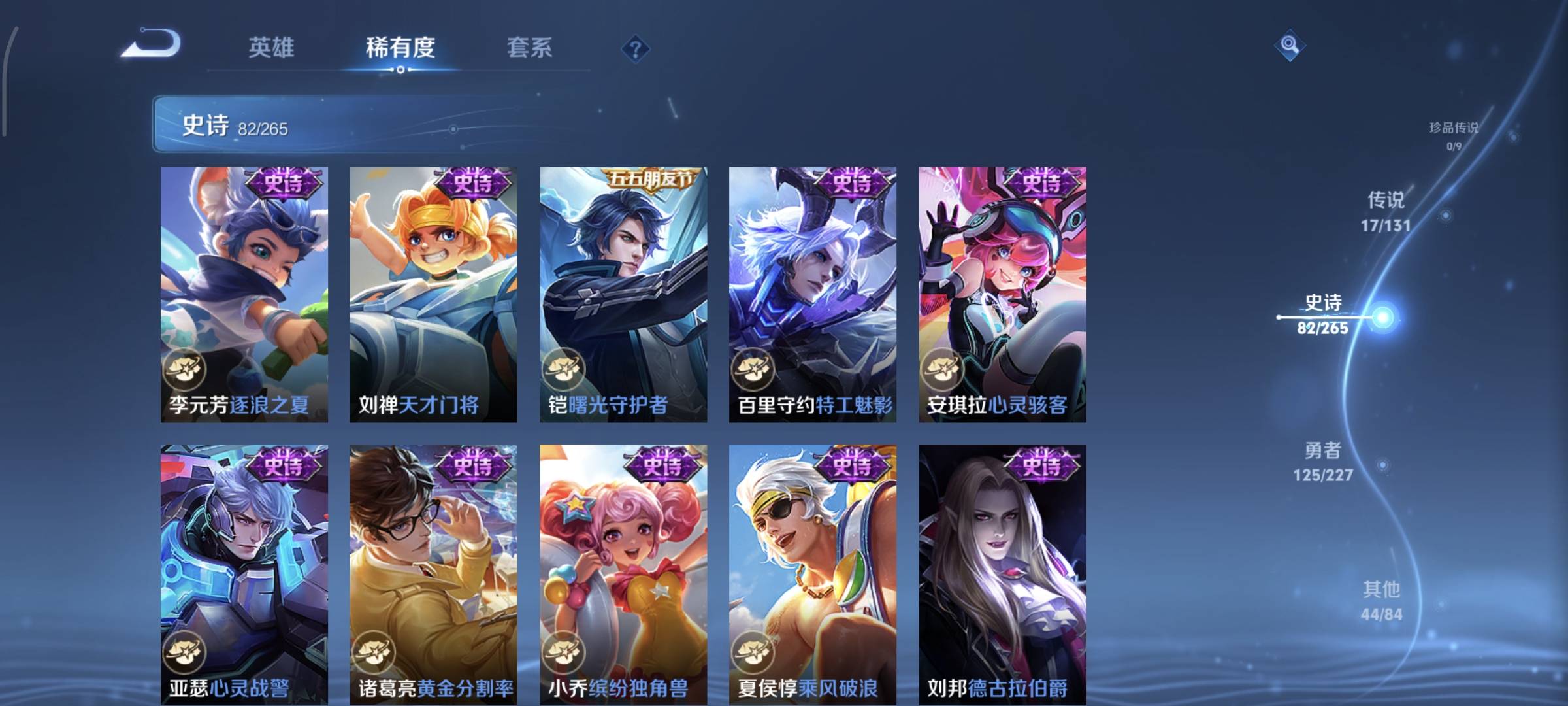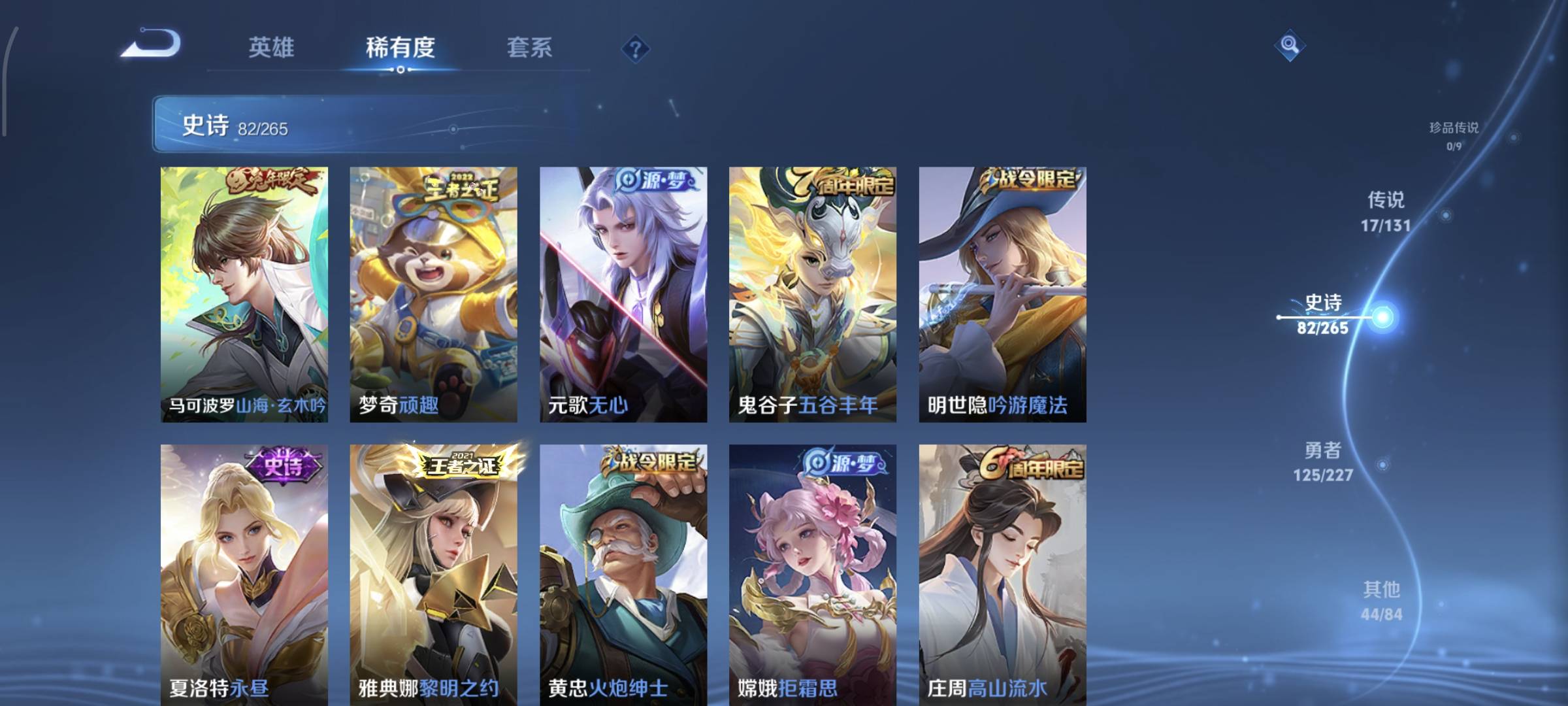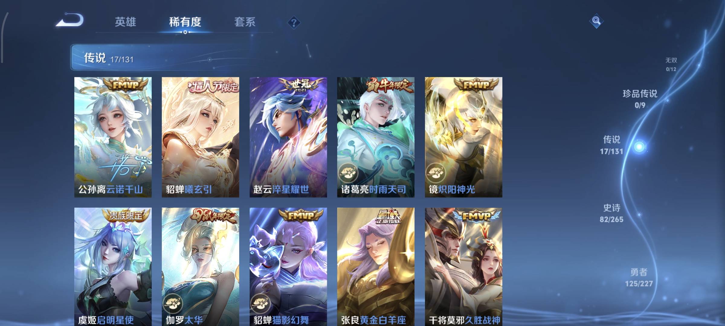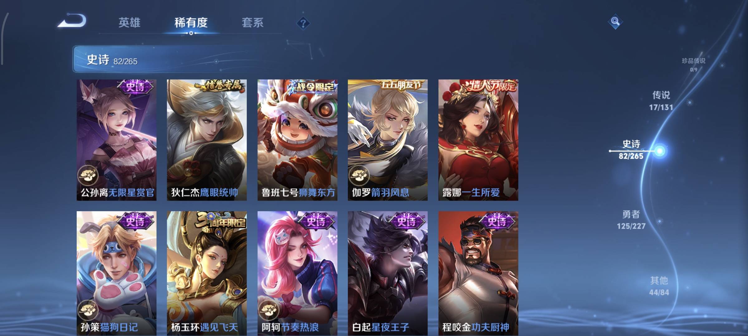 贵族等级:v8皮肤数:270传说品质17 生肖限定7 情人节限定3 英雄数:128