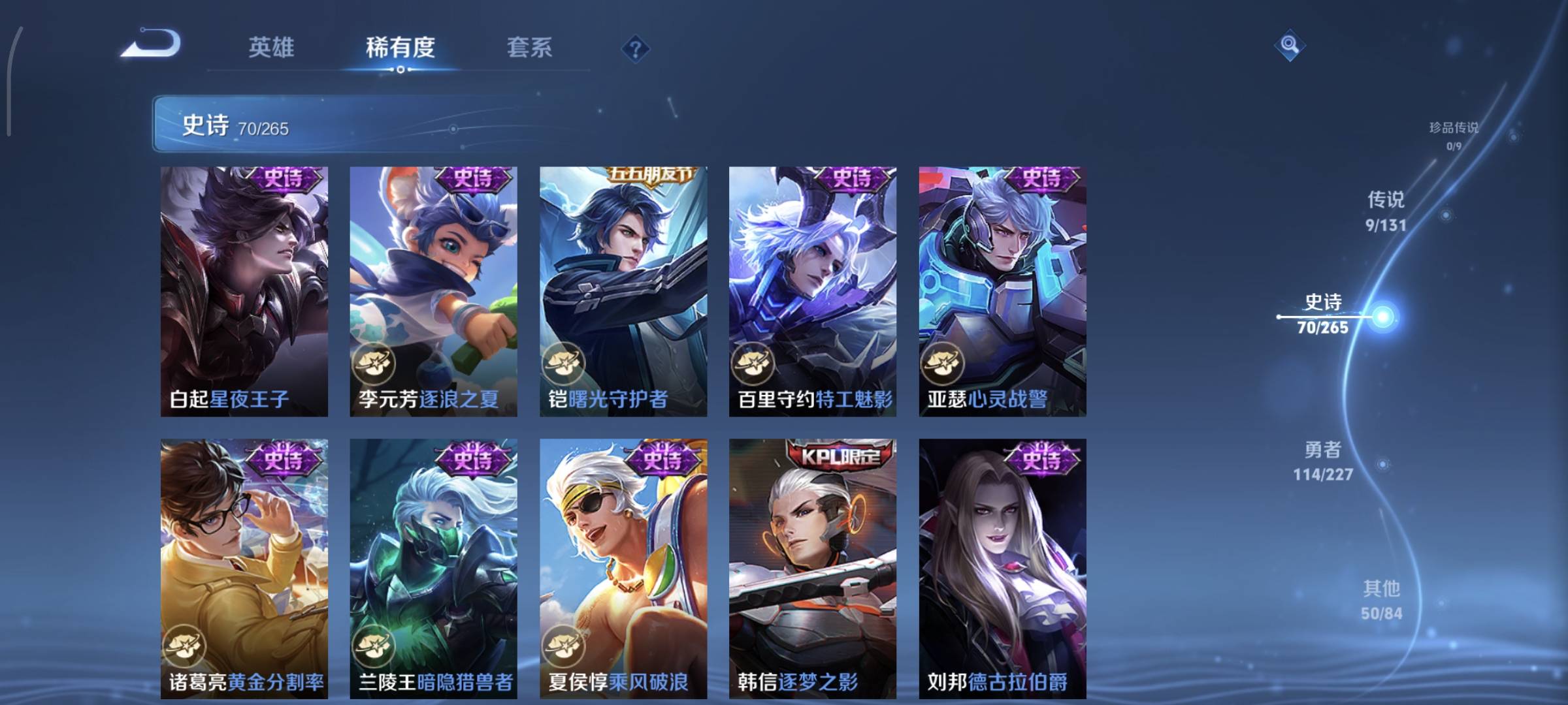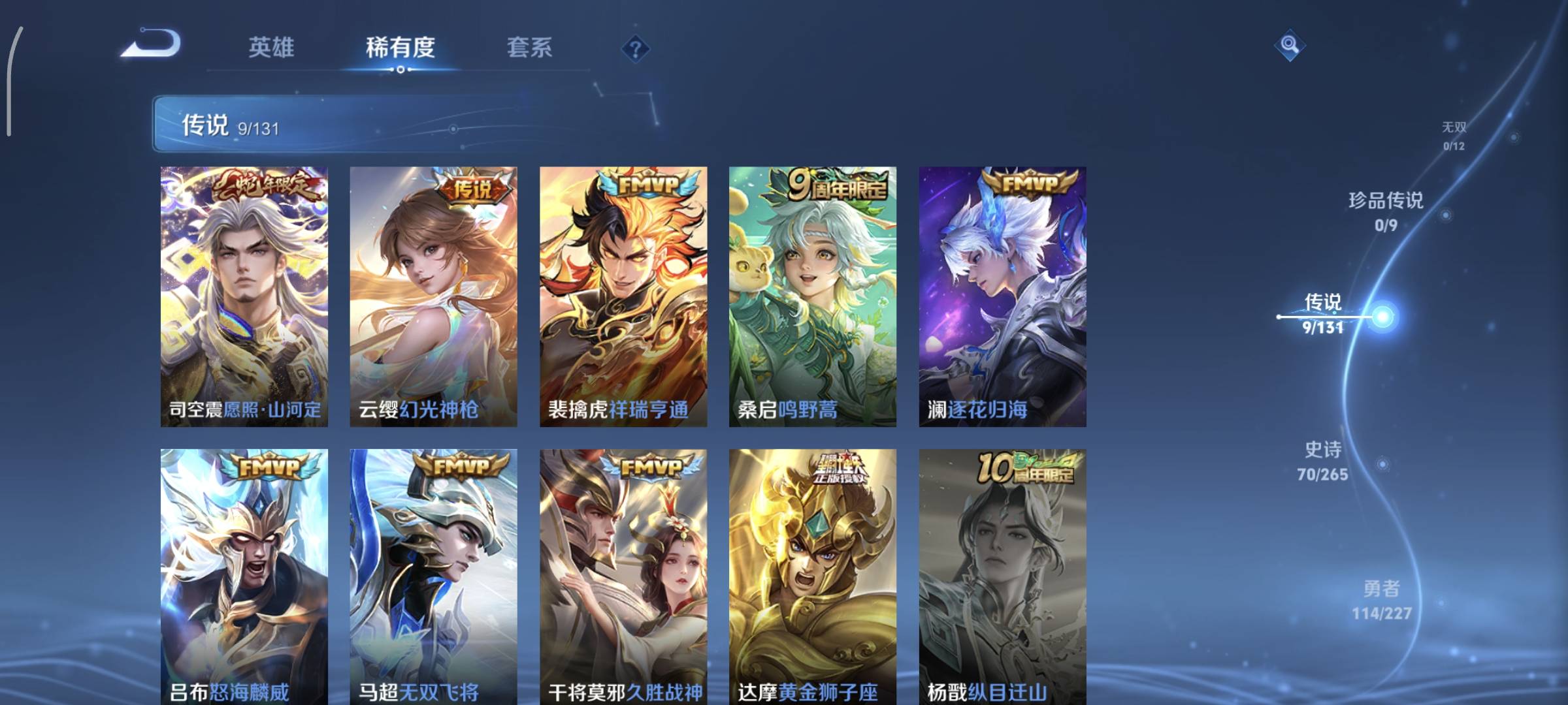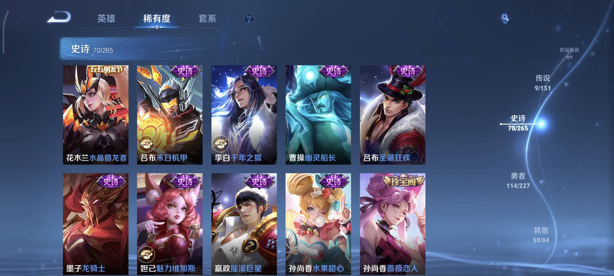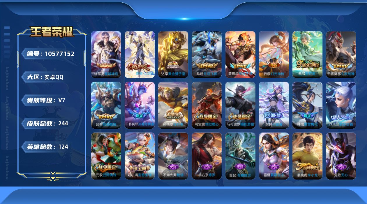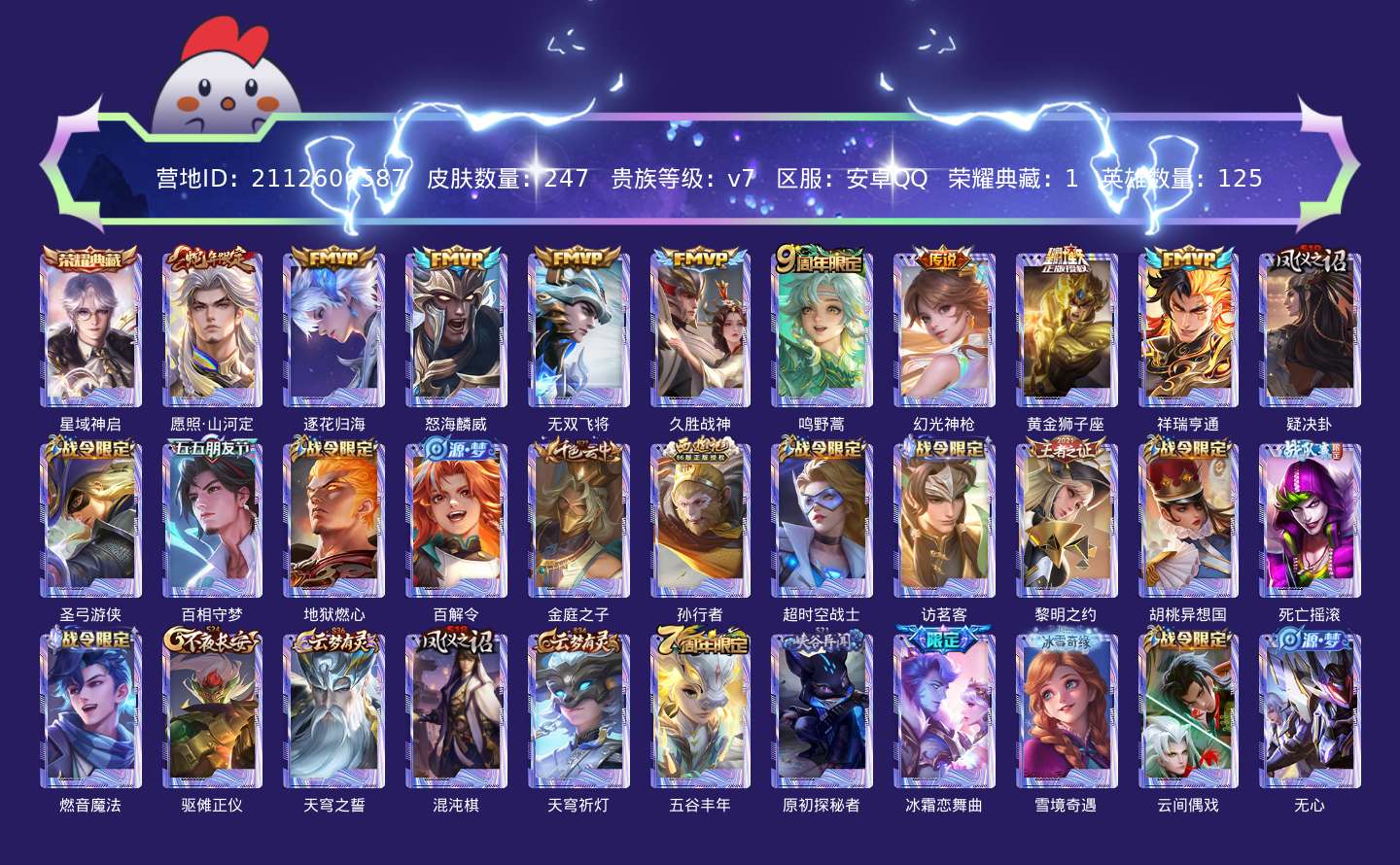 贵族等级:v7皮肤数:247传说品质9 生肖限定1 荣耀典藏1 情人节限定1 英雄数:125