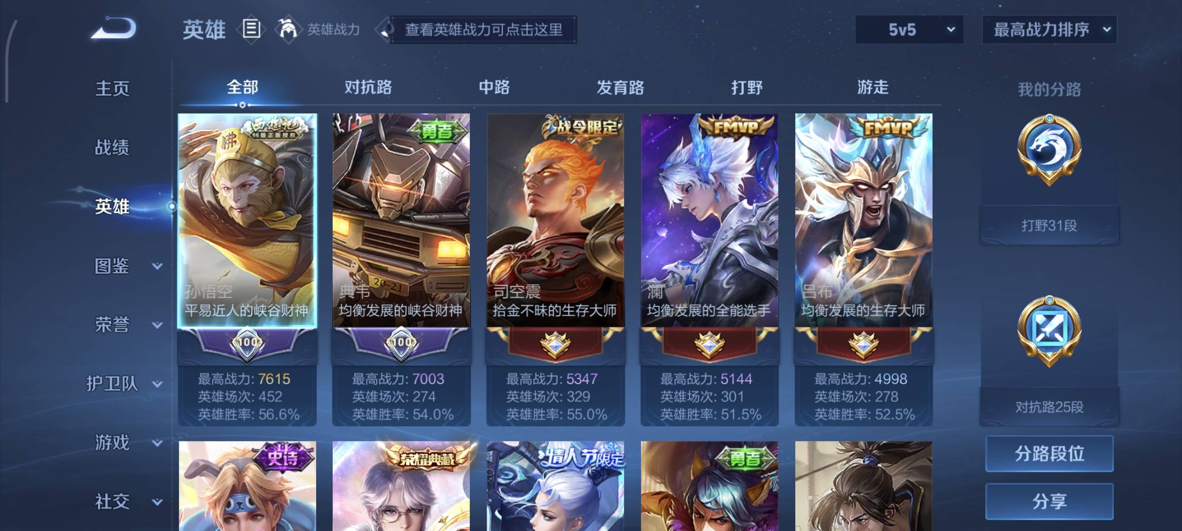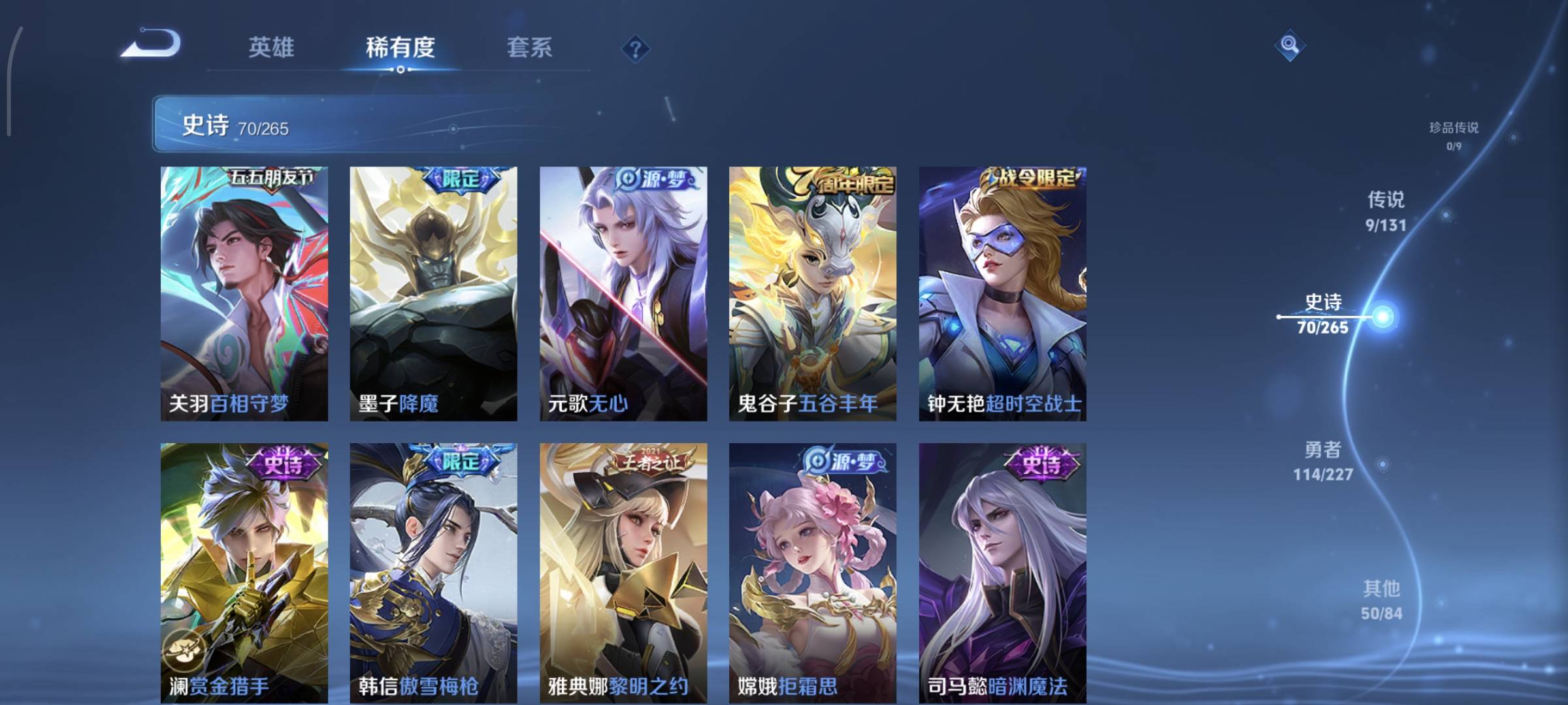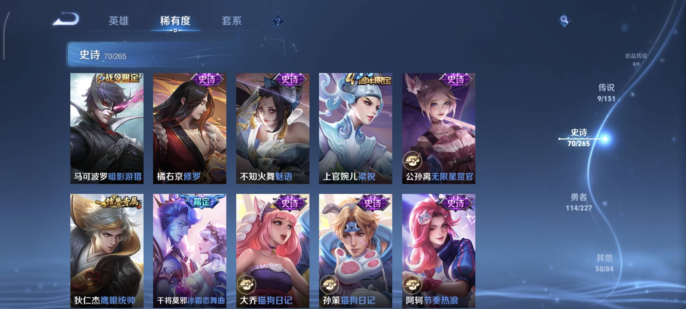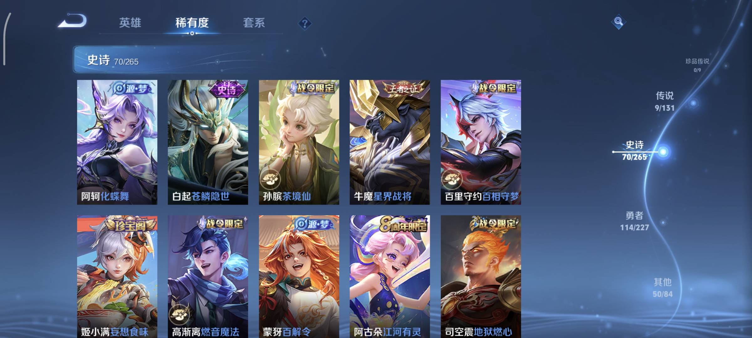 贵族等级:v7皮肤数:247传说品质9 生肖限定1 荣耀典藏1 情人节限定1 英雄数:125