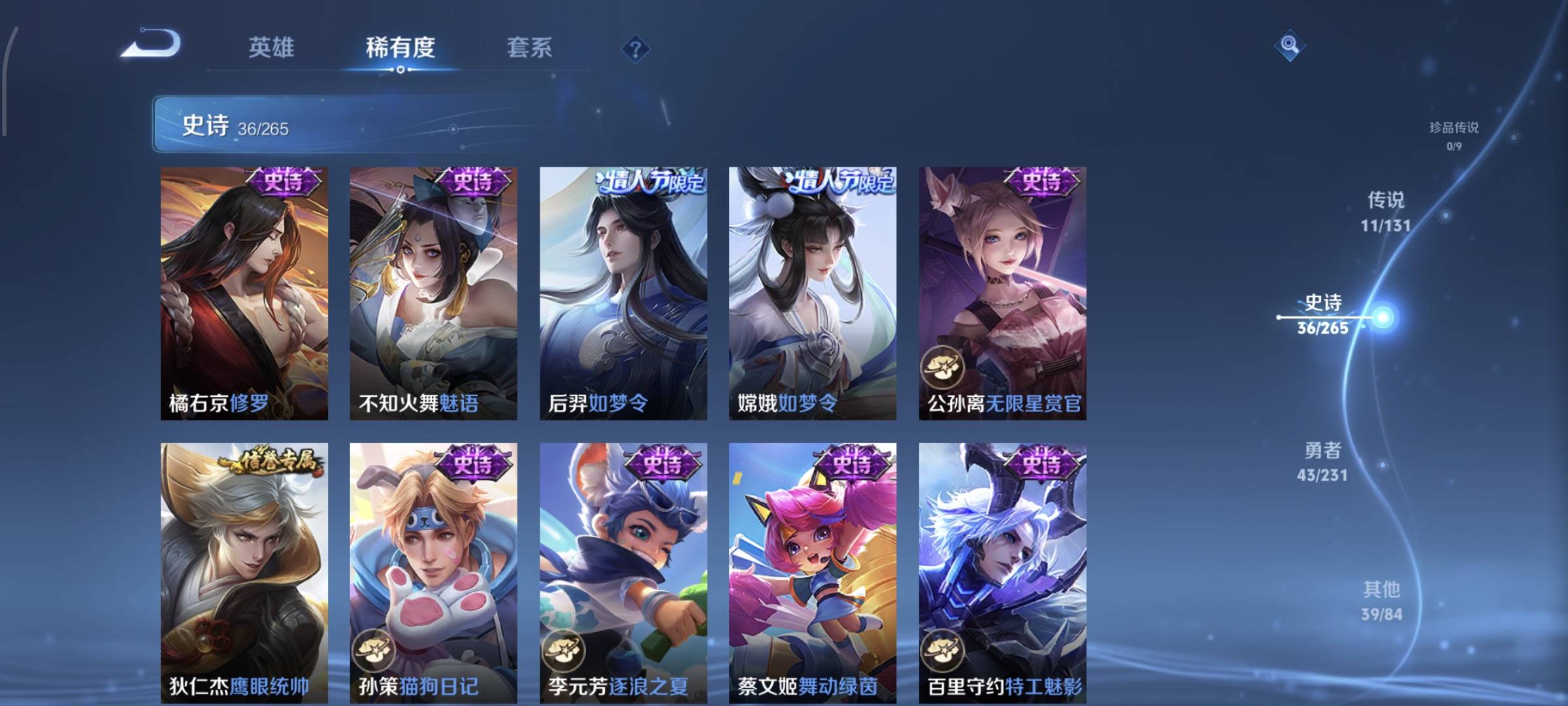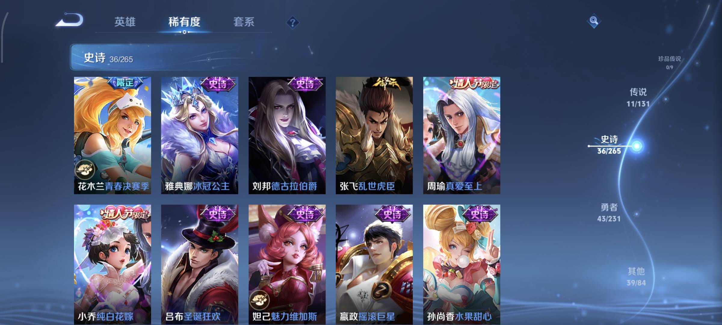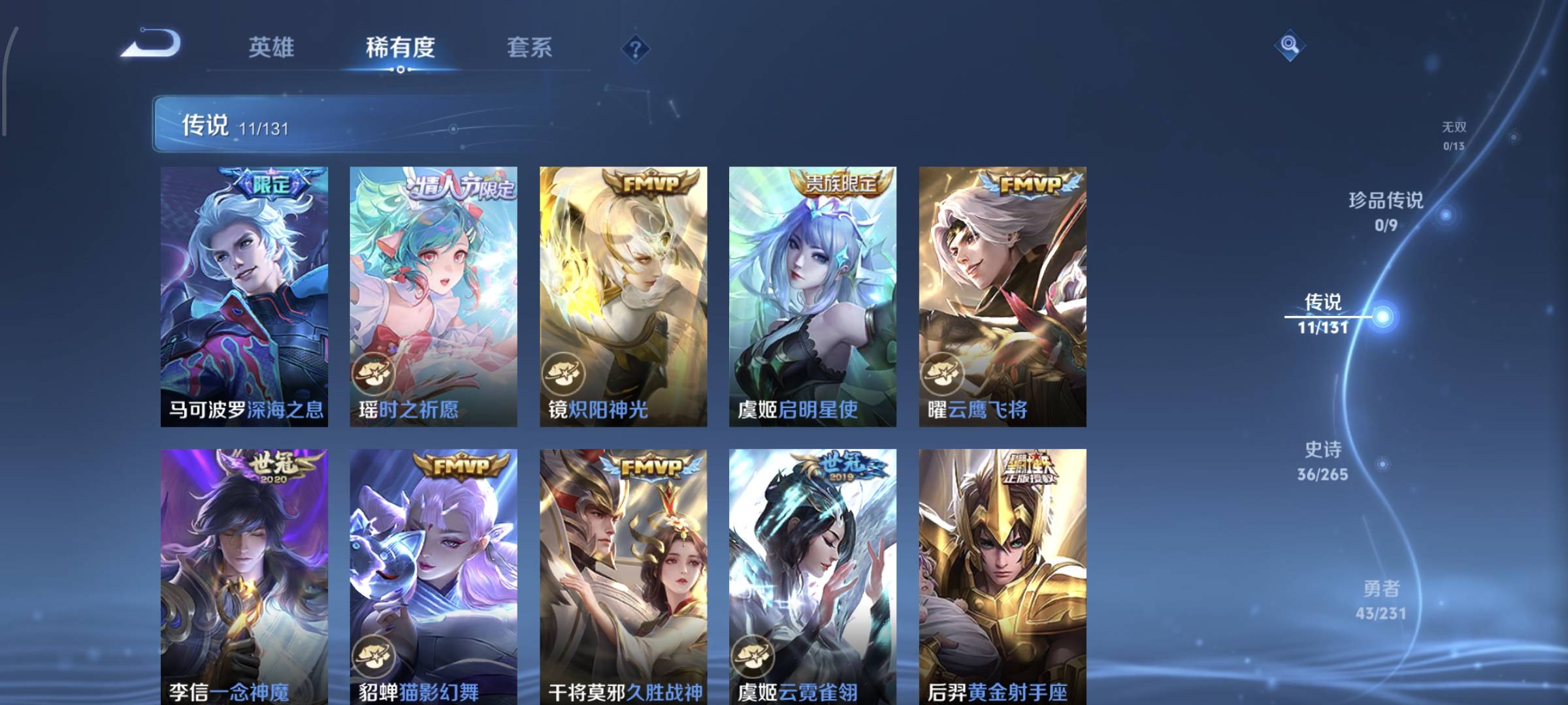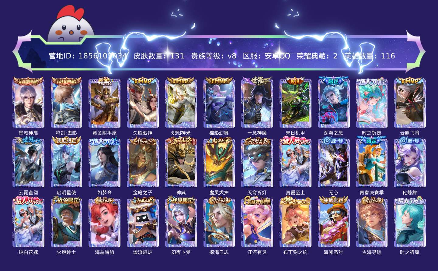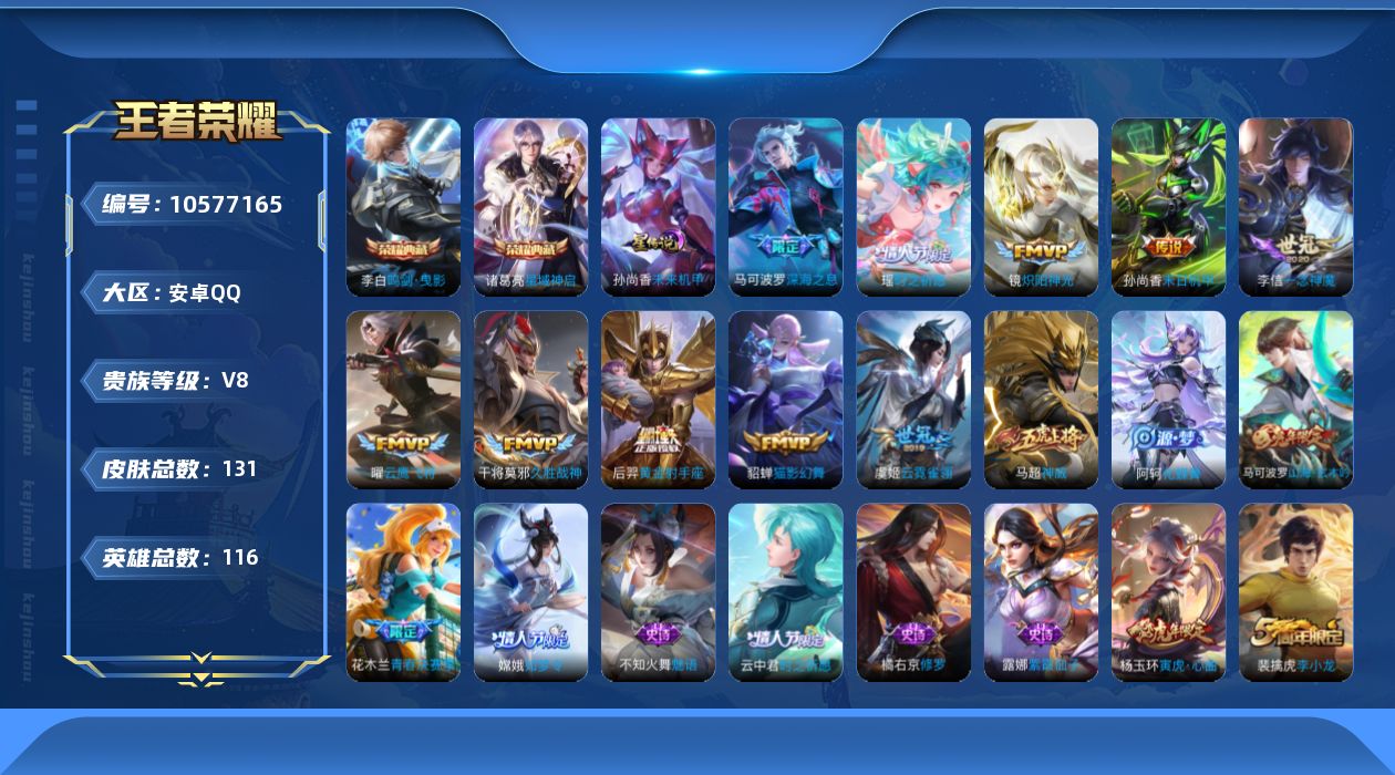 贵族等级:v8皮肤数:131传说品质11 情人节限定6 荣耀典藏2 生肖限定2 英雄数:116