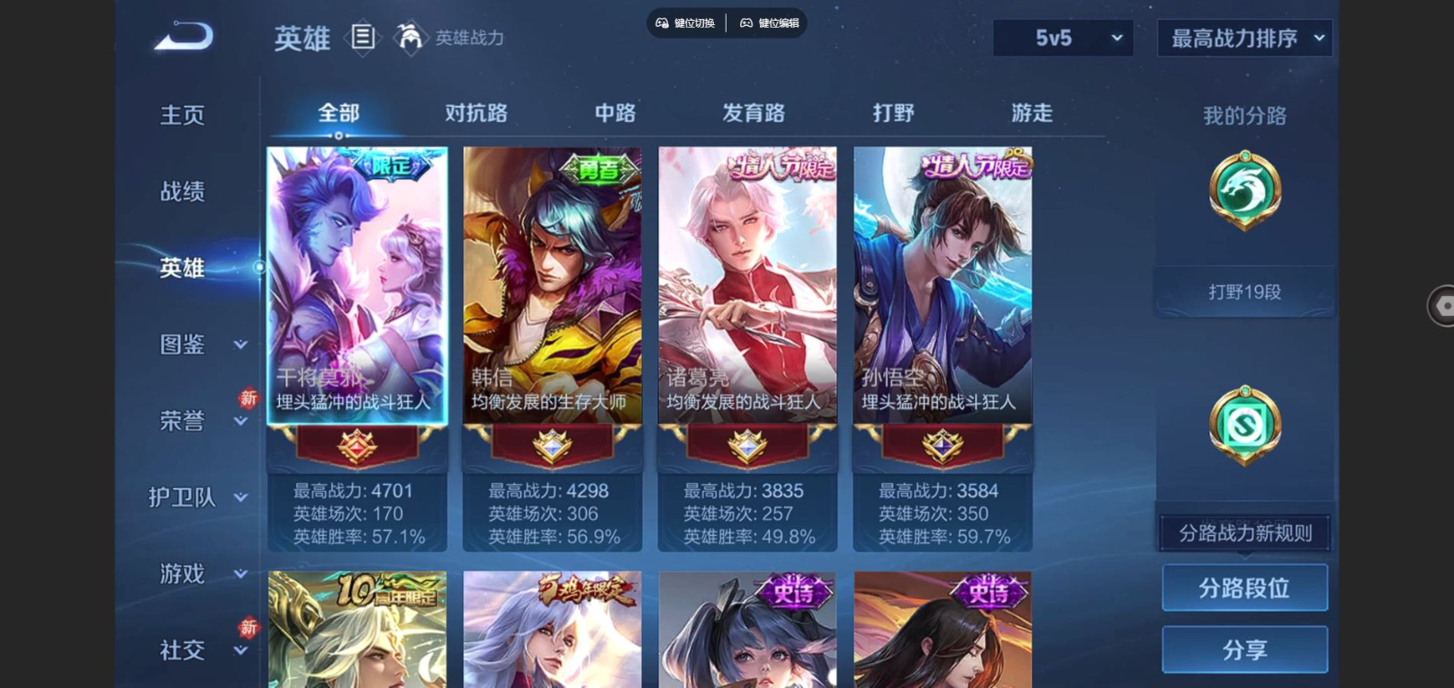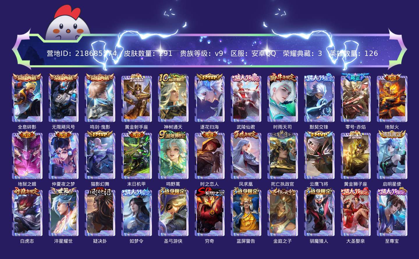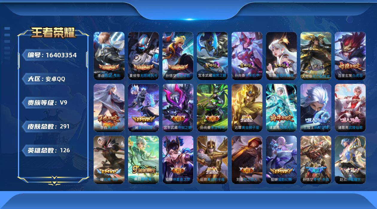 贵族等级:v9皮肤数:291传说品质21 情人节限定8 生肖限定6 荣耀典藏3 英雄数:126