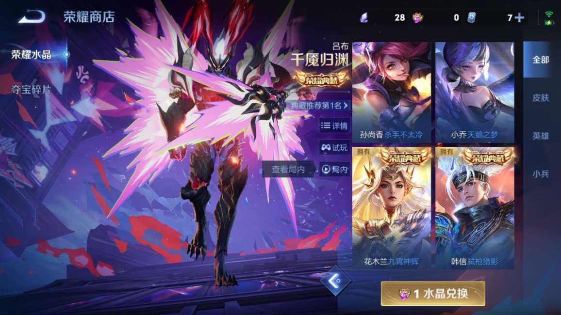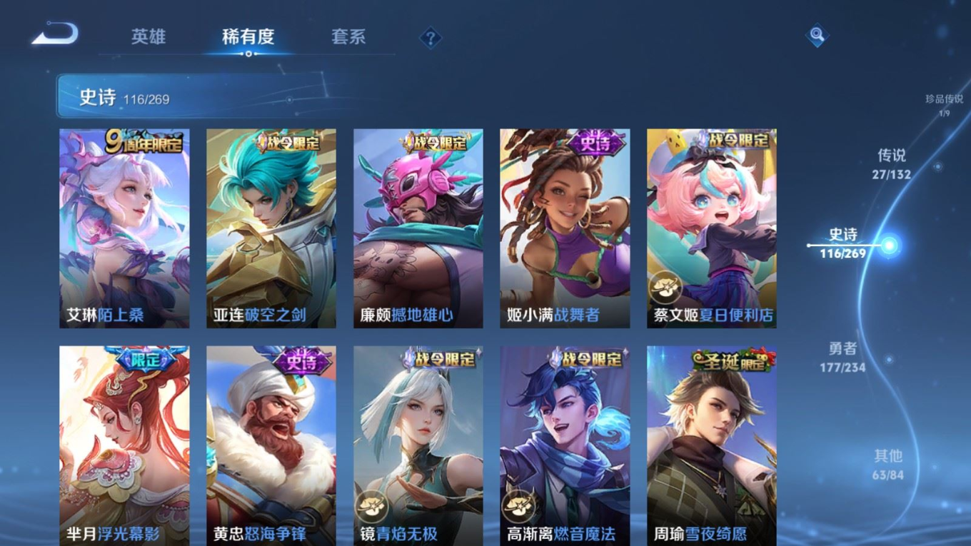 贵族等级:v8皮肤数:386情人节限定3 传说品质27 生肖限定7 荣耀典藏2 珍品传说1 英雄数:128