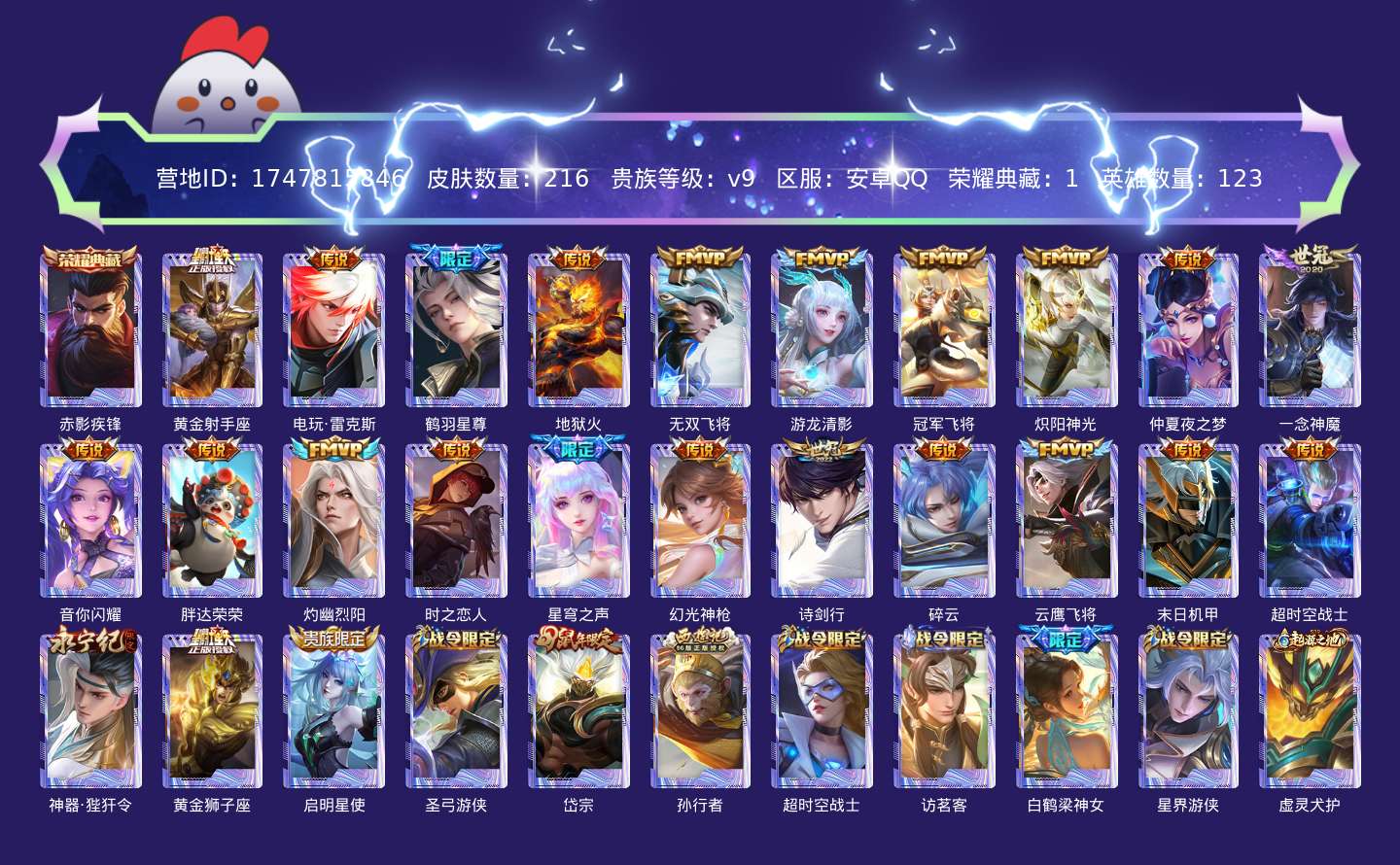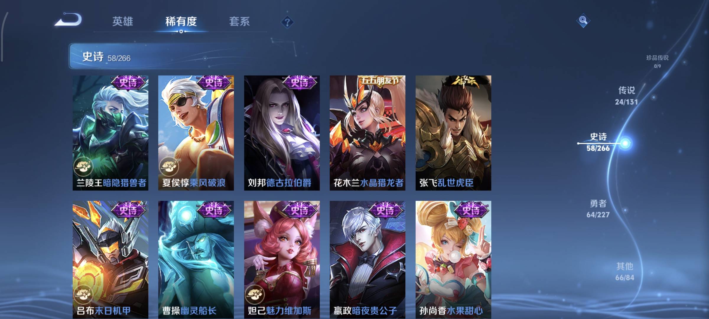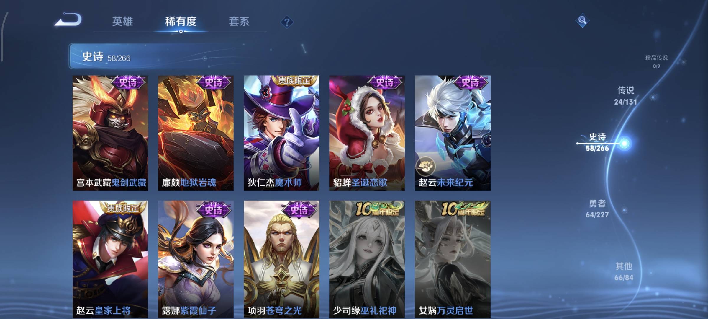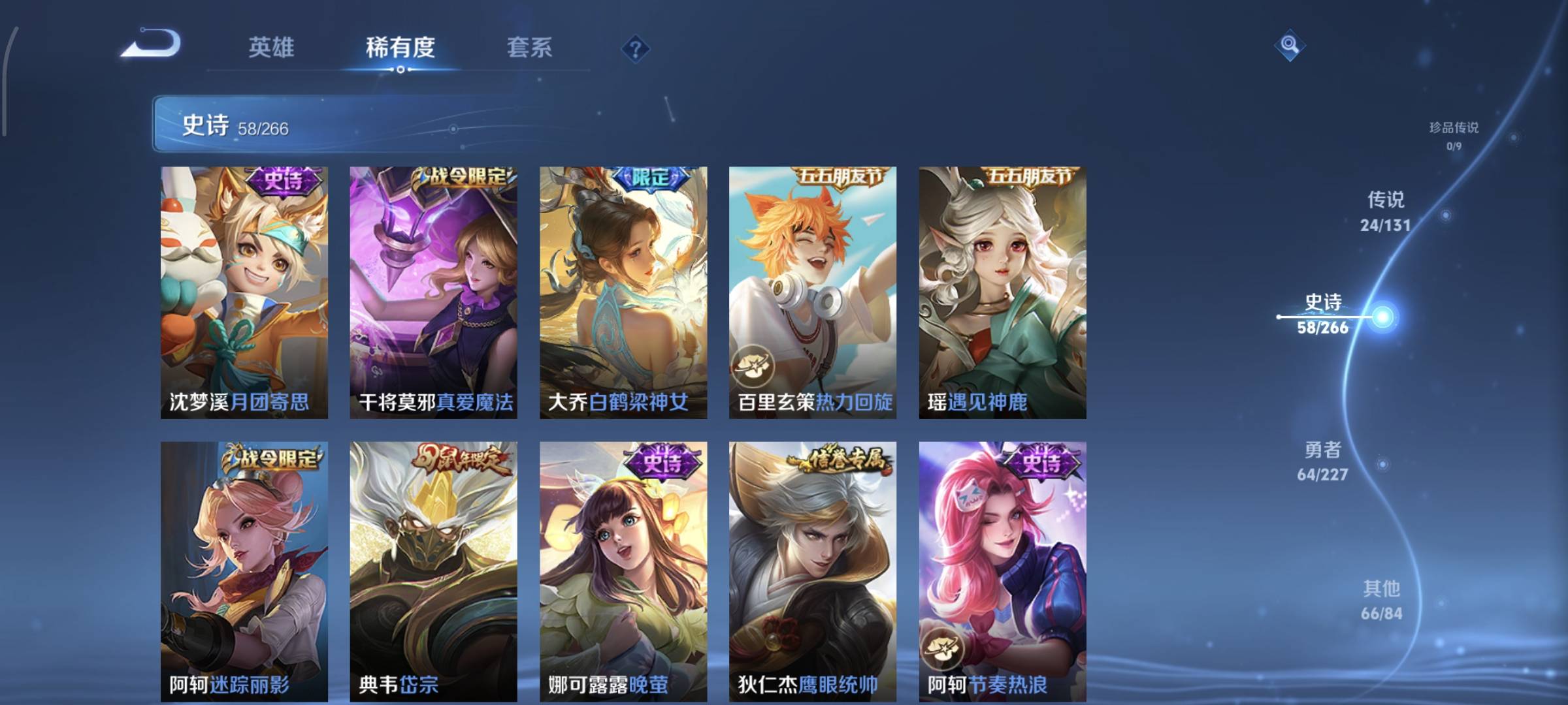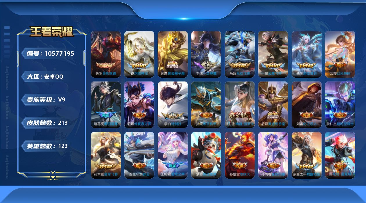贵族等级:v9皮肤数:216传说品质24 荣耀典藏1 生肖限定1 英雄数:123