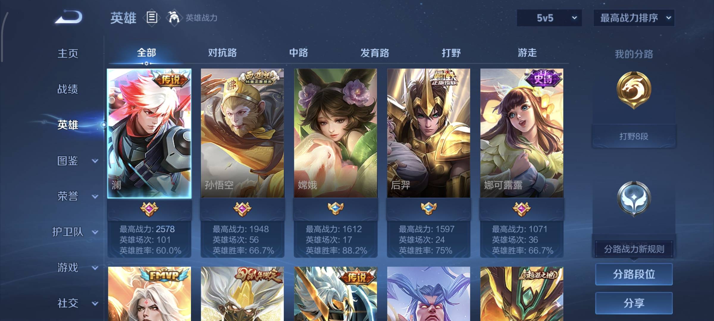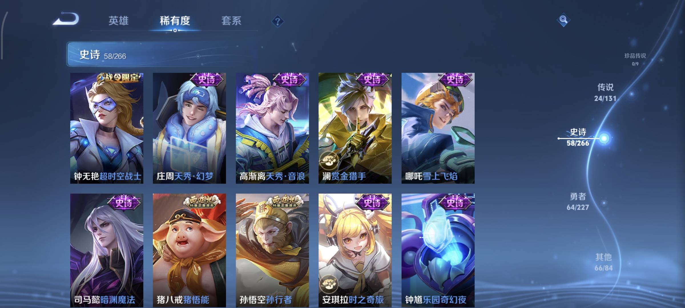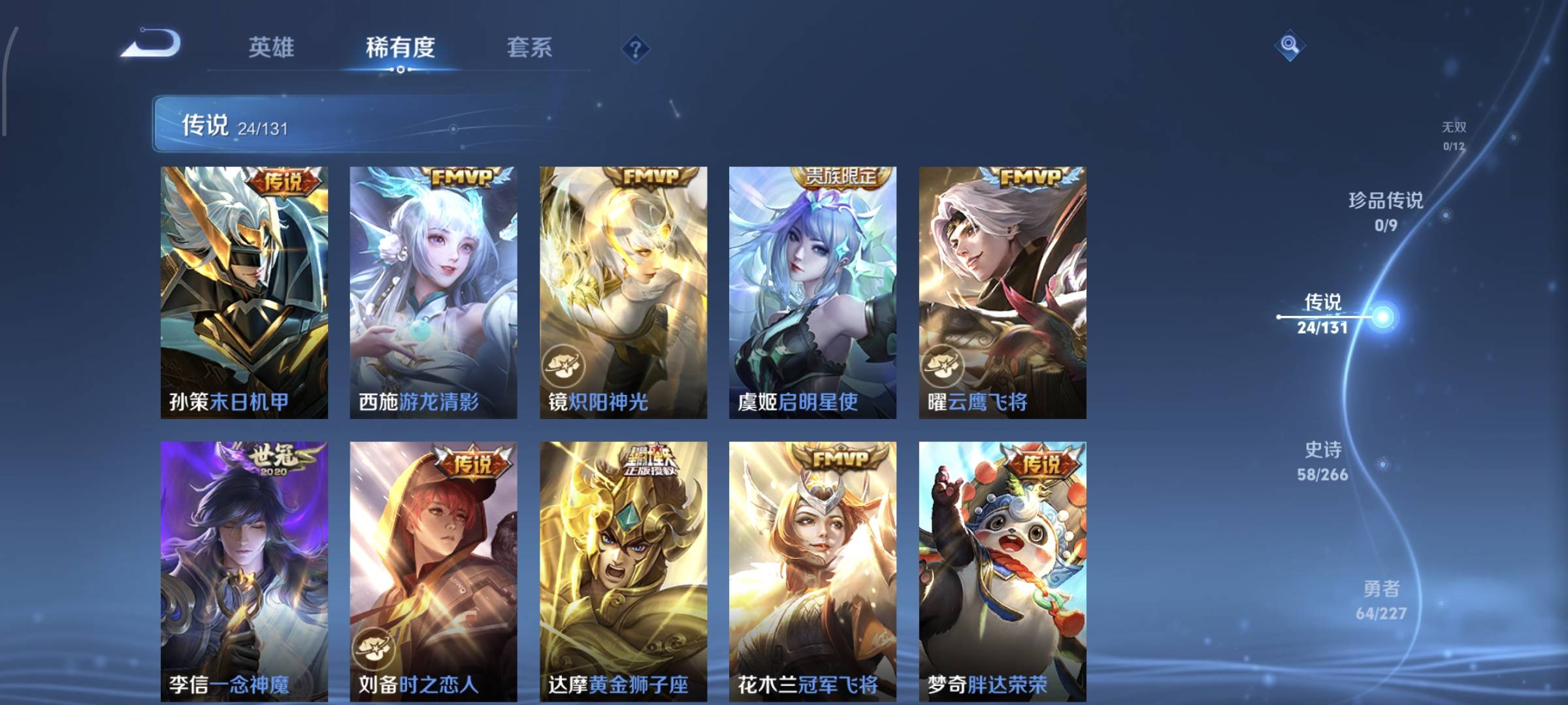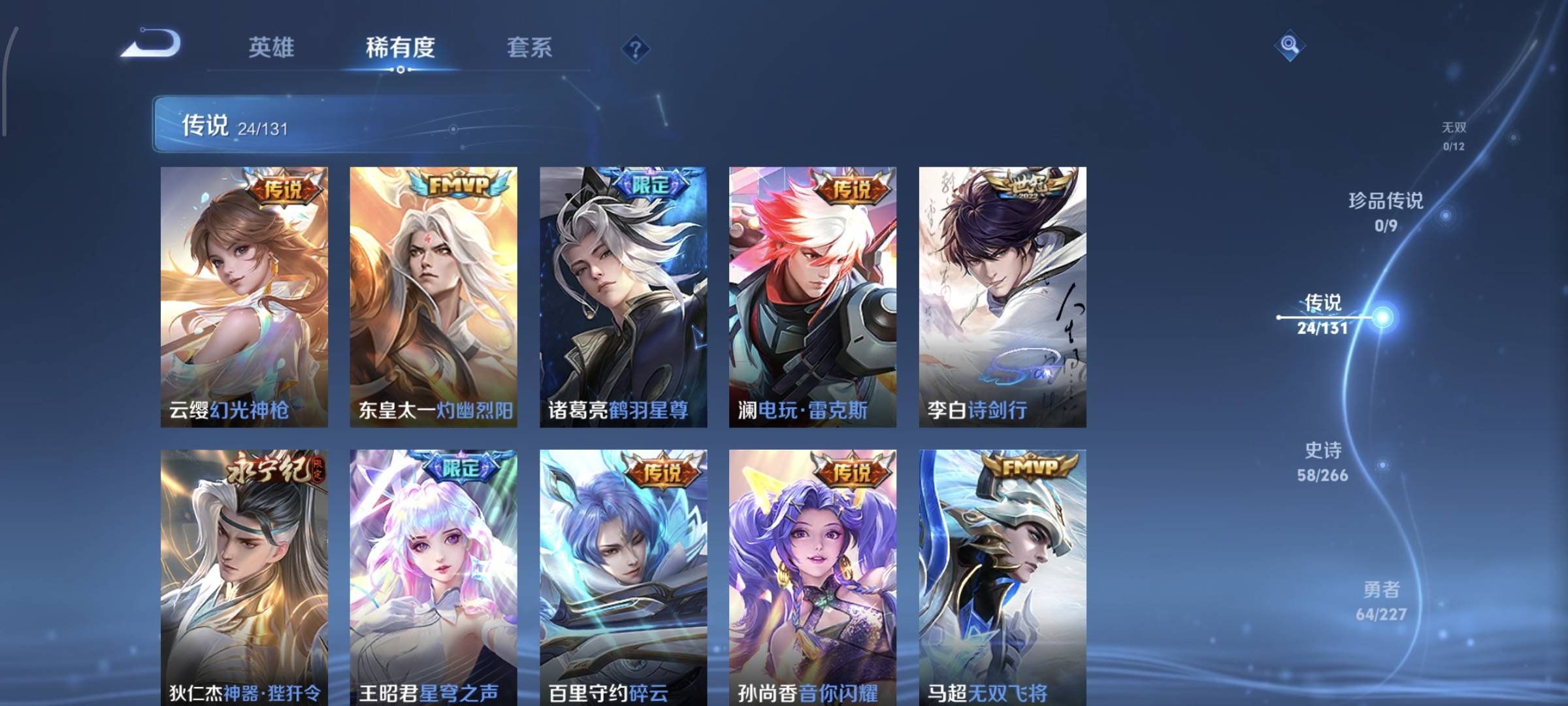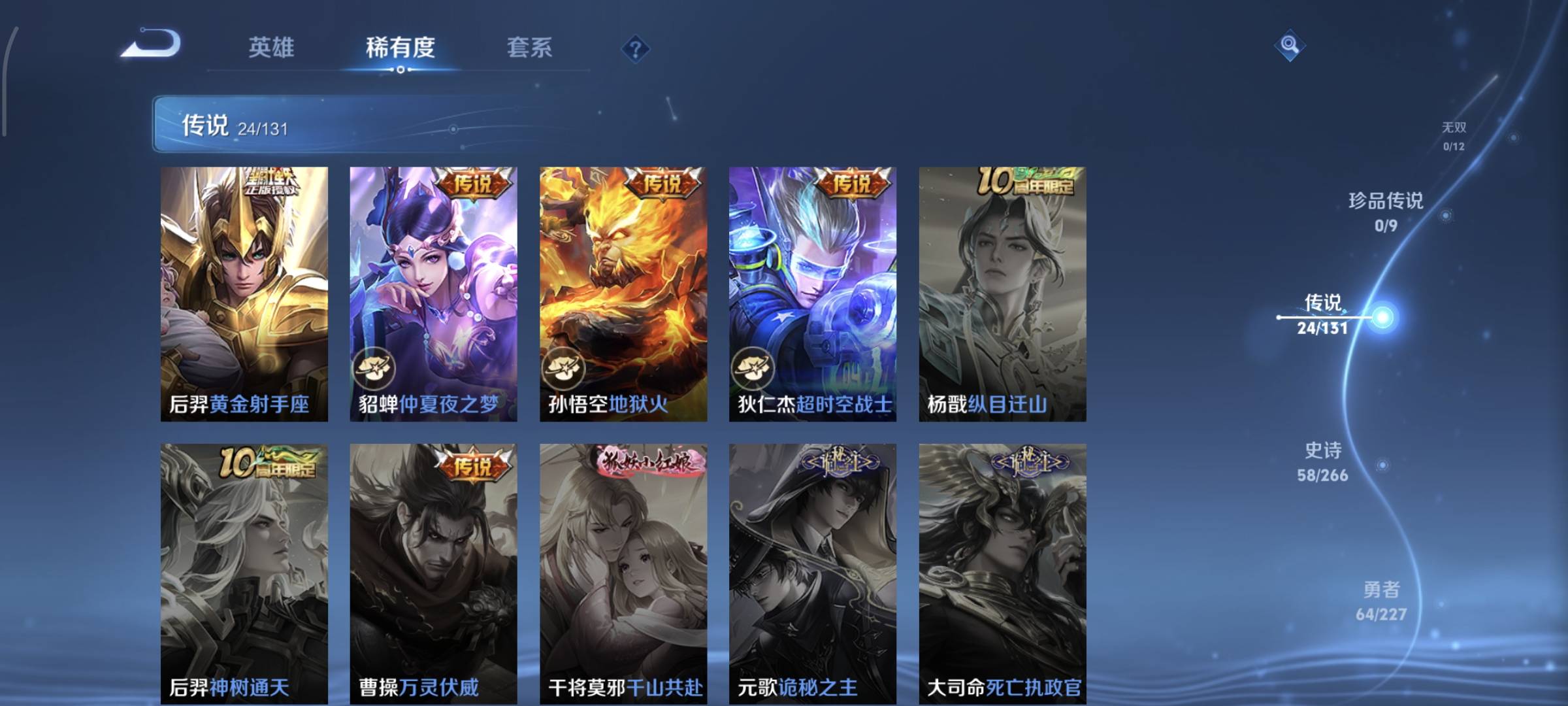 贵族等级:v9皮肤数:216传说品质24 荣耀典藏1 生肖限定1 英雄数:123