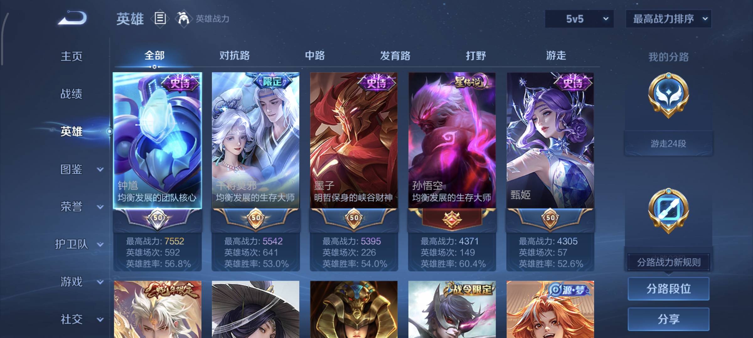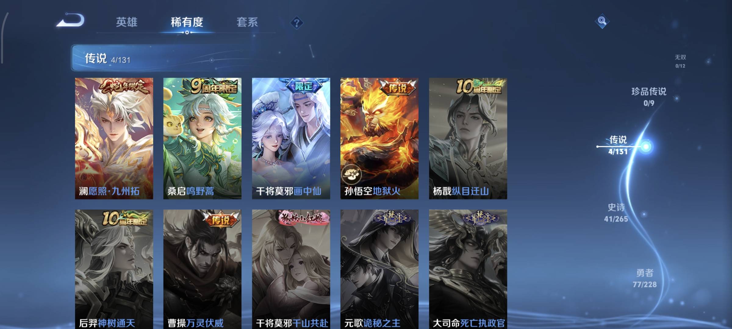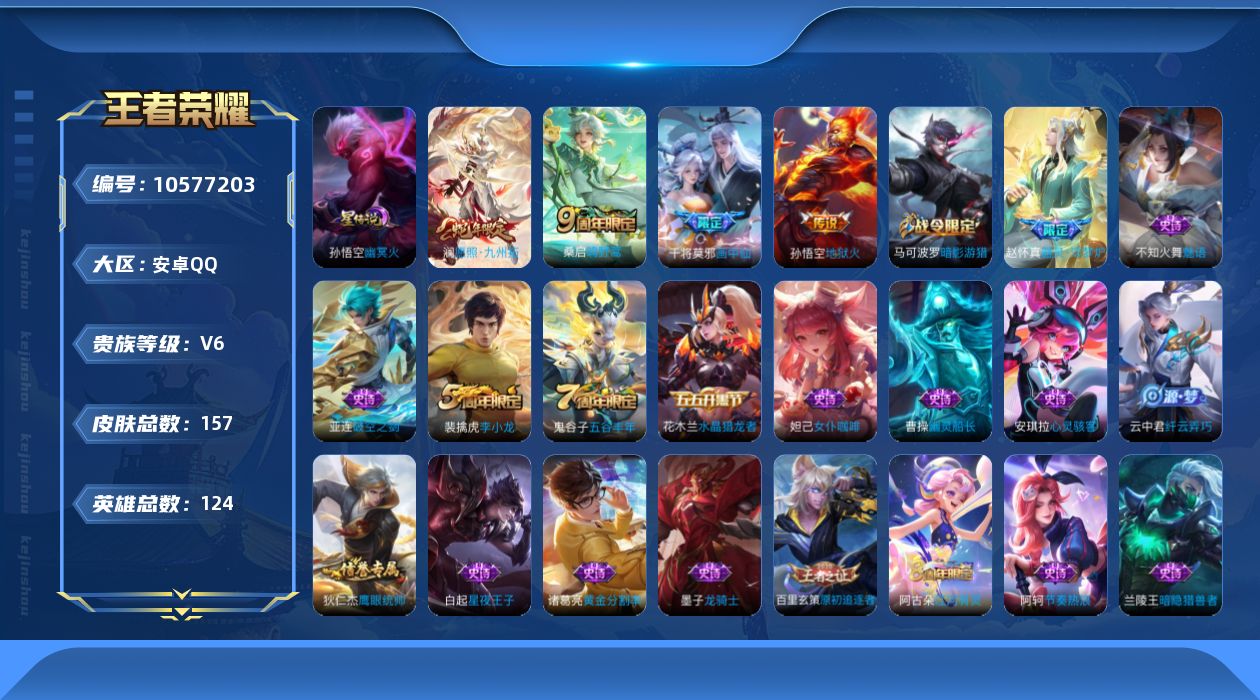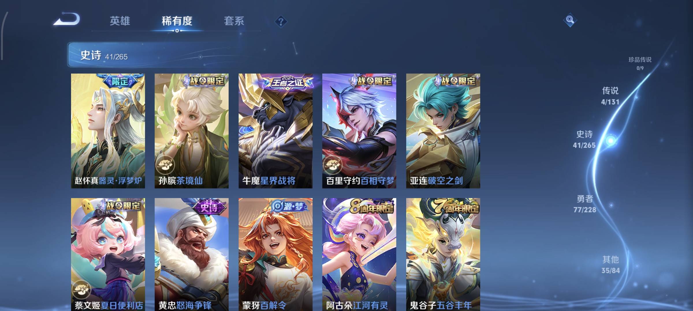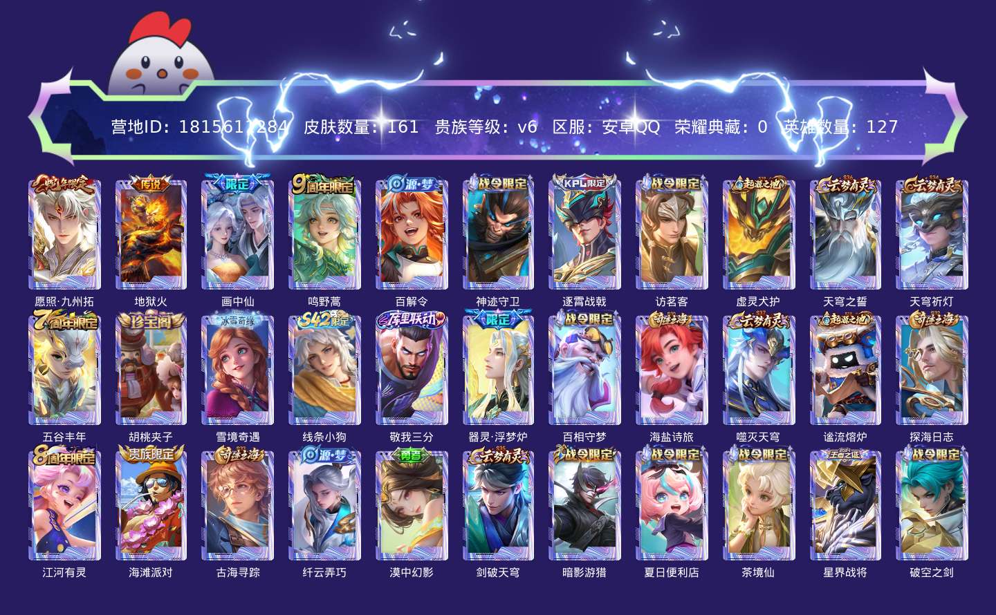 贵族等级:v6皮肤数:161传说品质4 生肖限定1 英雄数:127