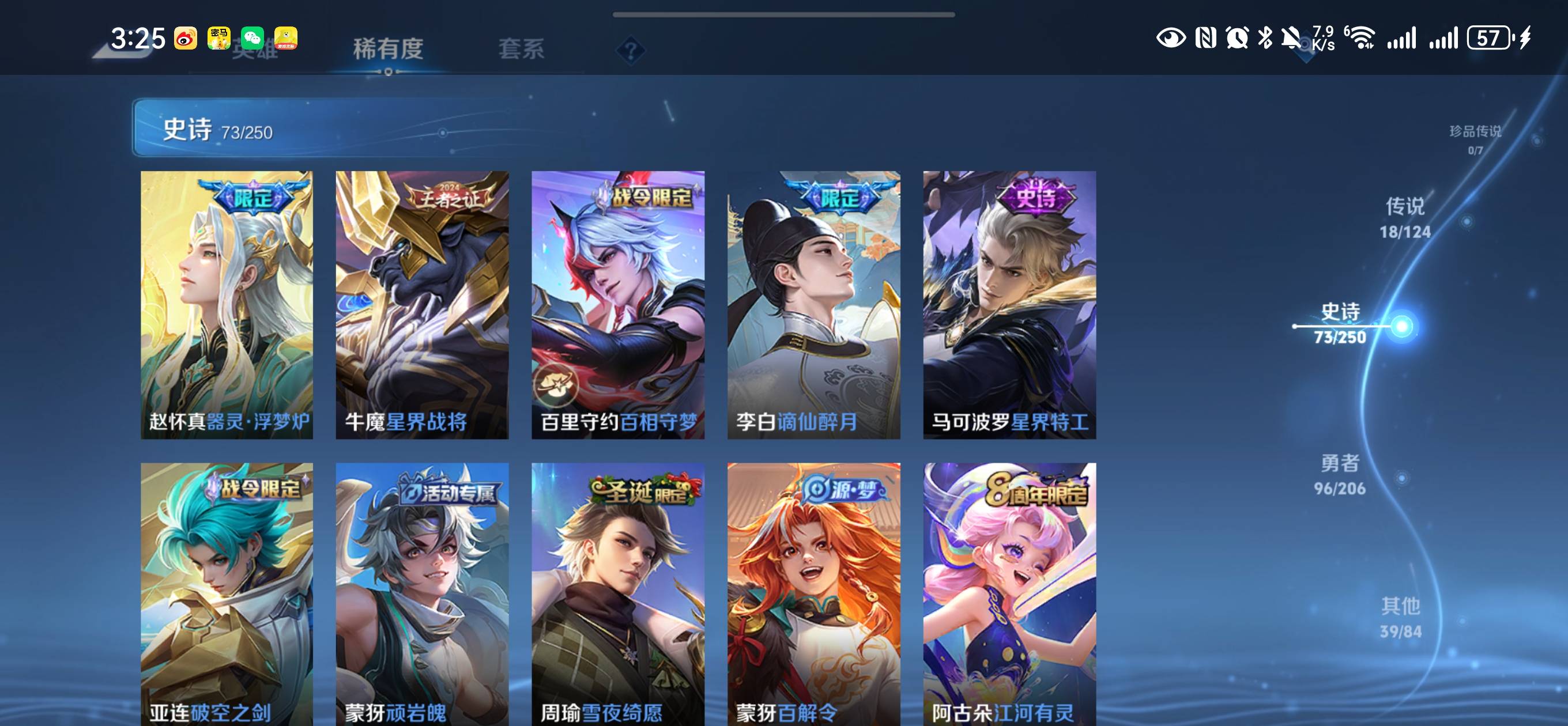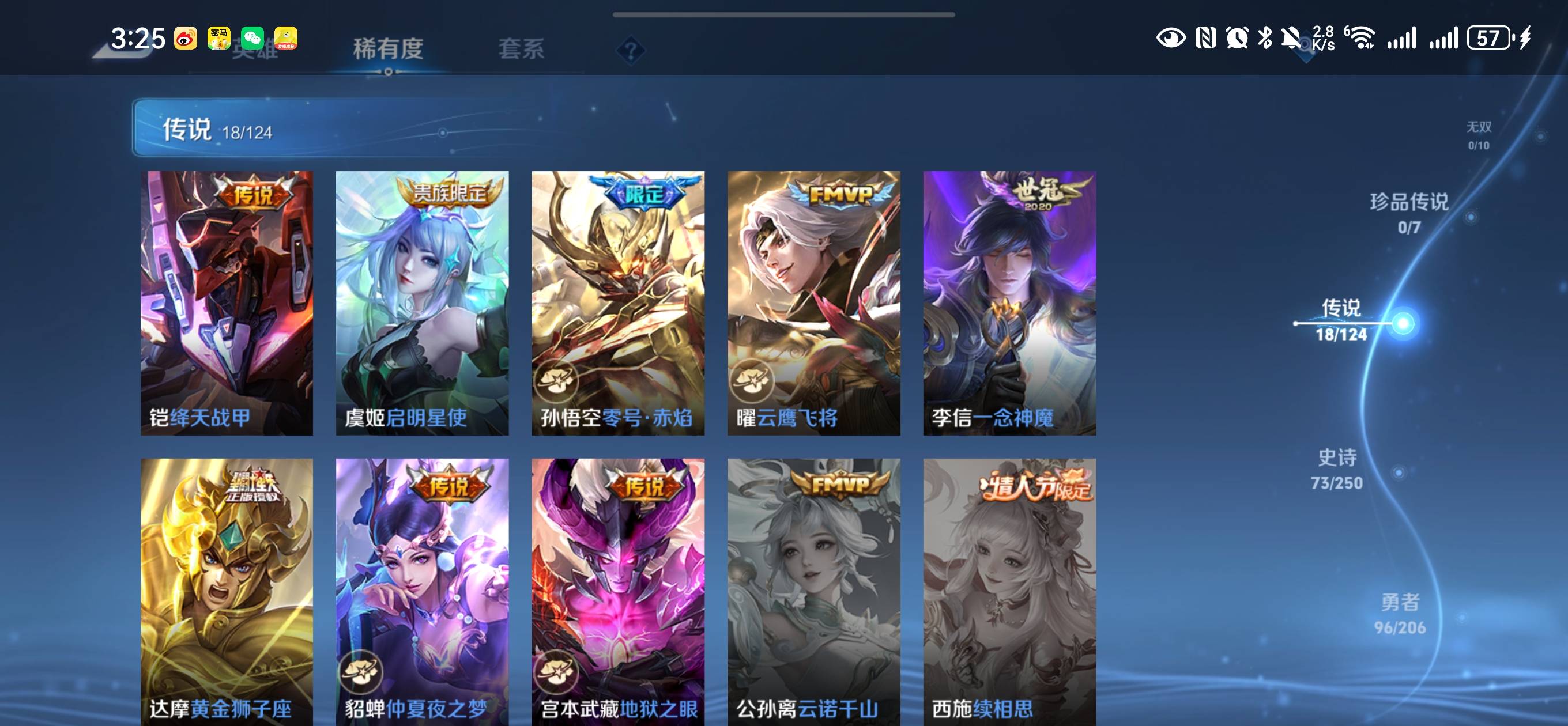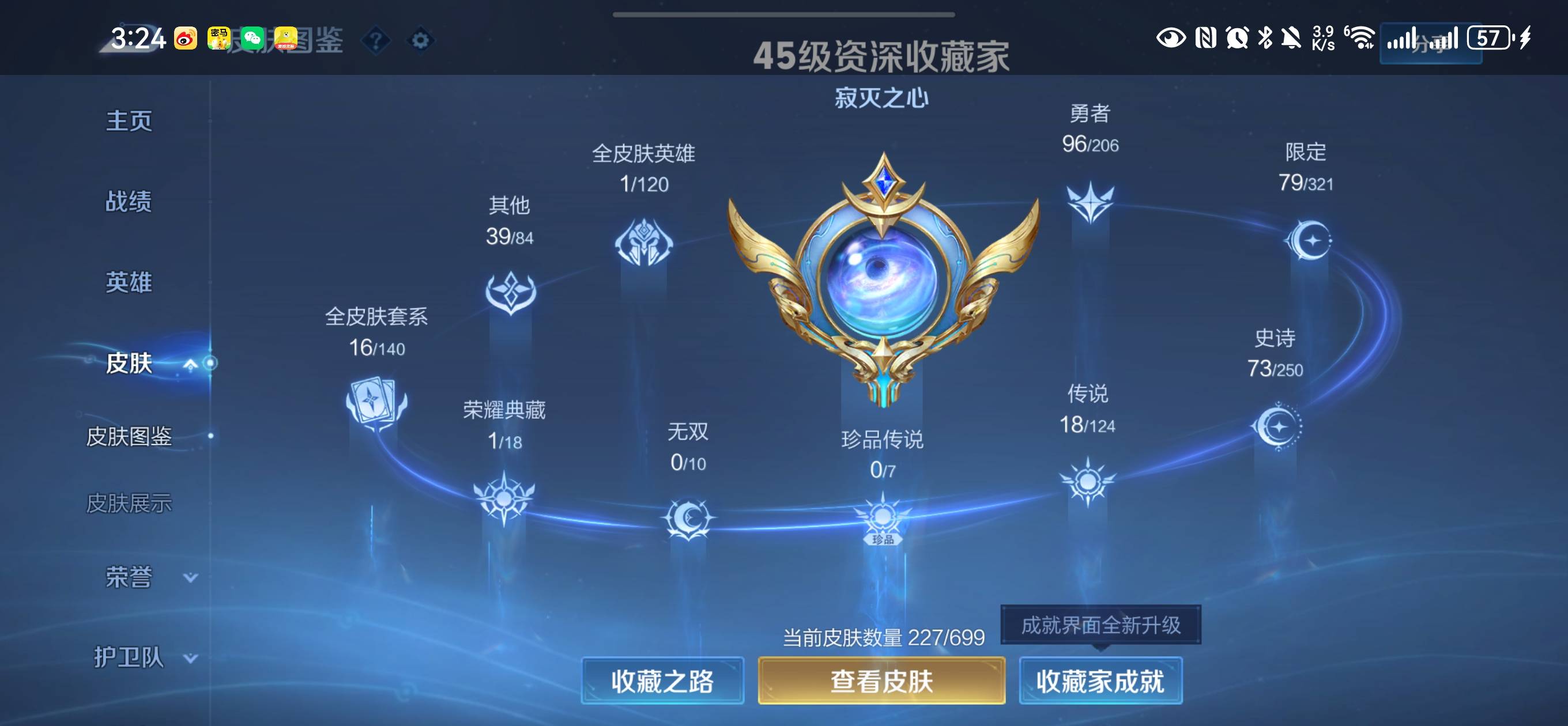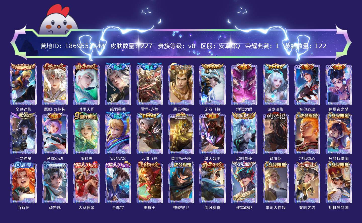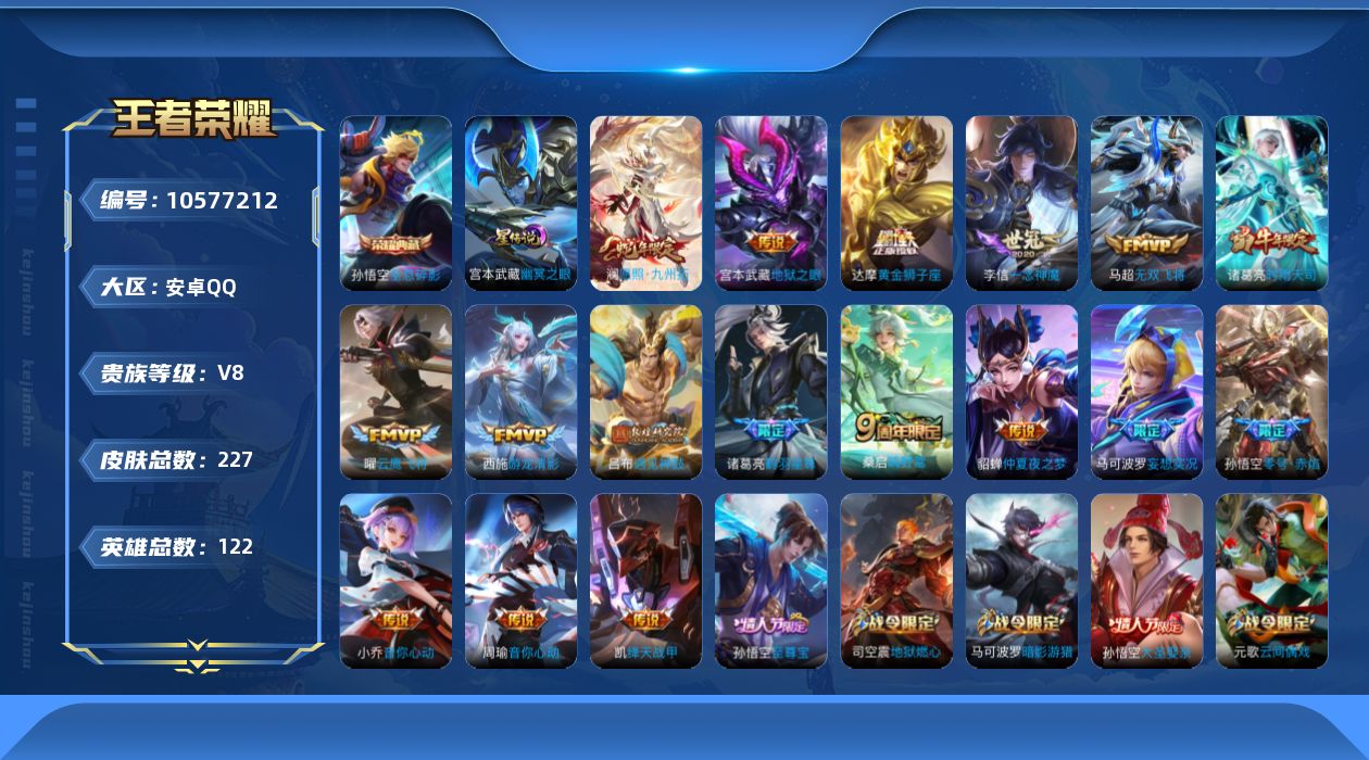 贵族等级:v8皮肤数:227传说品质18 生肖限定5 情人节限定2 荣耀典藏1 英雄数:122