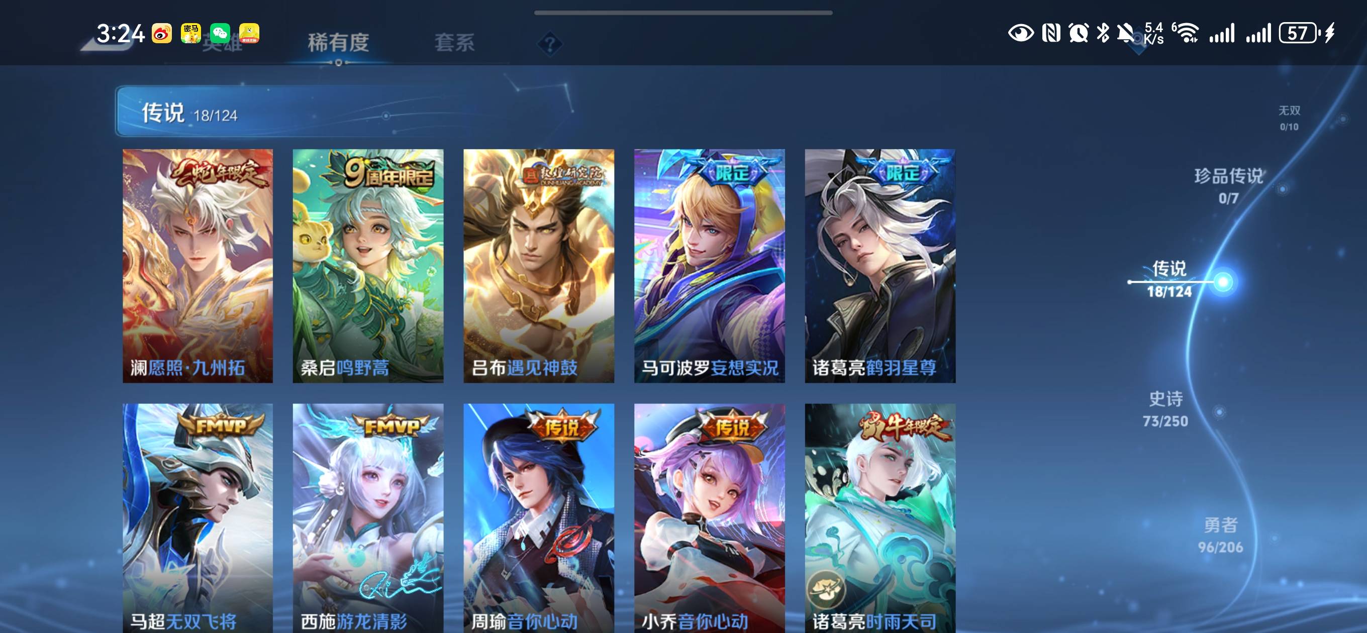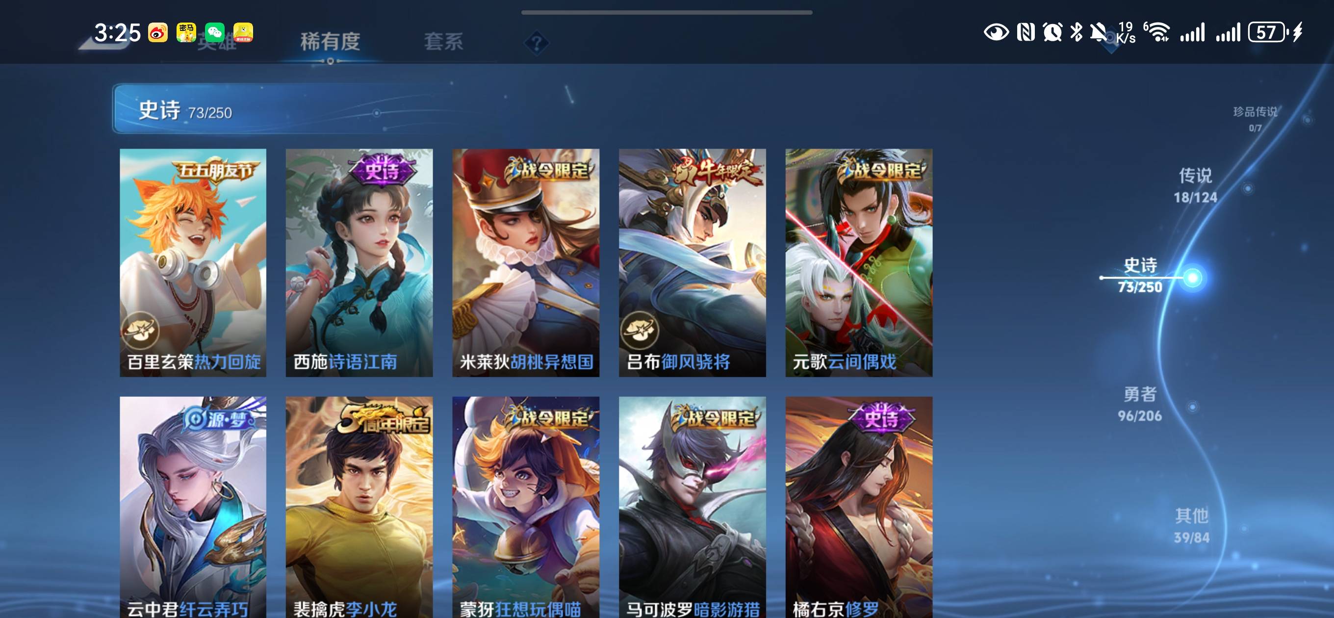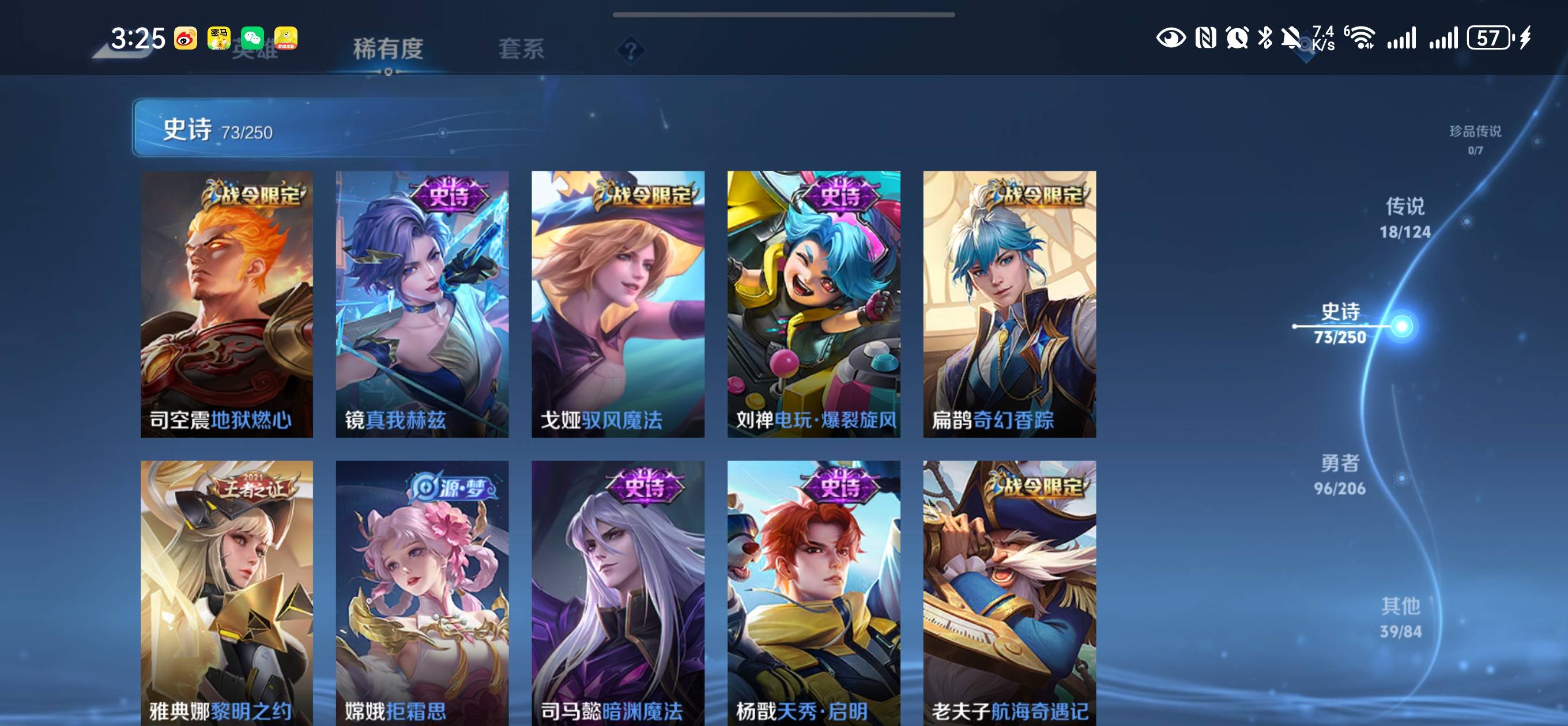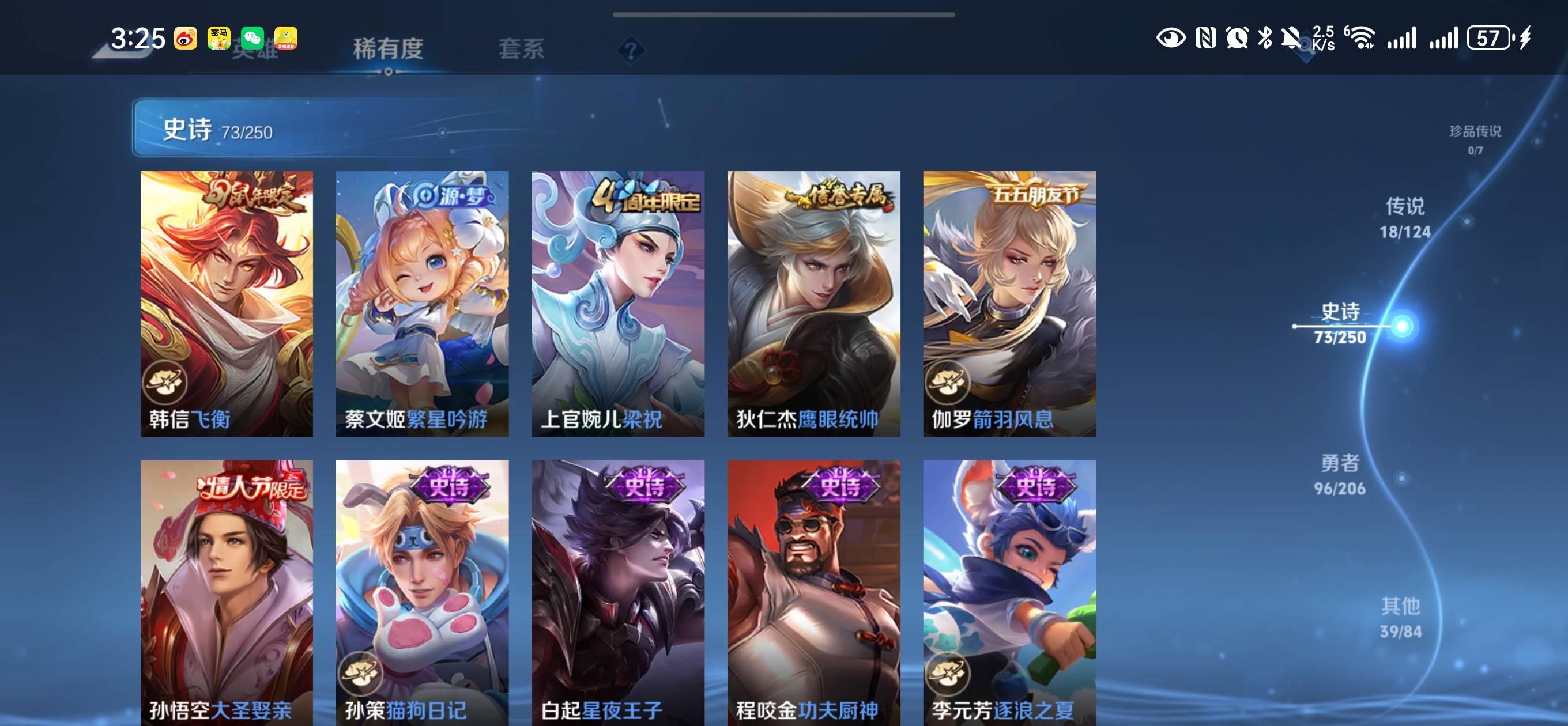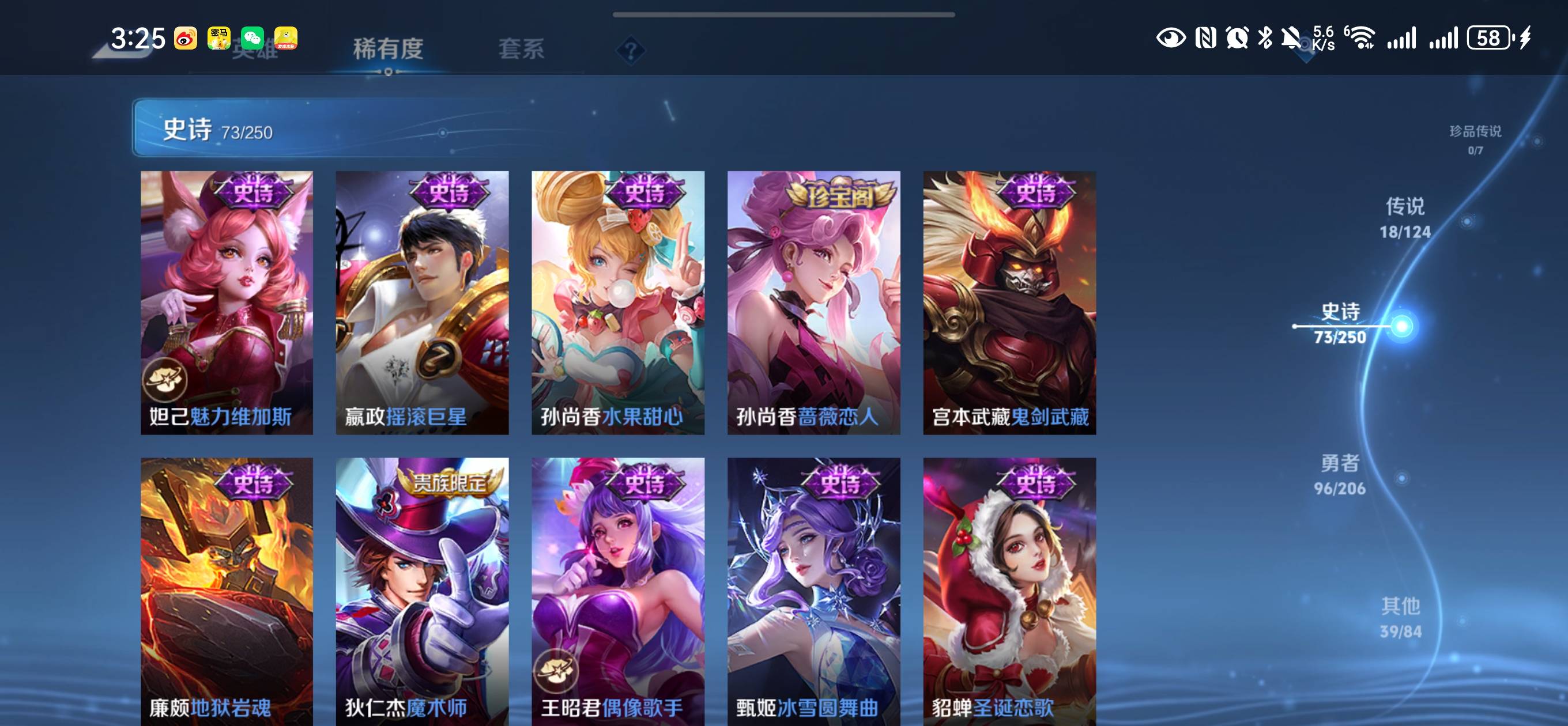 贵族等级:v8皮肤数:227传说品质18 生肖限定5 情人节限定2 荣耀典藏1 英雄数:122