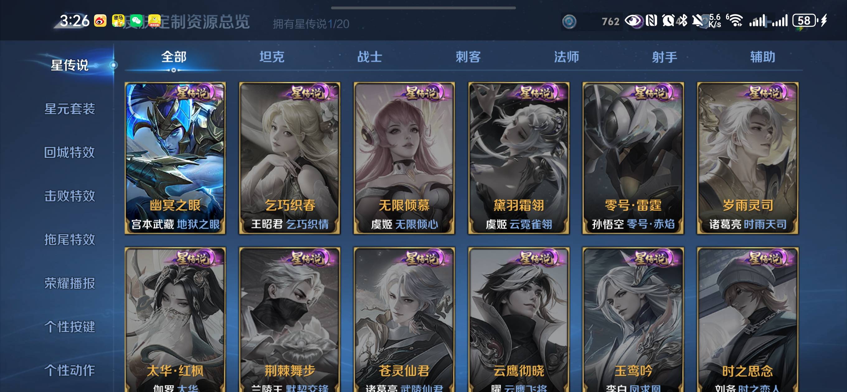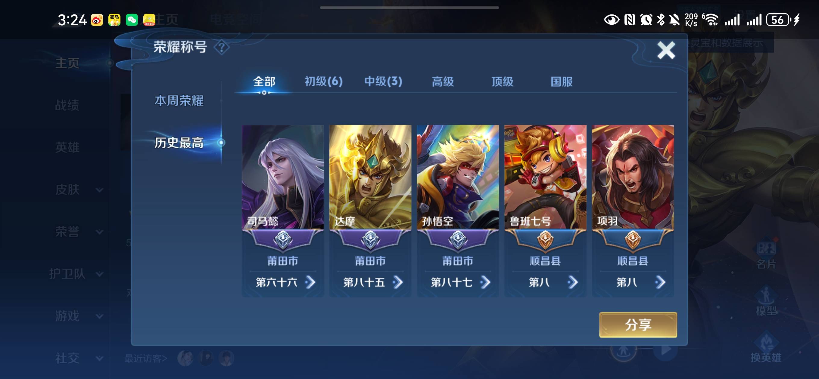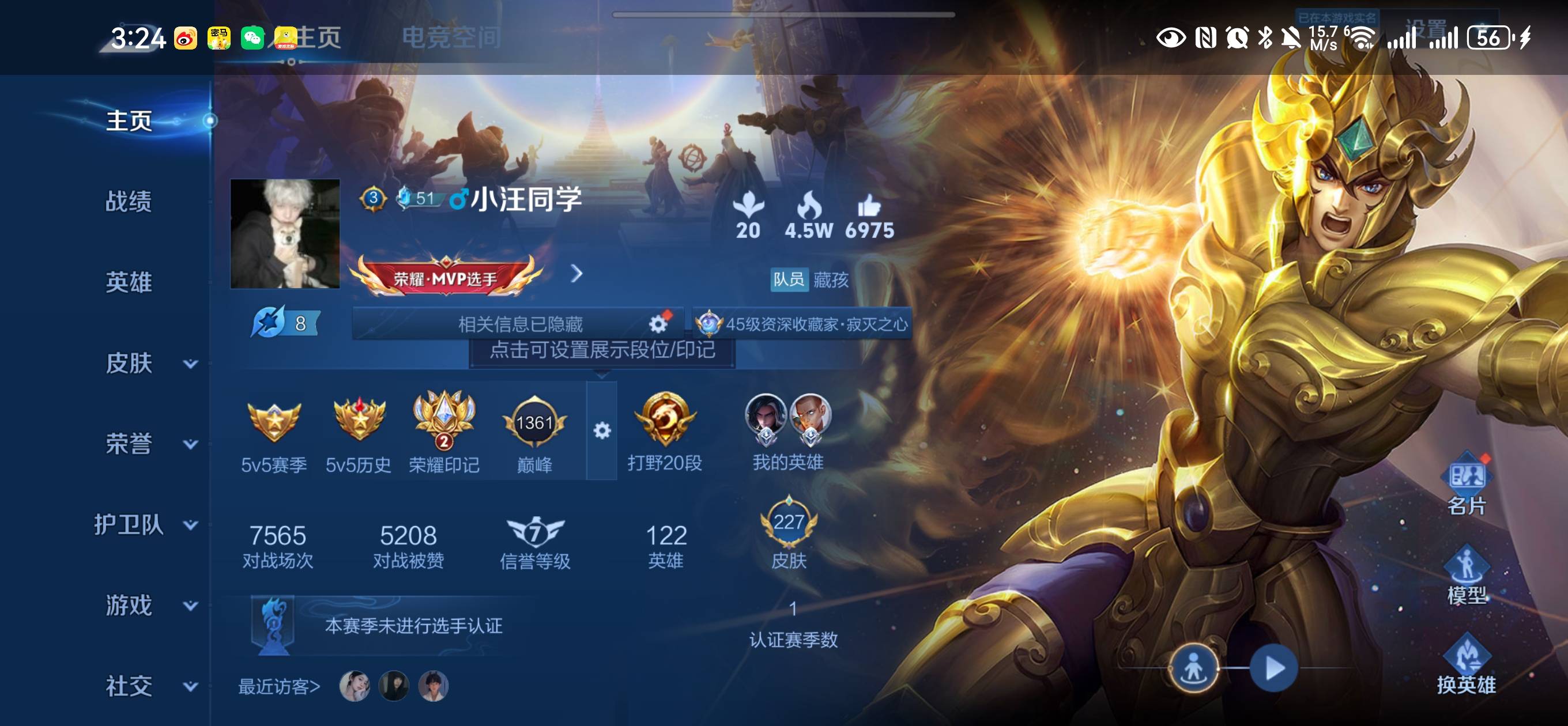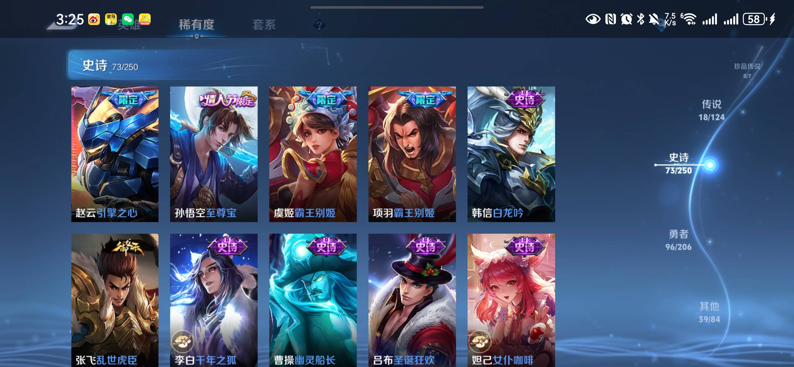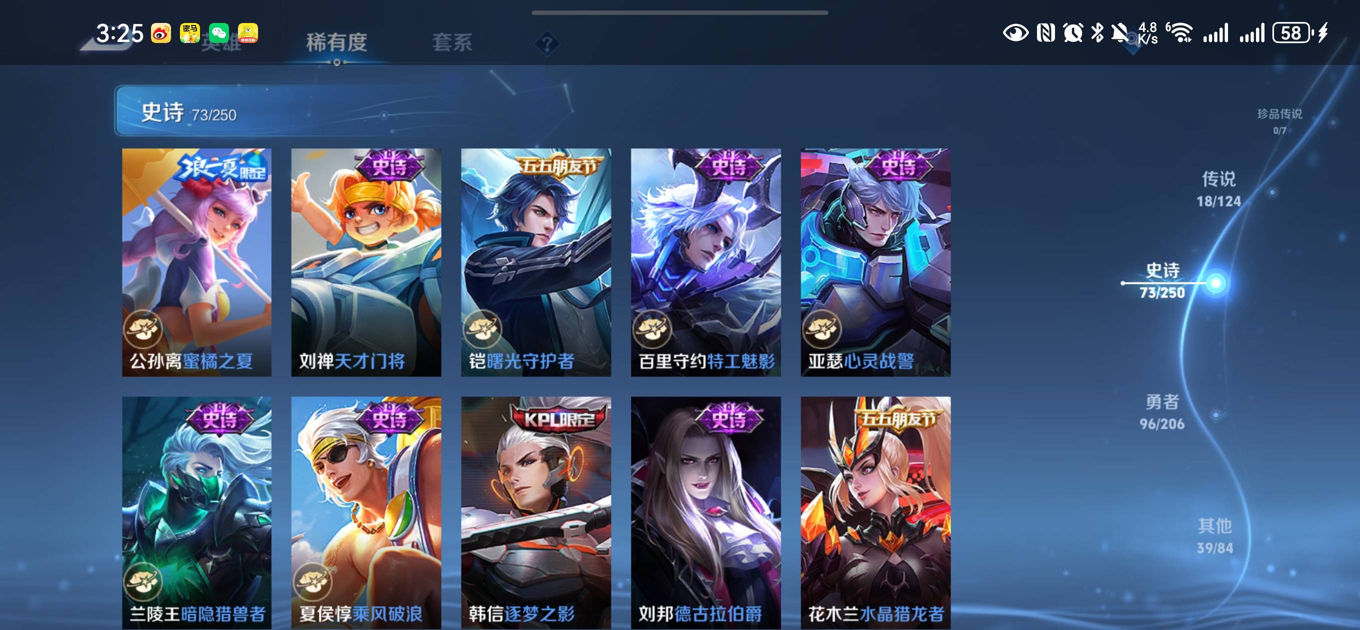 贵族等级:v8皮肤数:227传说品质18 生肖限定5 情人节限定2 荣耀典藏1 英雄数:122