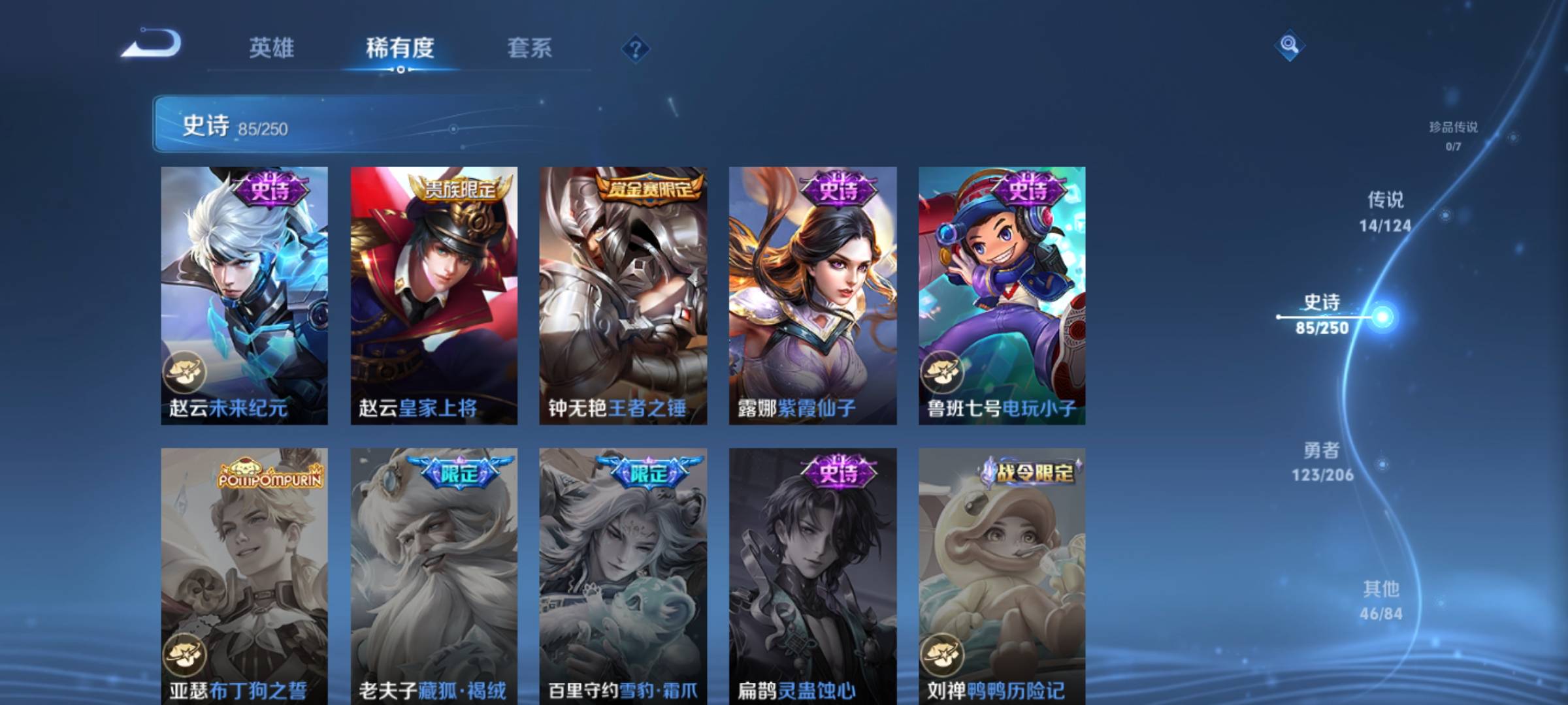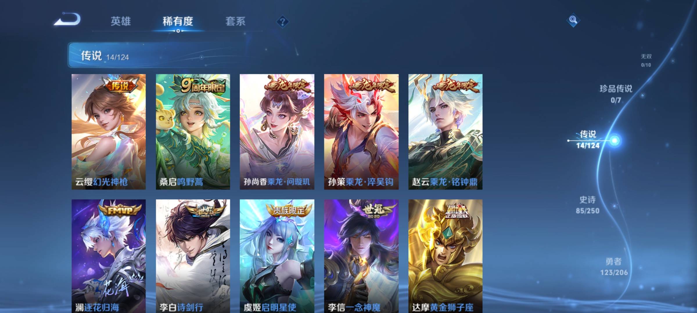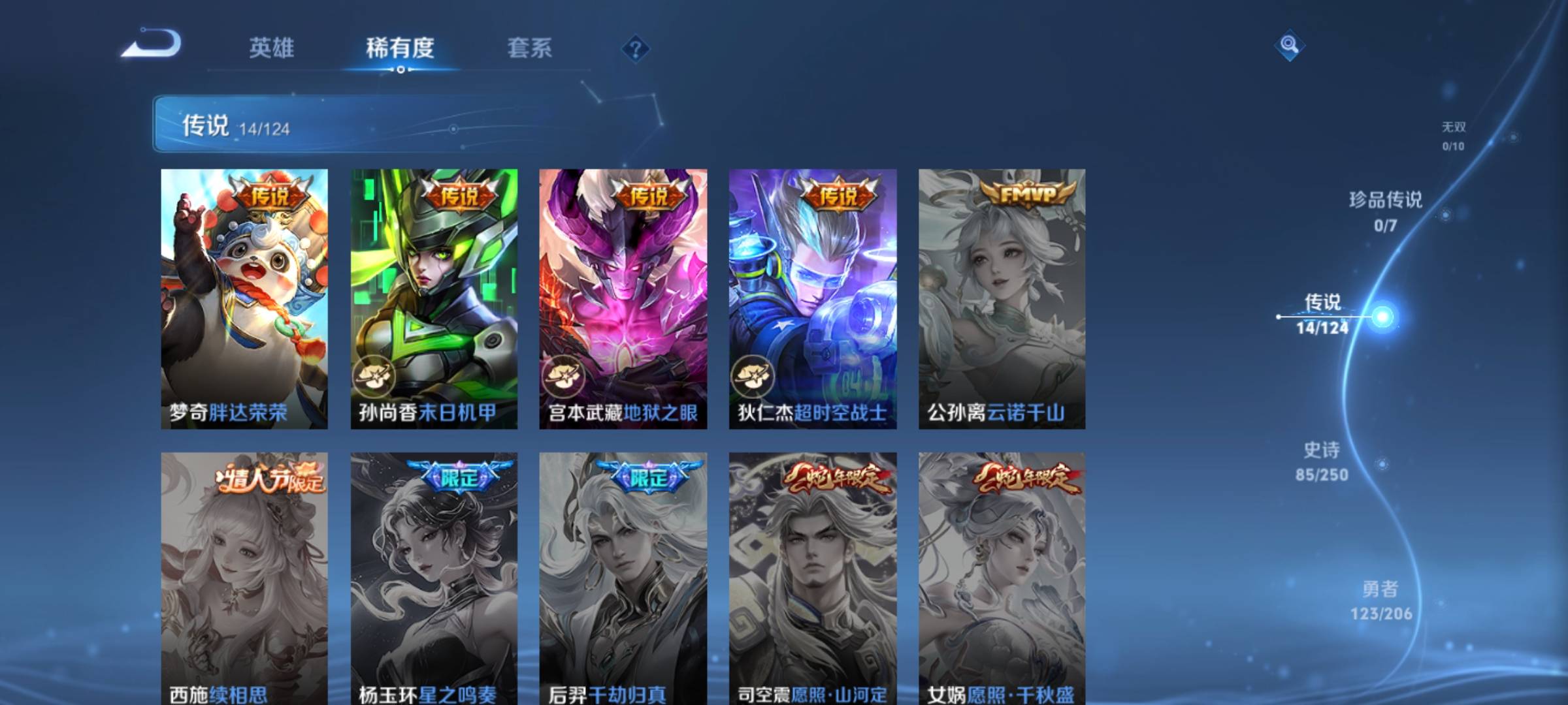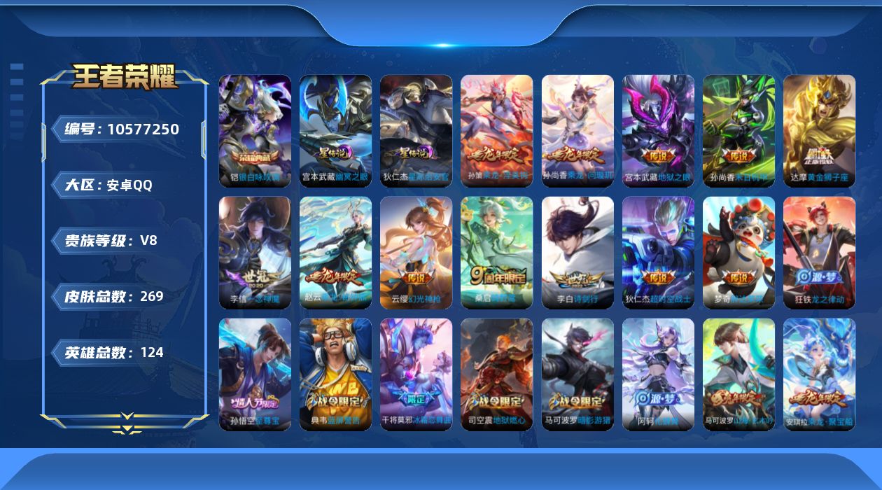贵族等级:v8皮肤数:269生肖限定8 情人节限定2 传说品质14 荣耀典藏1 英雄数:124