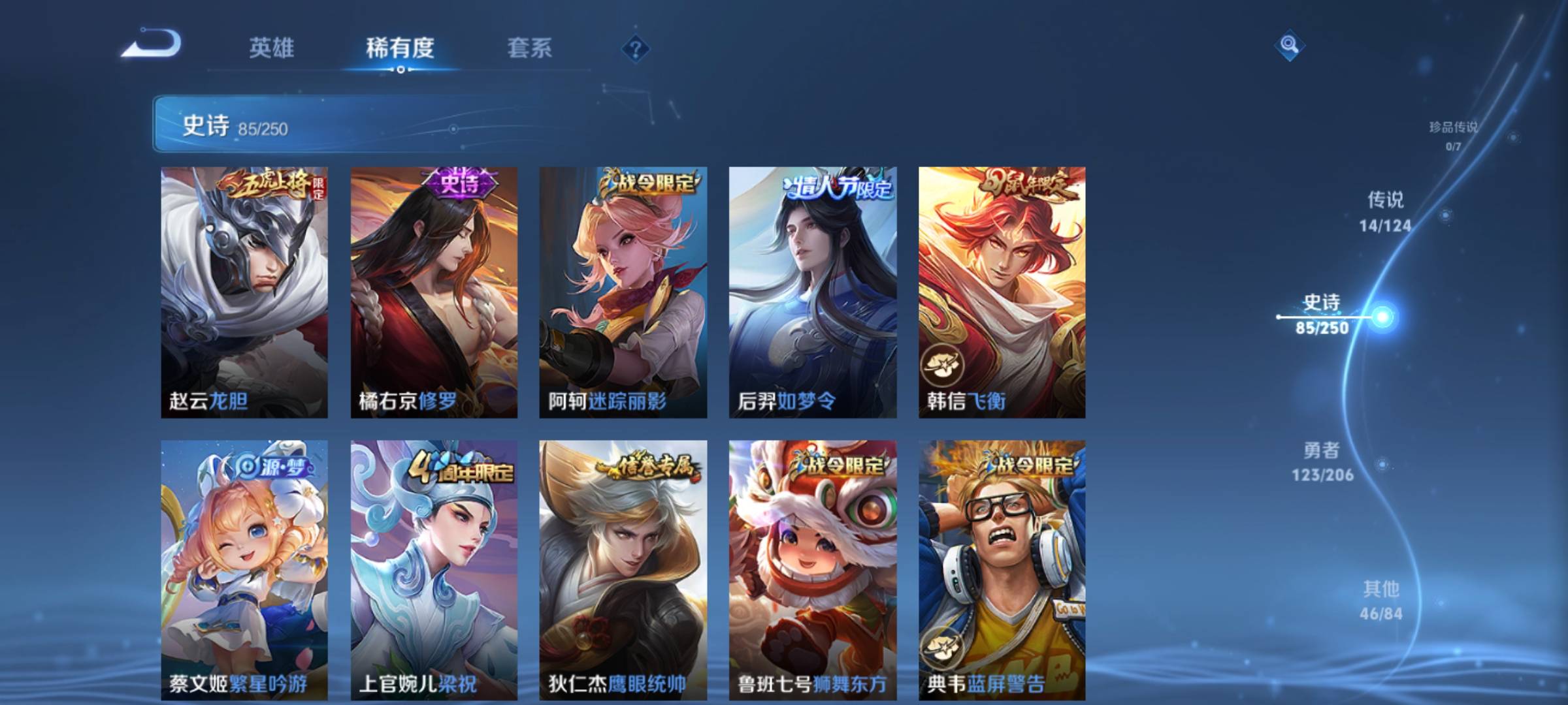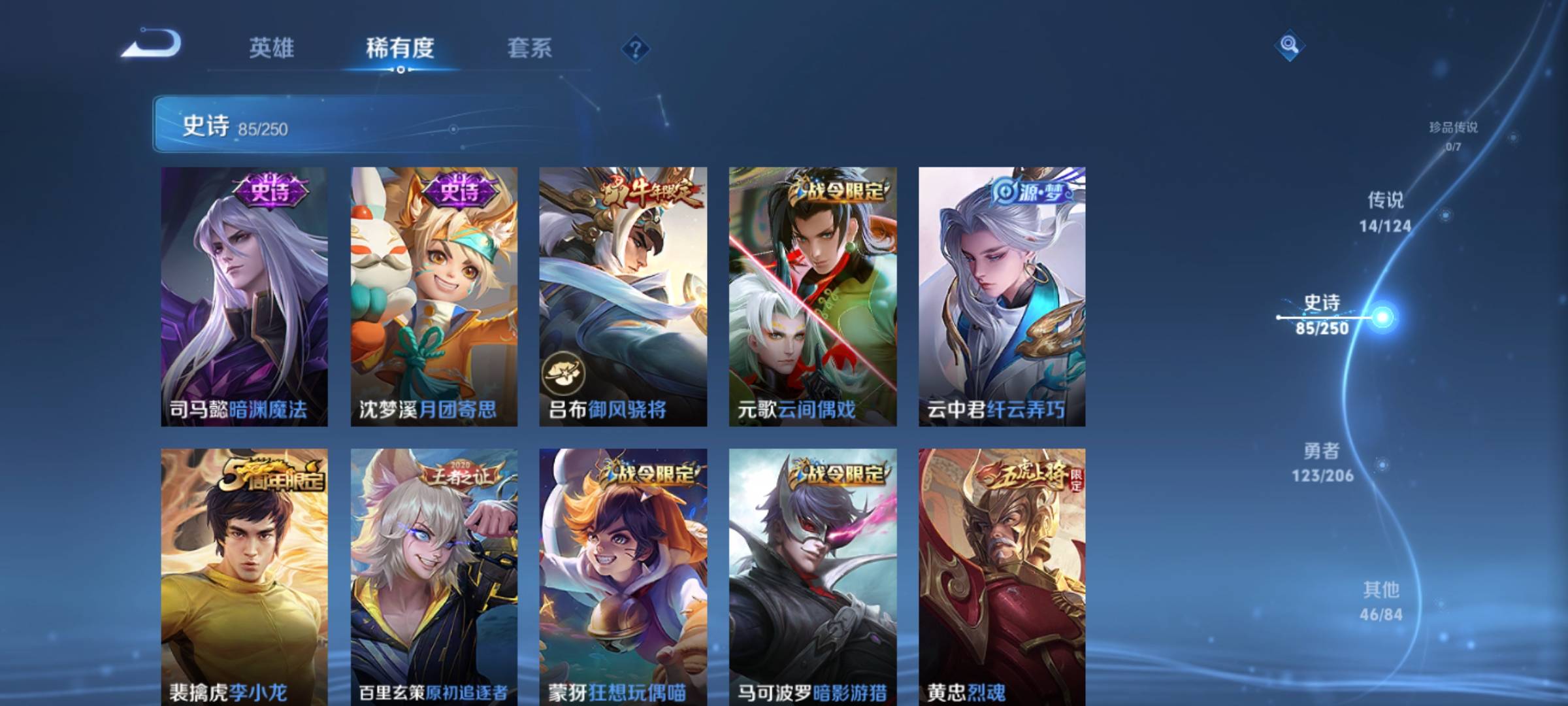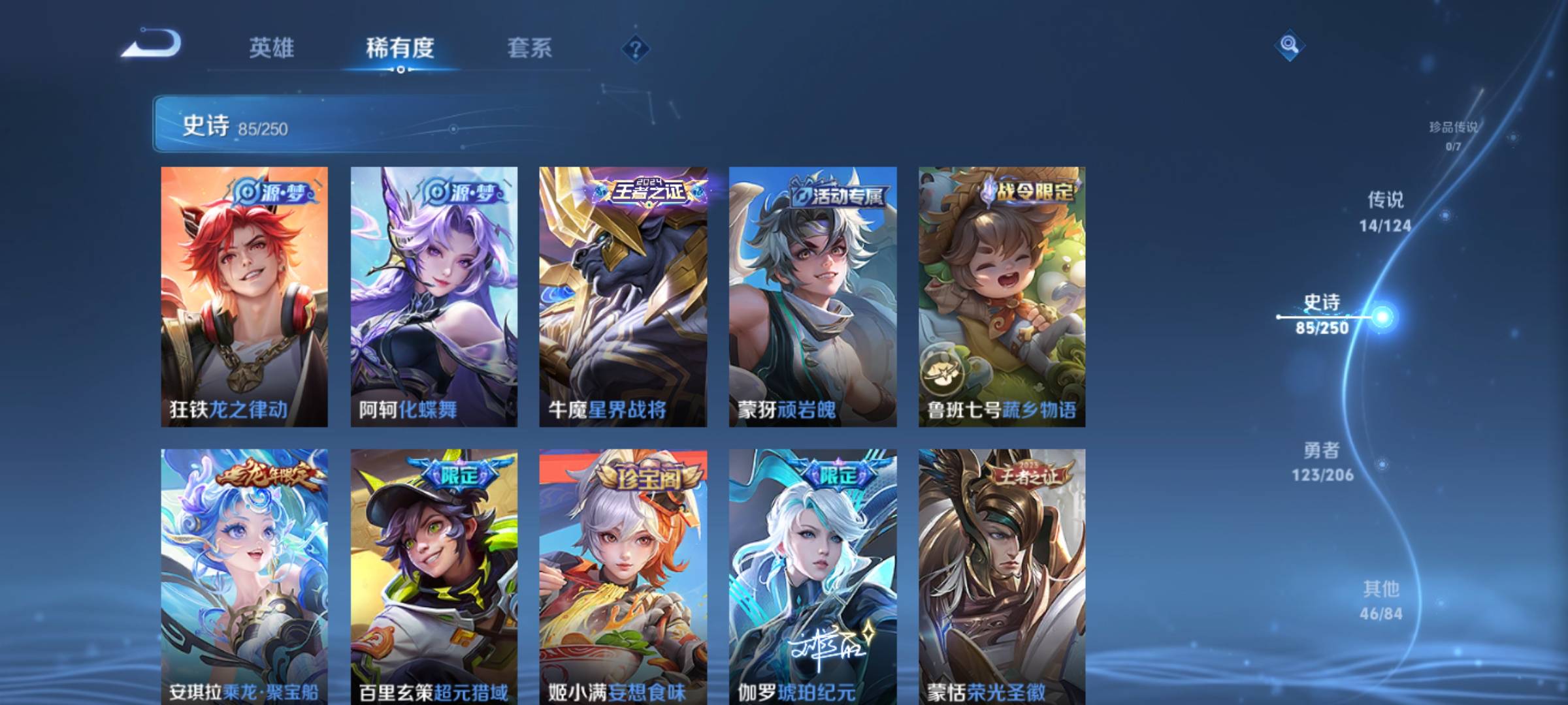 贵族等级:v8皮肤数:269生肖限定8 情人节限定2 传说品质14 荣耀典藏1 英雄数:124