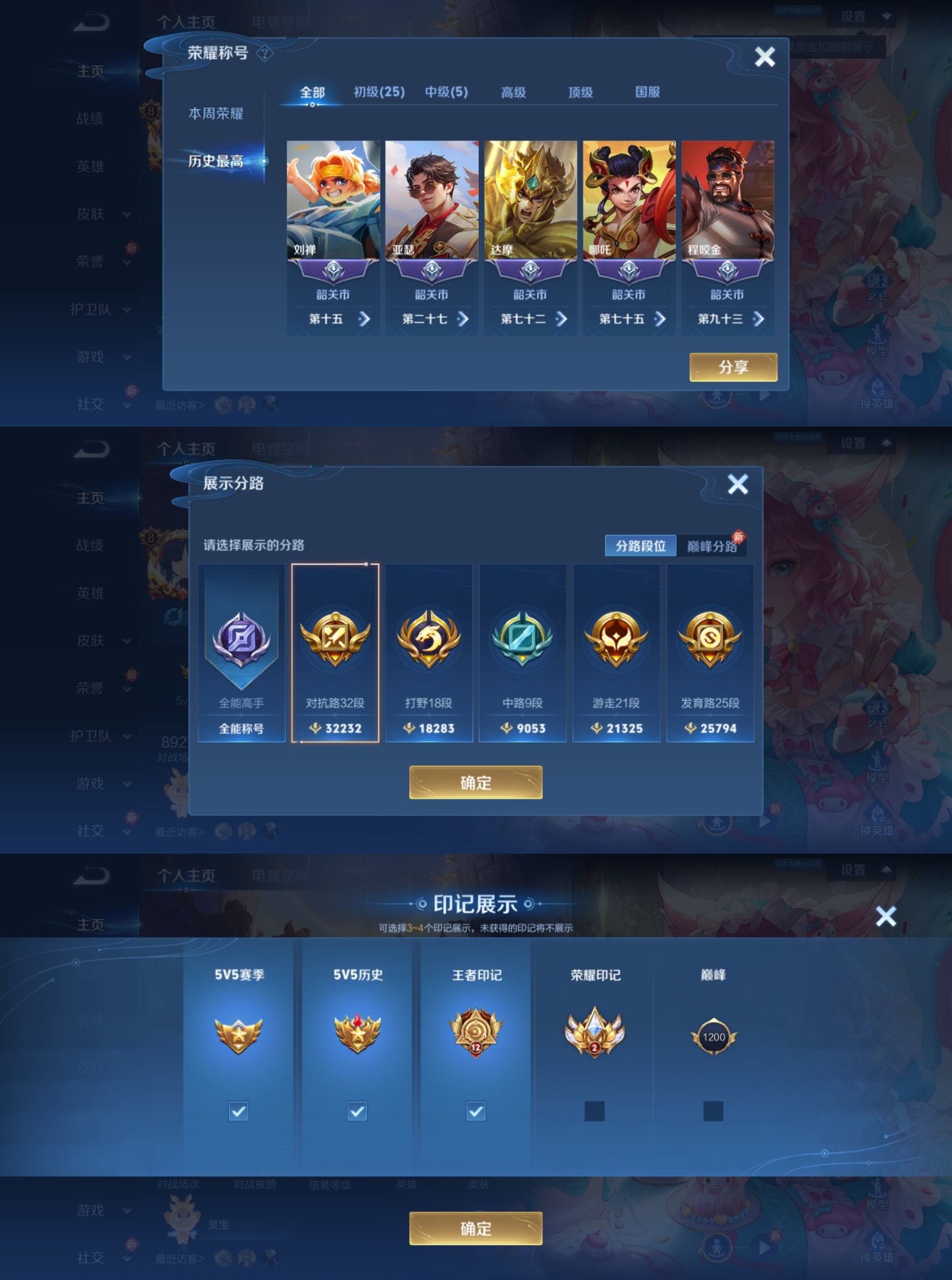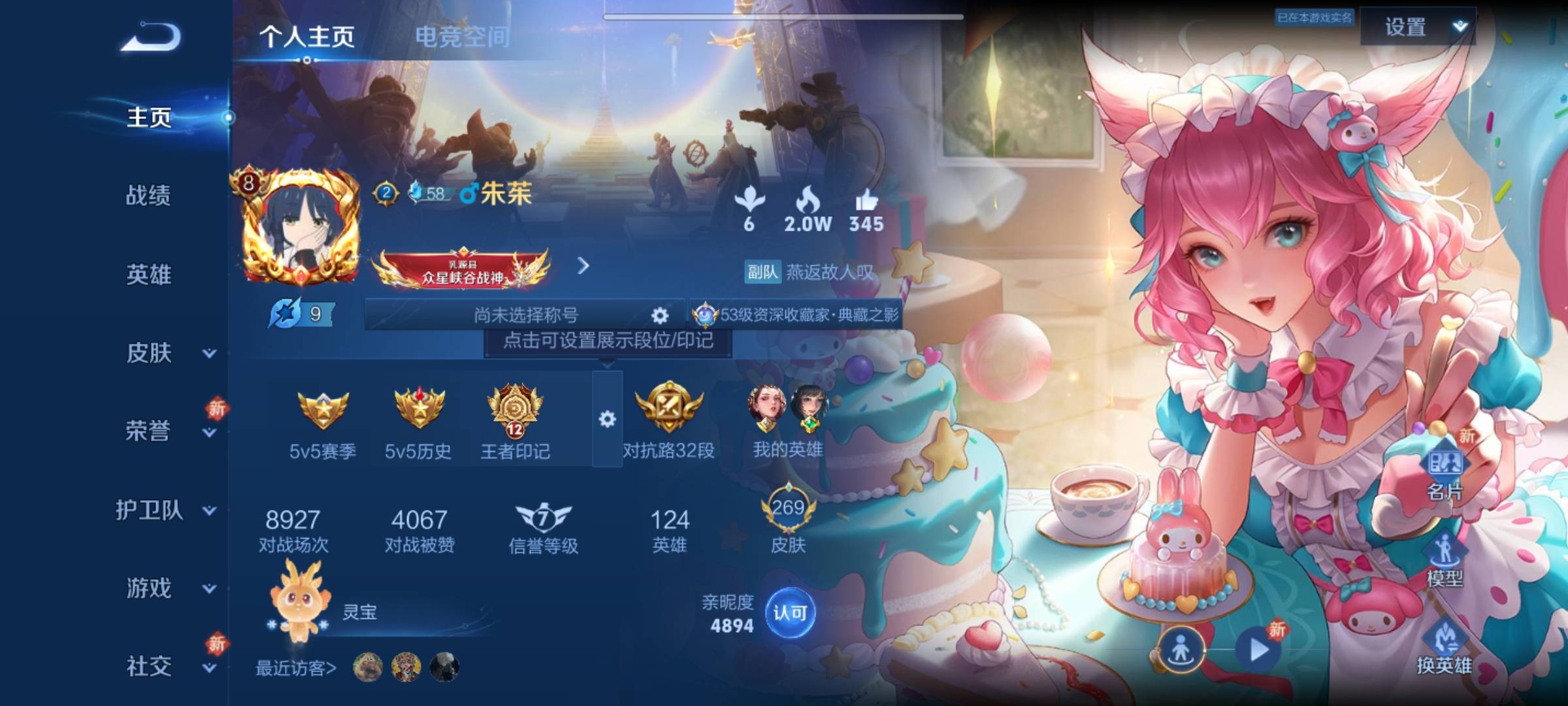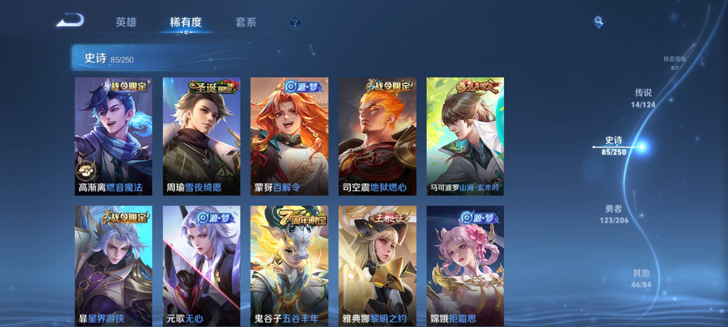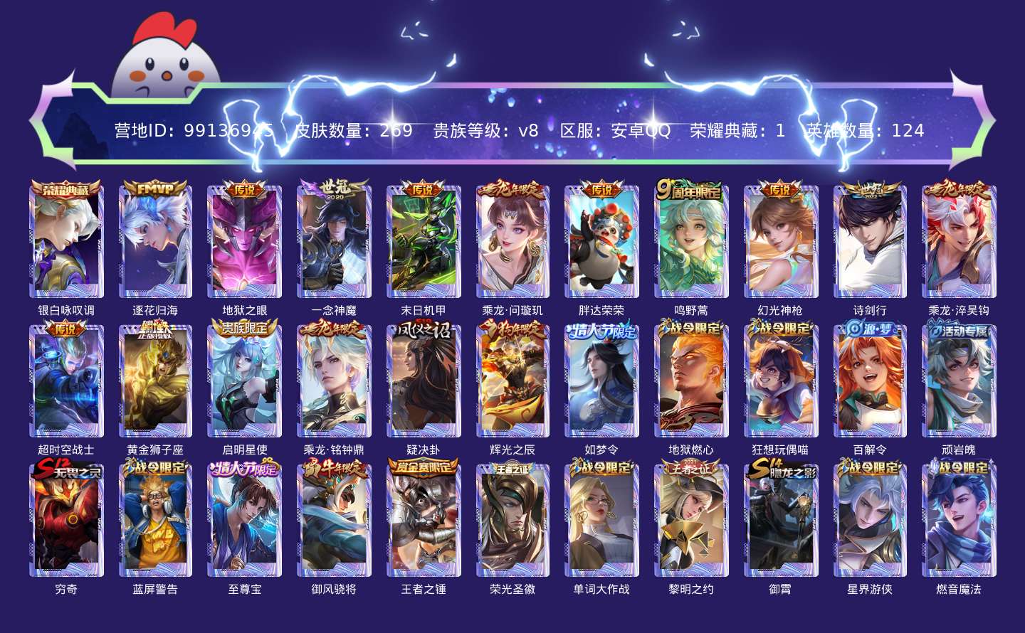 贵族等级:v8皮肤数:269生肖限定8 情人节限定2 传说品质14 荣耀典藏1 英雄数:124