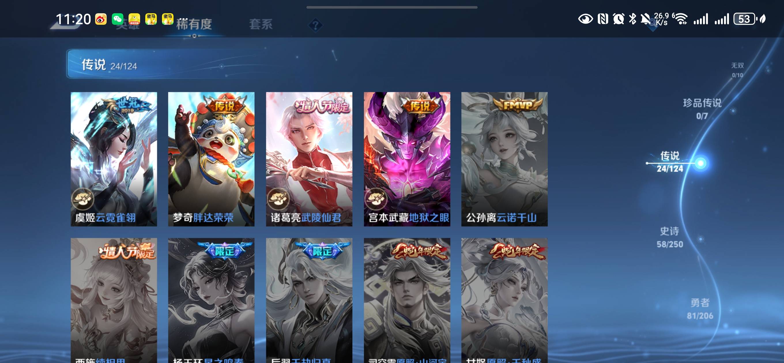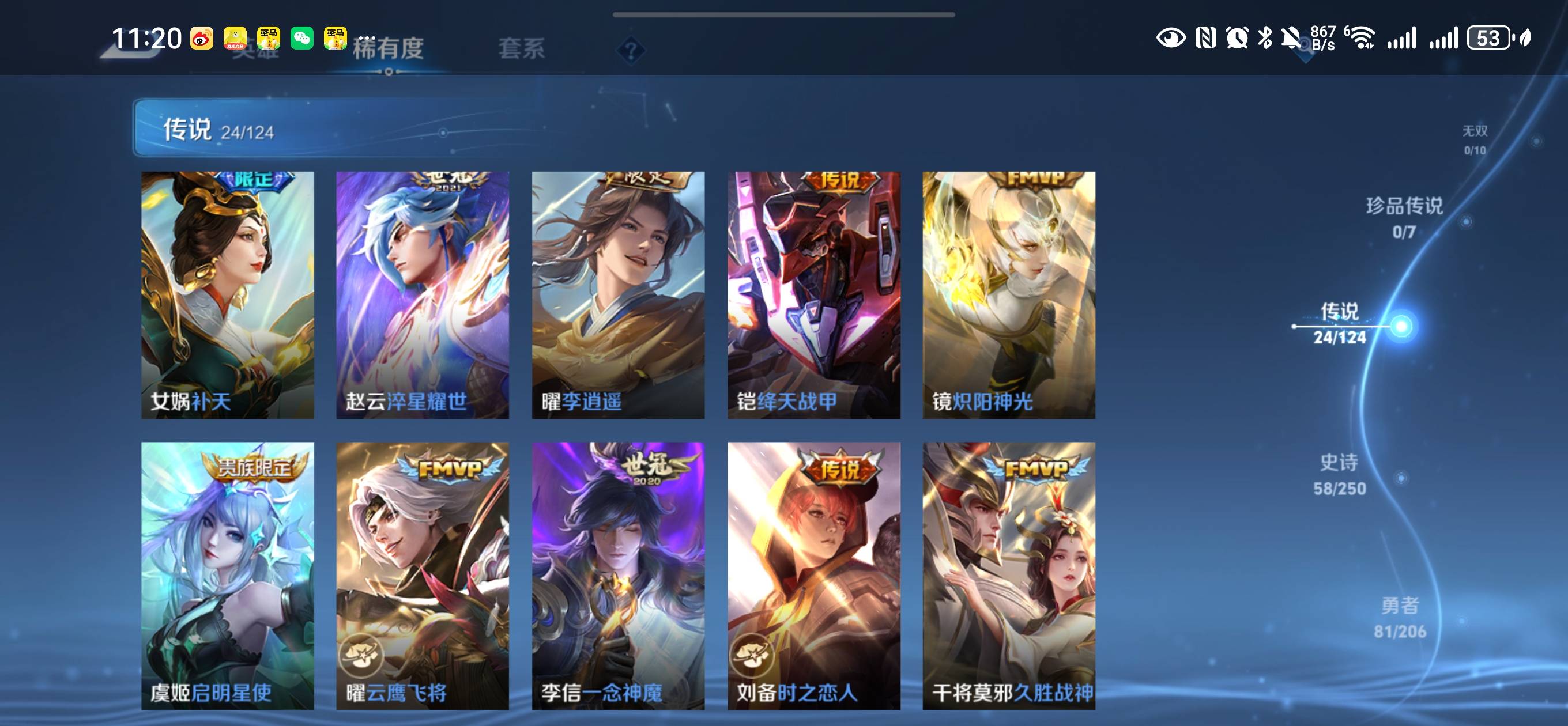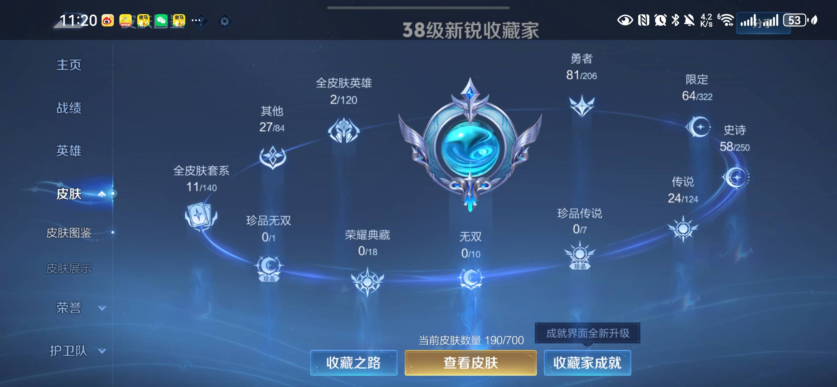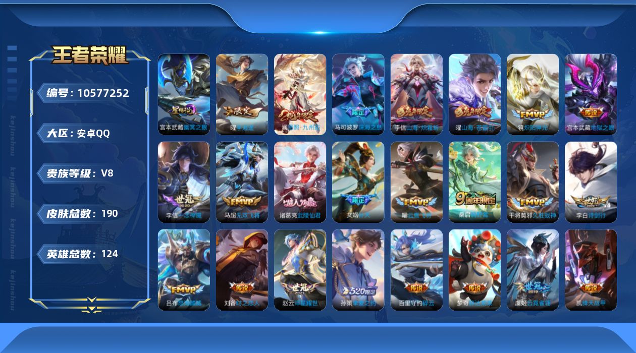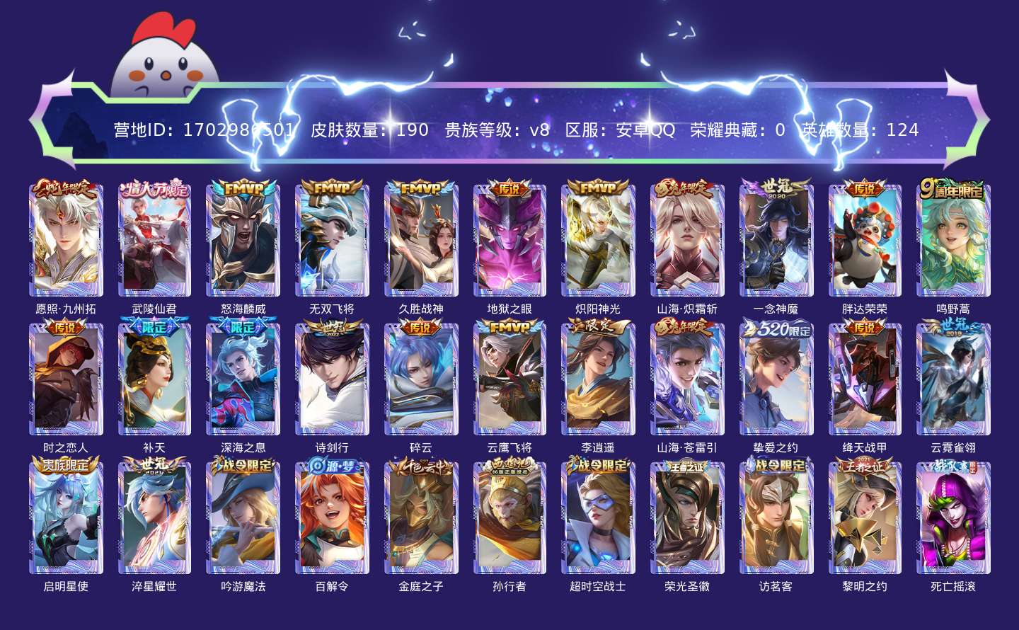 贵族等级:v8皮肤数:190传说品质24 生肖限定5 情人节限定1 英雄数:124