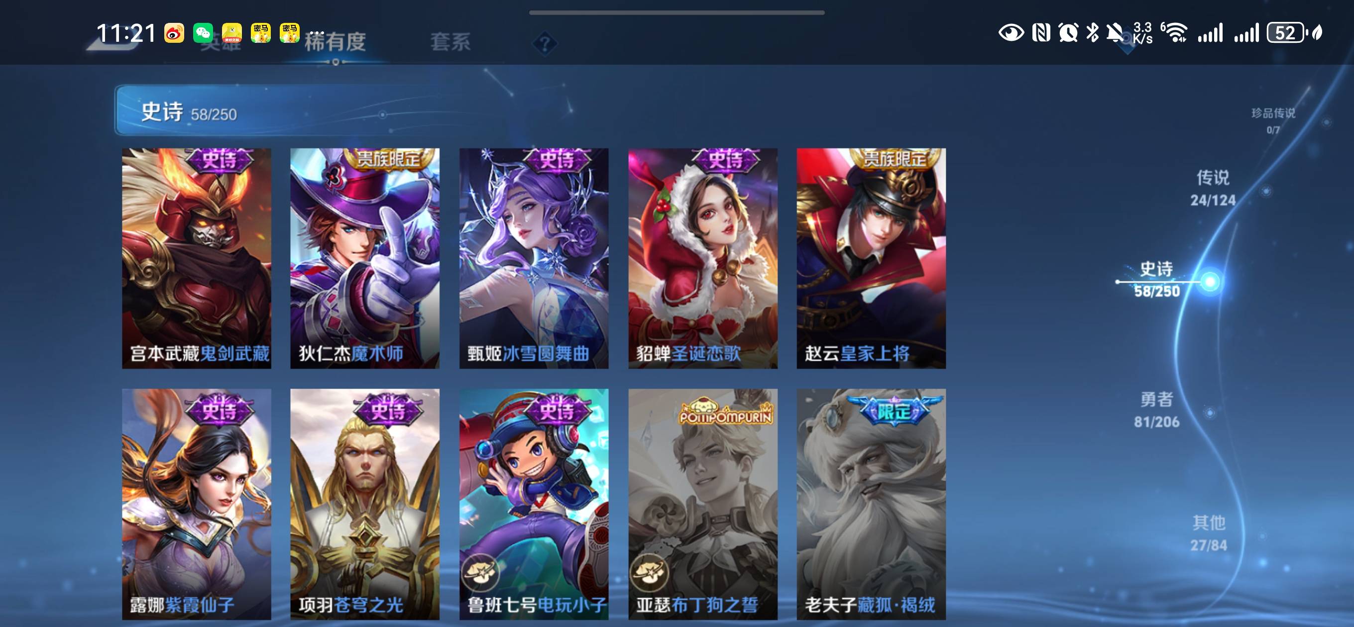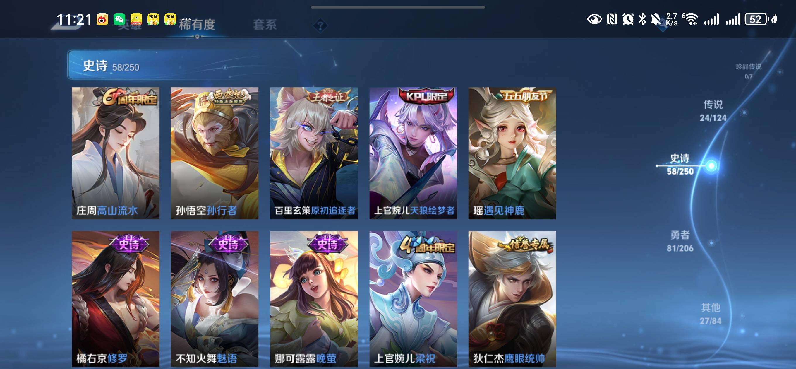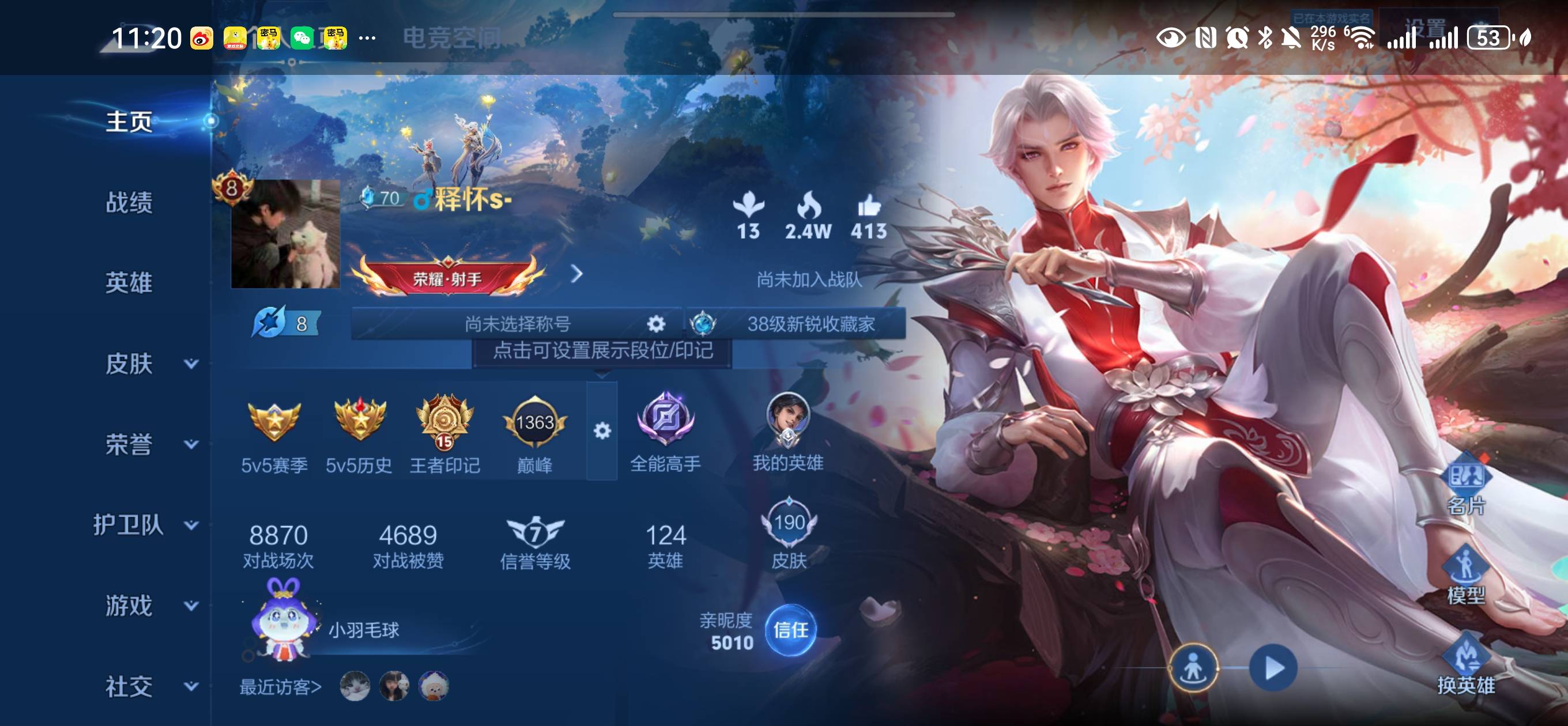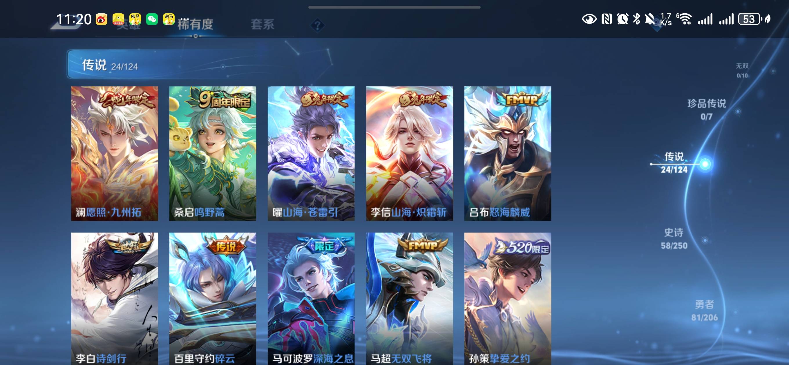 贵族等级:v8皮肤数:190传说品质24 生肖限定5 情人节限定1 英雄数:124