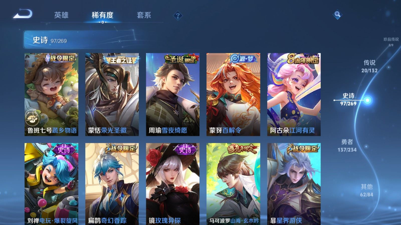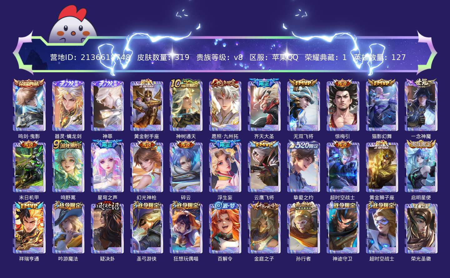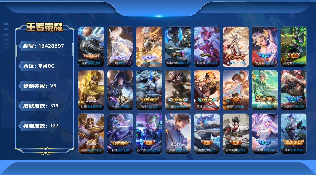 贵族等级:v8皮肤数:319传说品质20 生肖限定3 情人节限定1 荣耀典藏1 无双2 英雄数:127